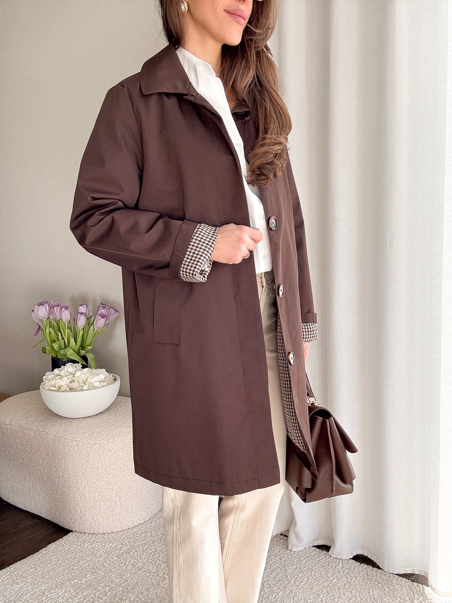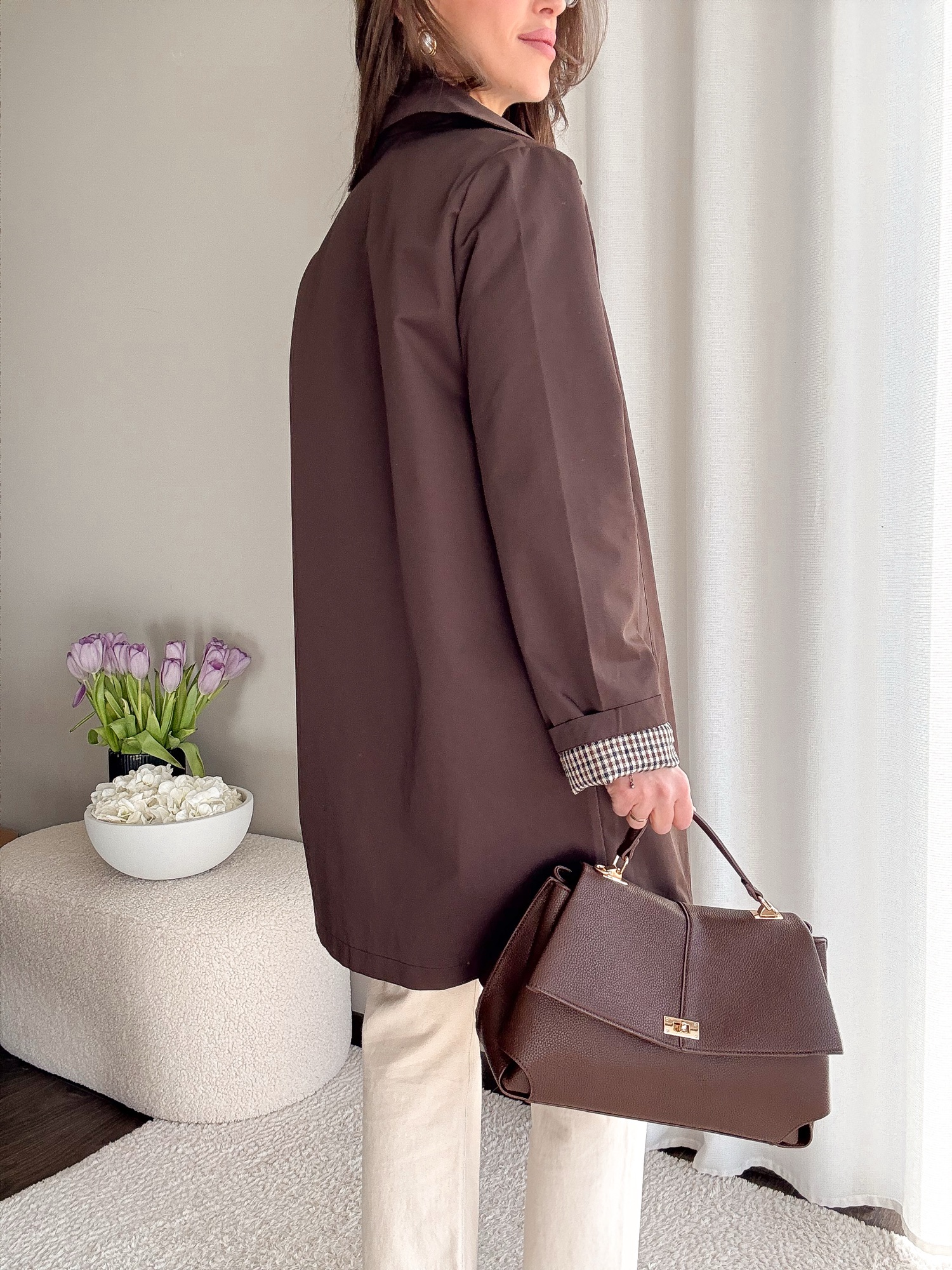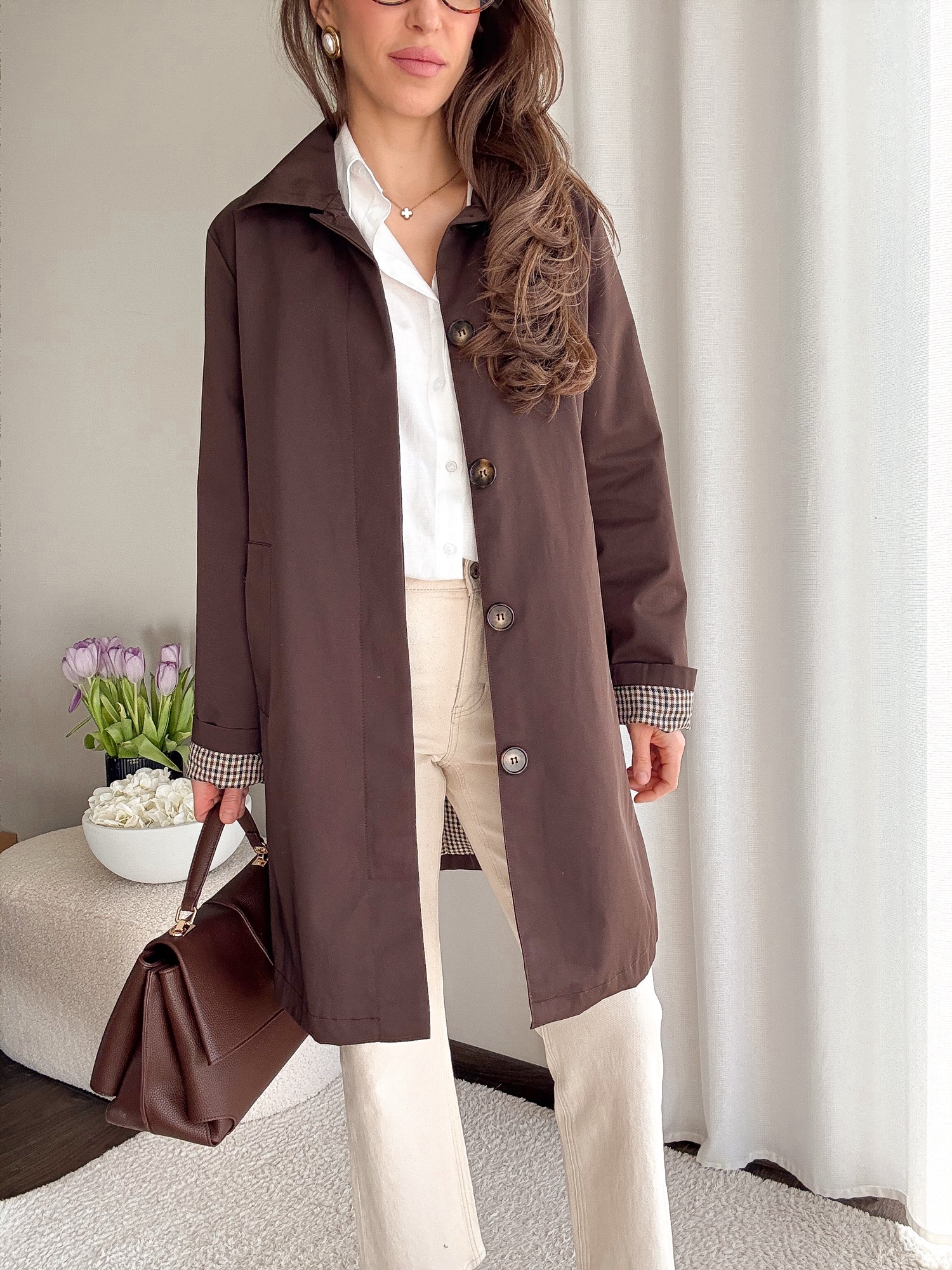 Klasyczny, krótki płaszczyk zapinany na szylkretowe guziki (schowane pod plisą).