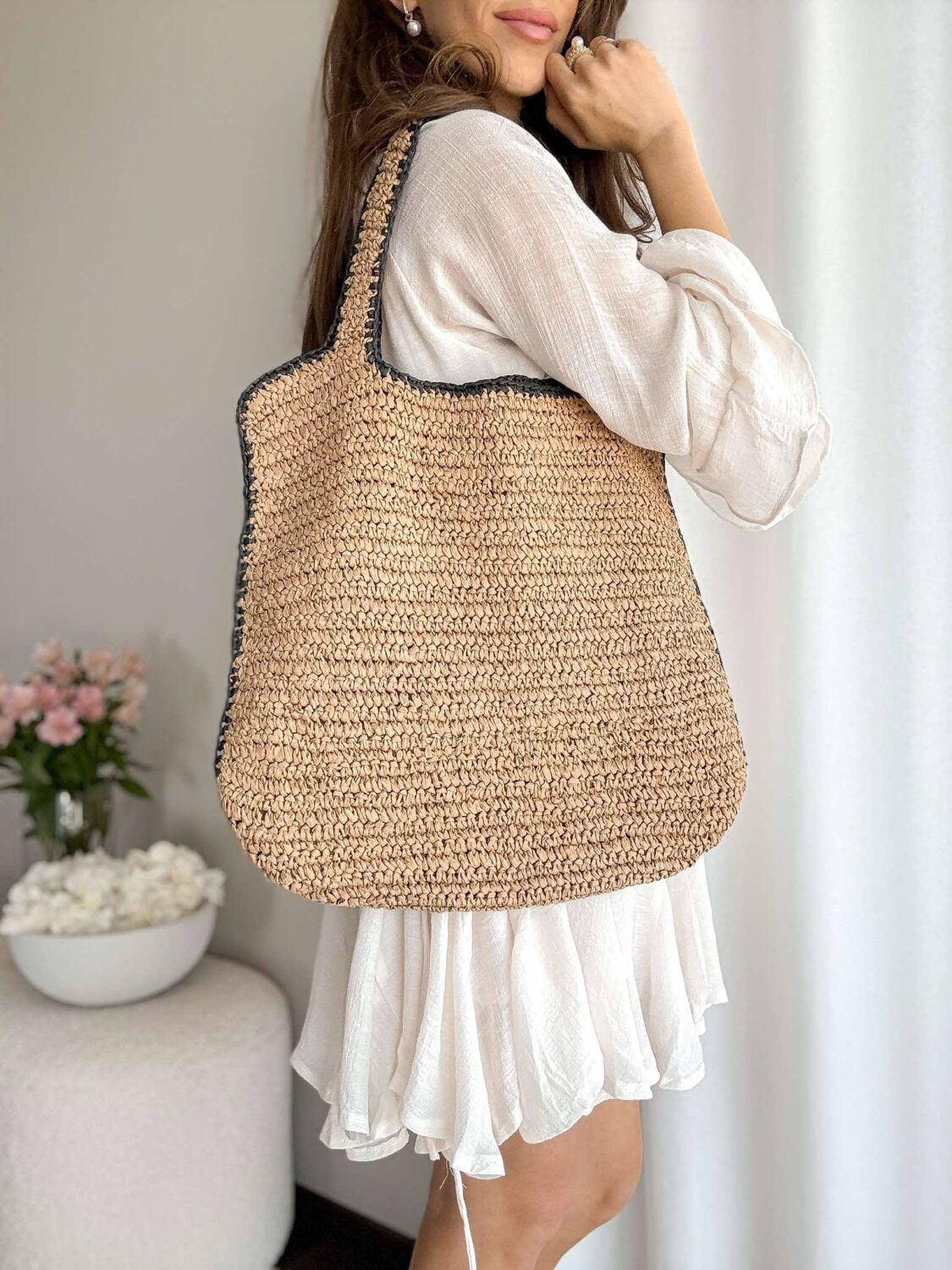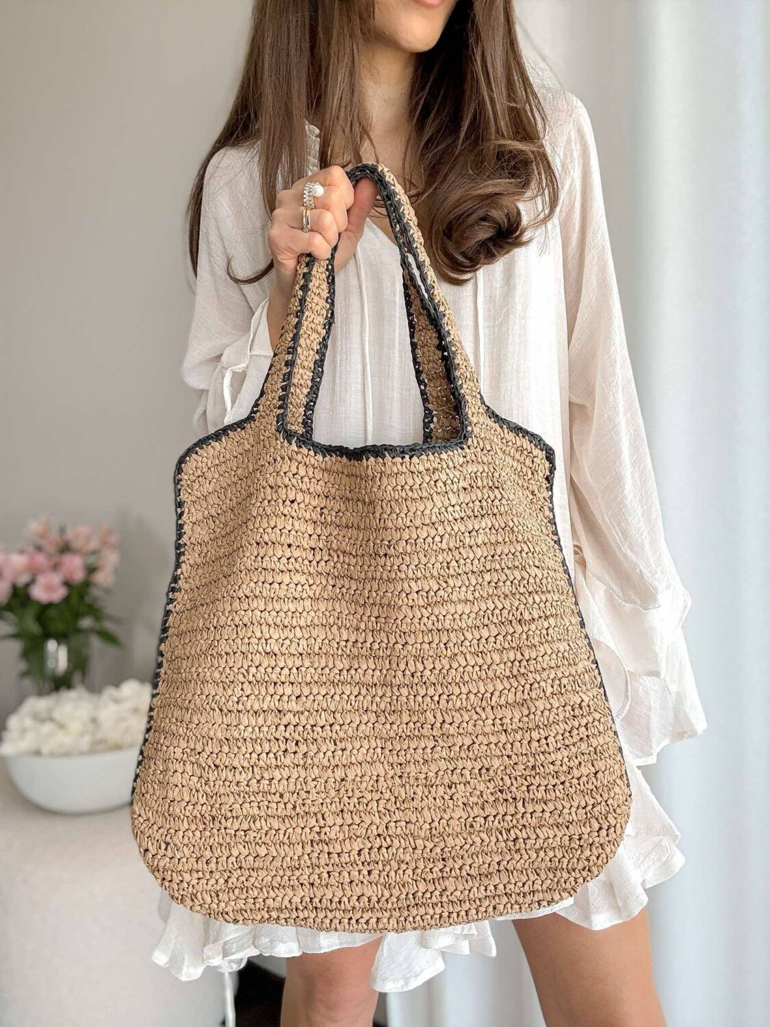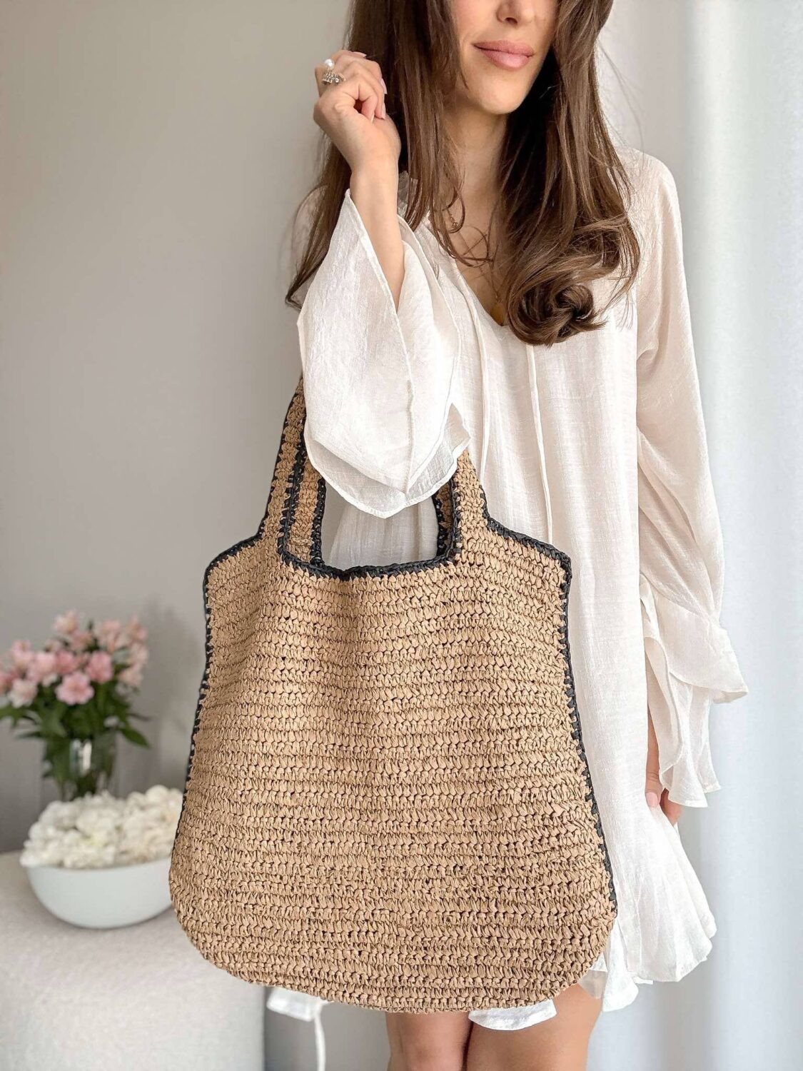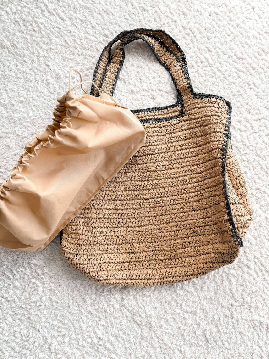 Beżowa pleciona torba z czarna lamówką.