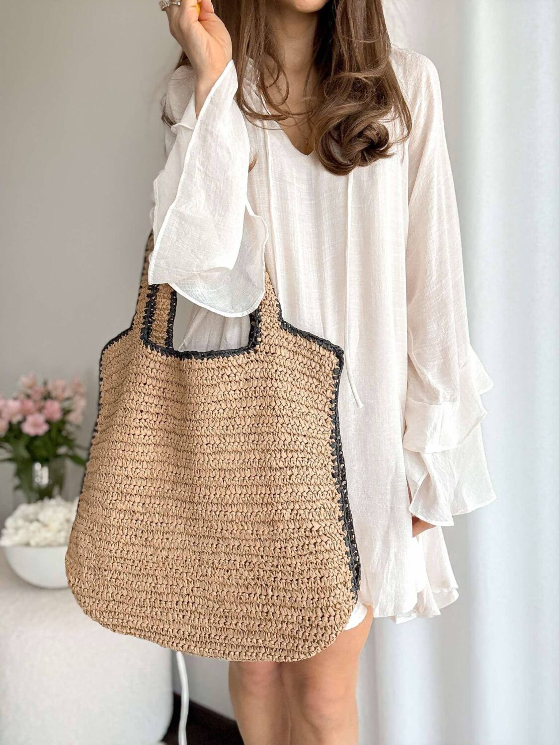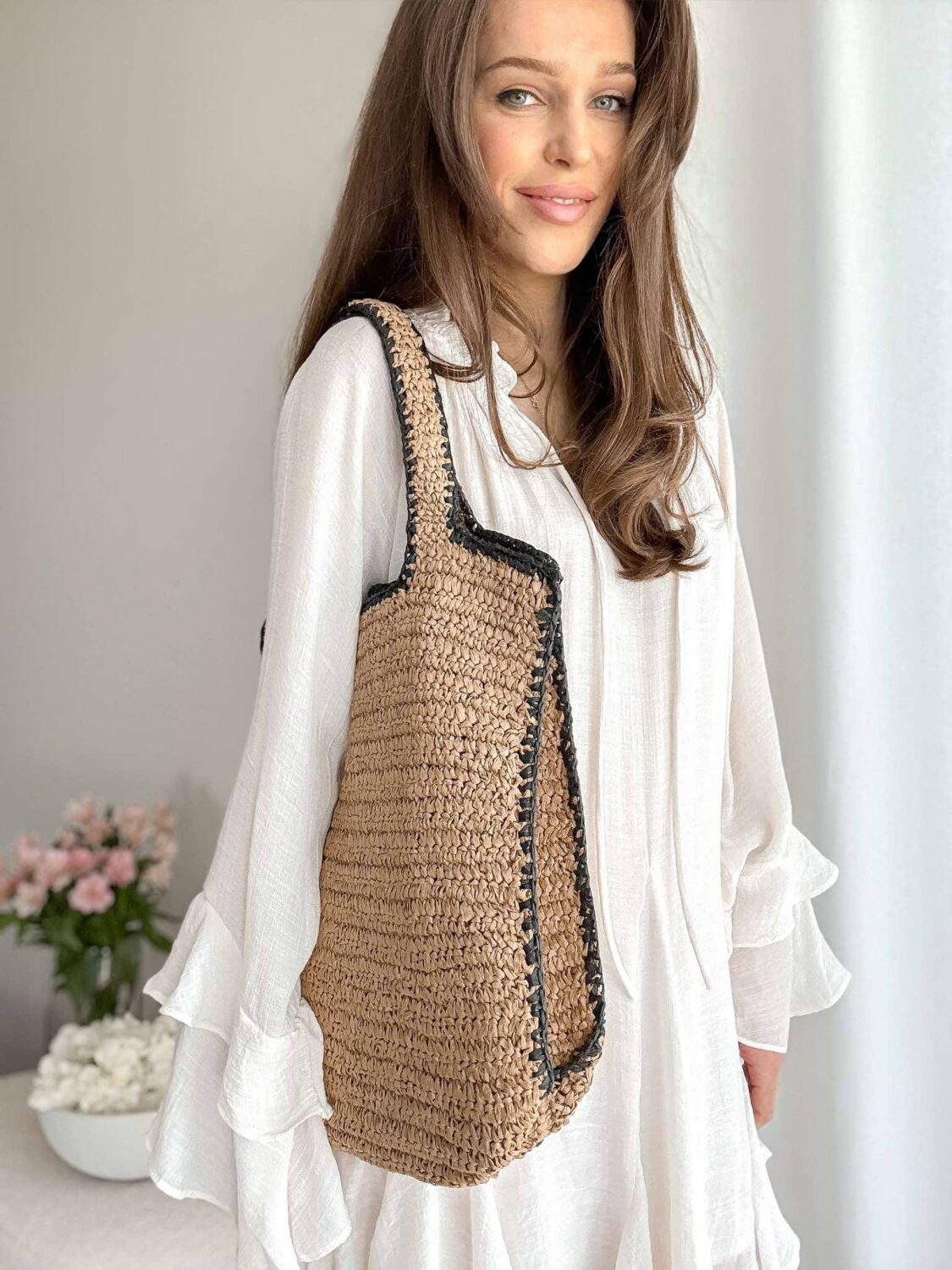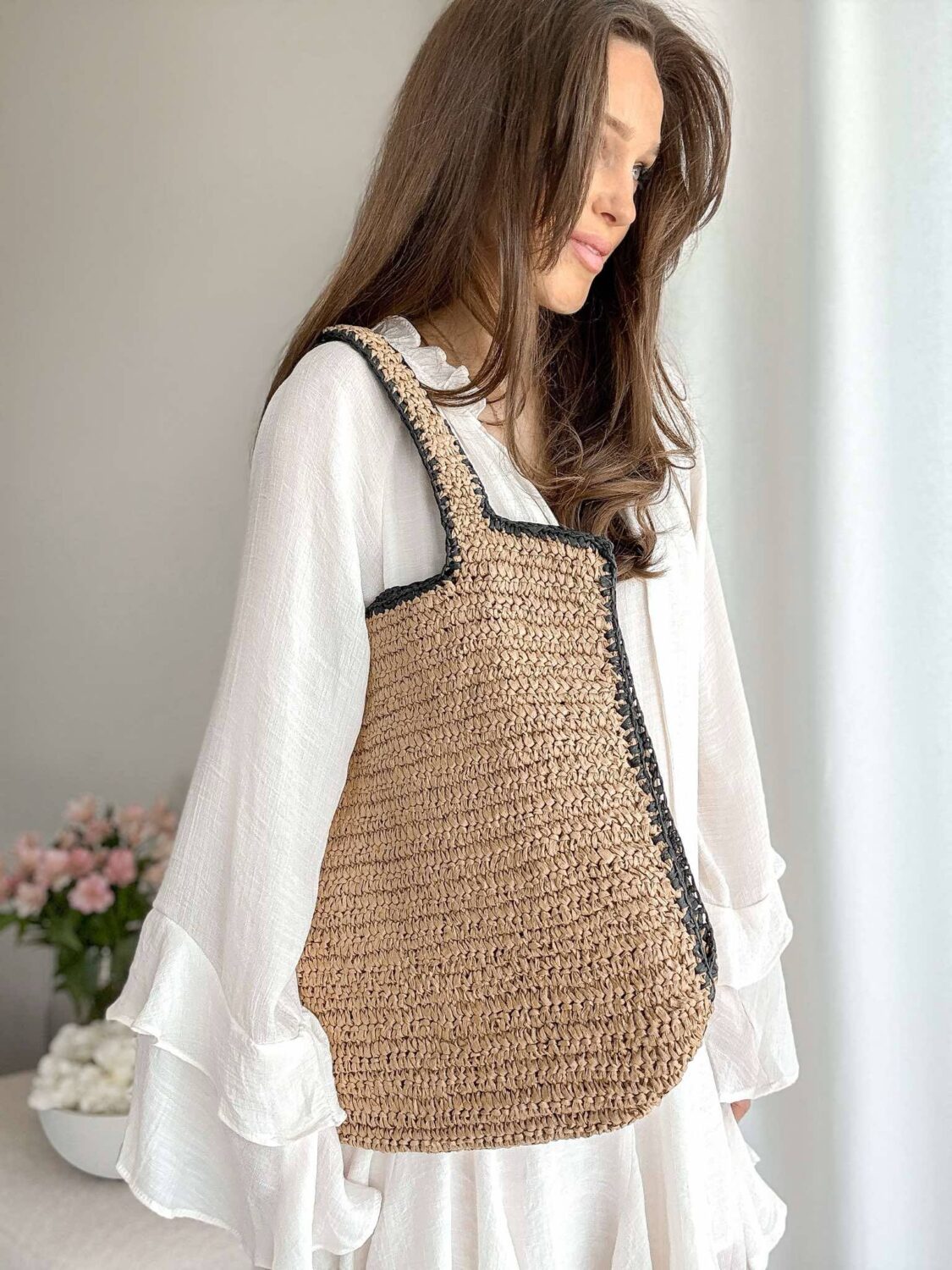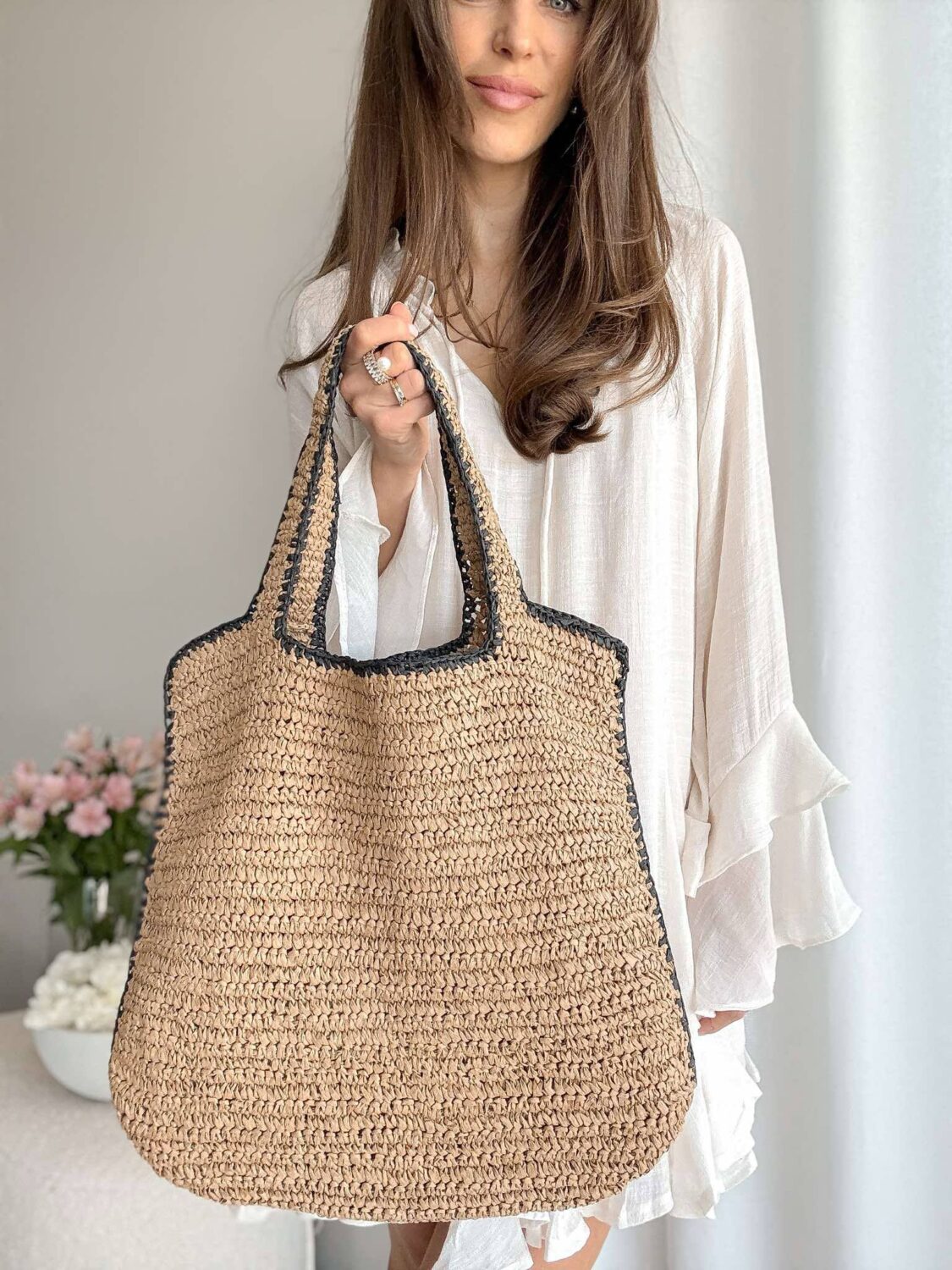 Beżowa pleciona torba z czarna lamówką.