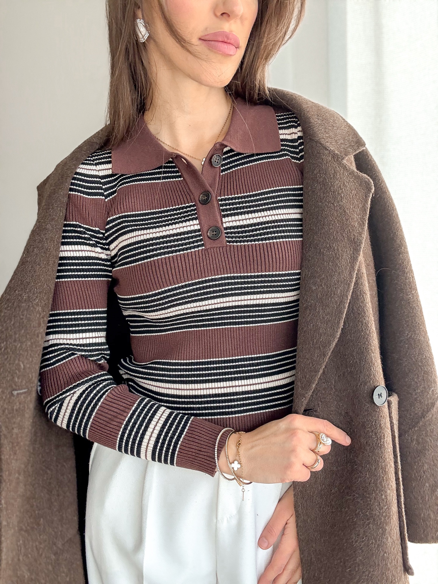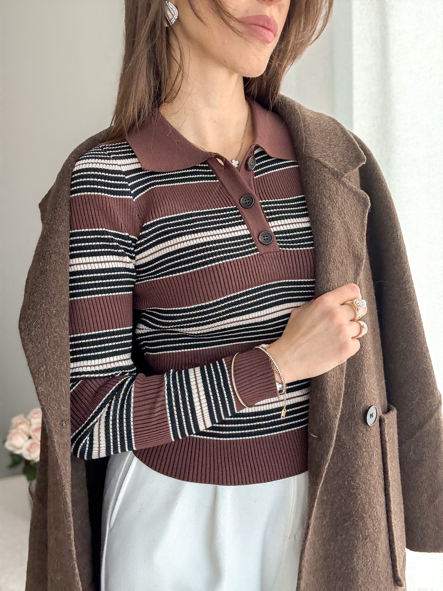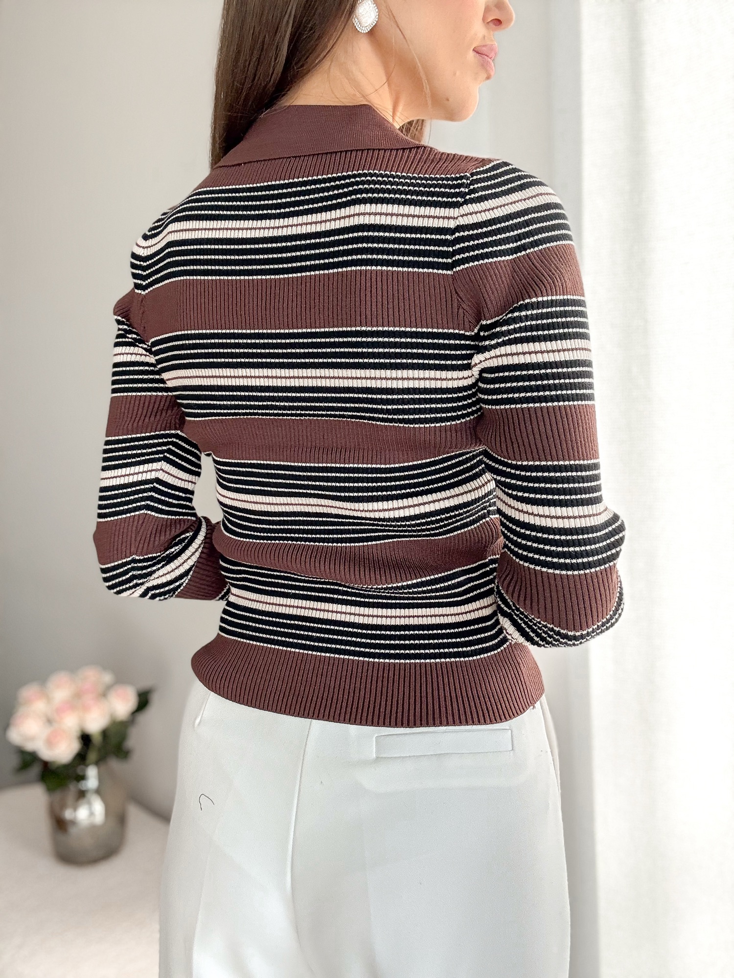 Dzianinowa bluzeczka z kołnierzykiem polo w paski.