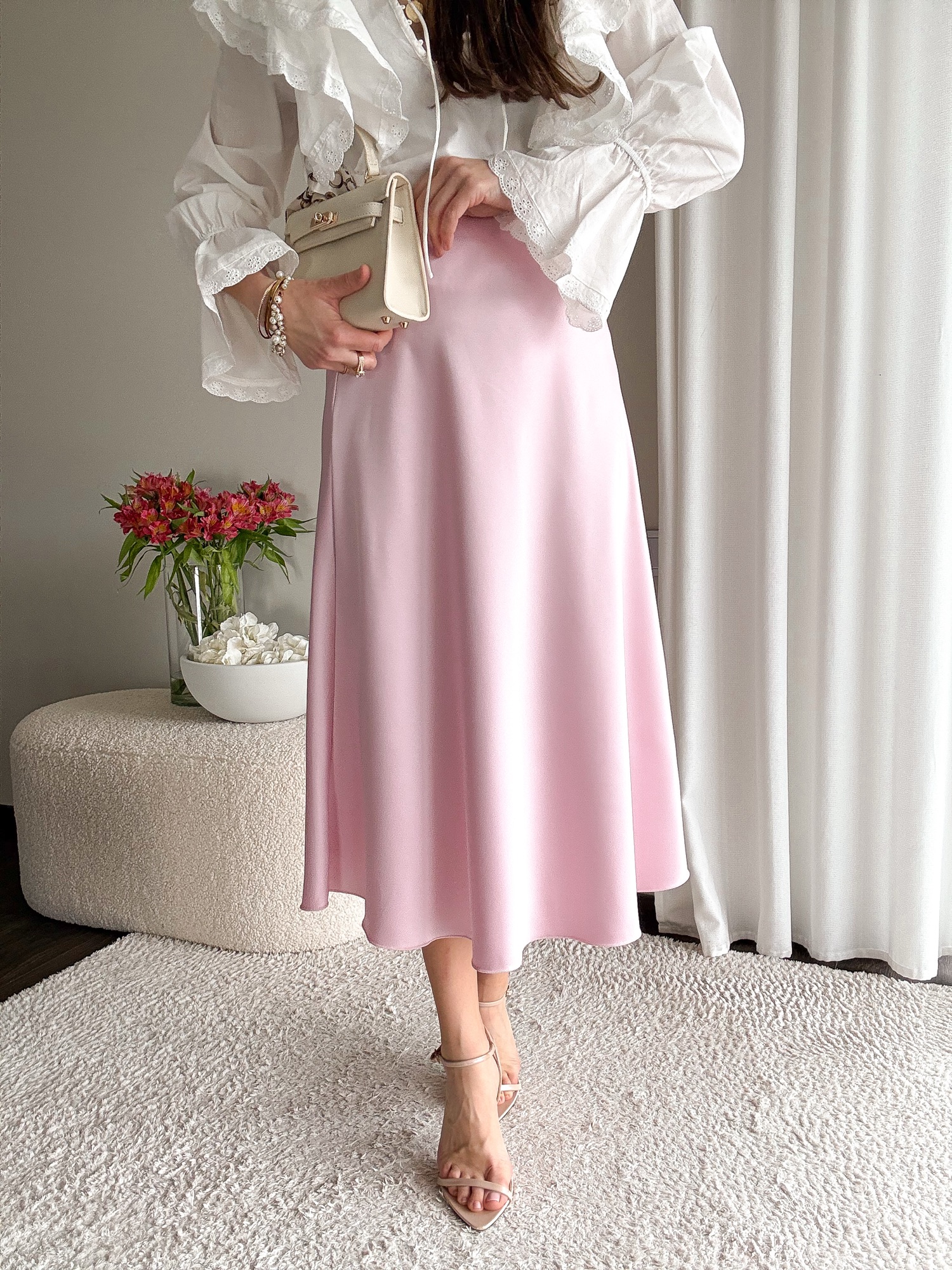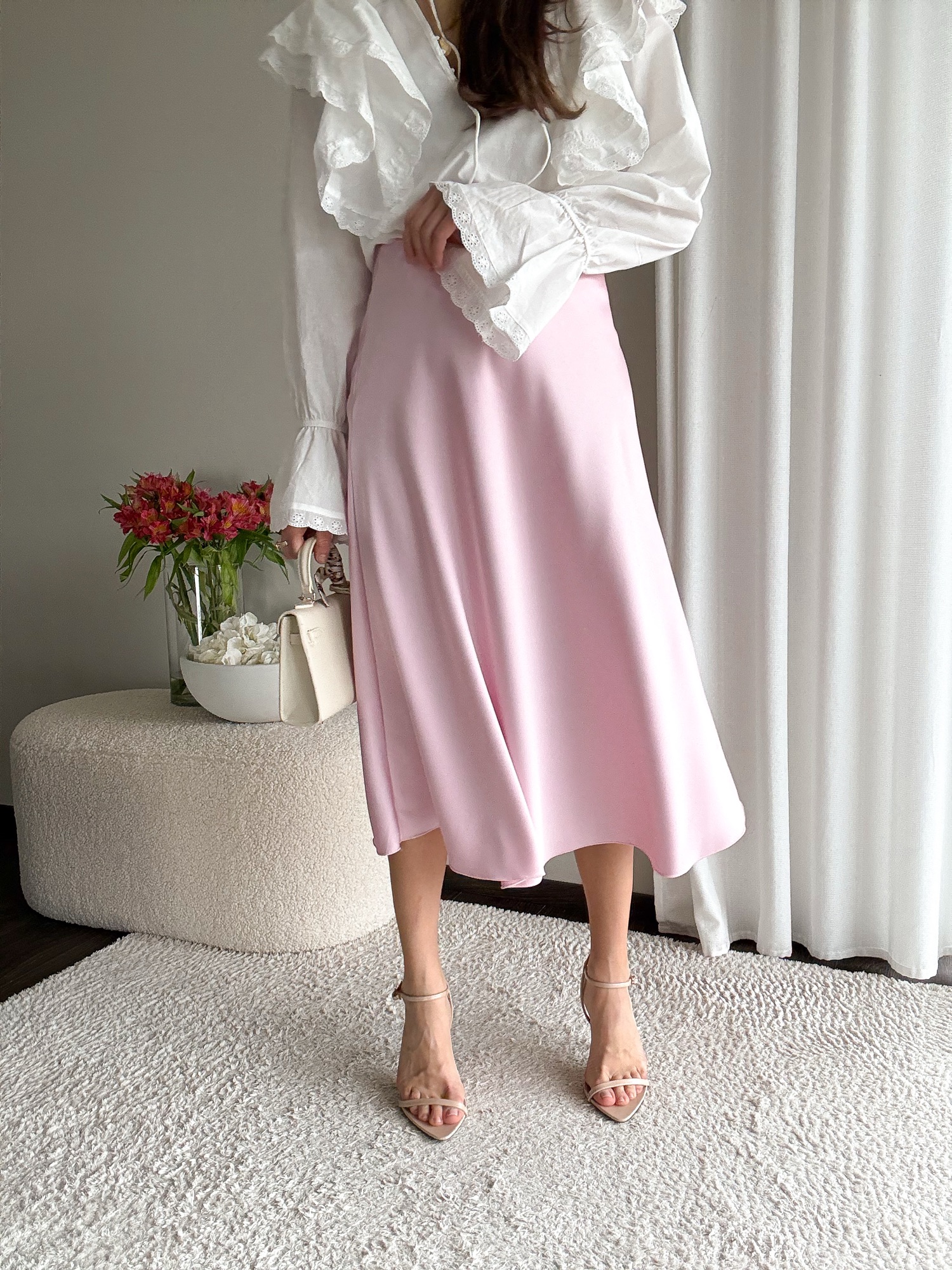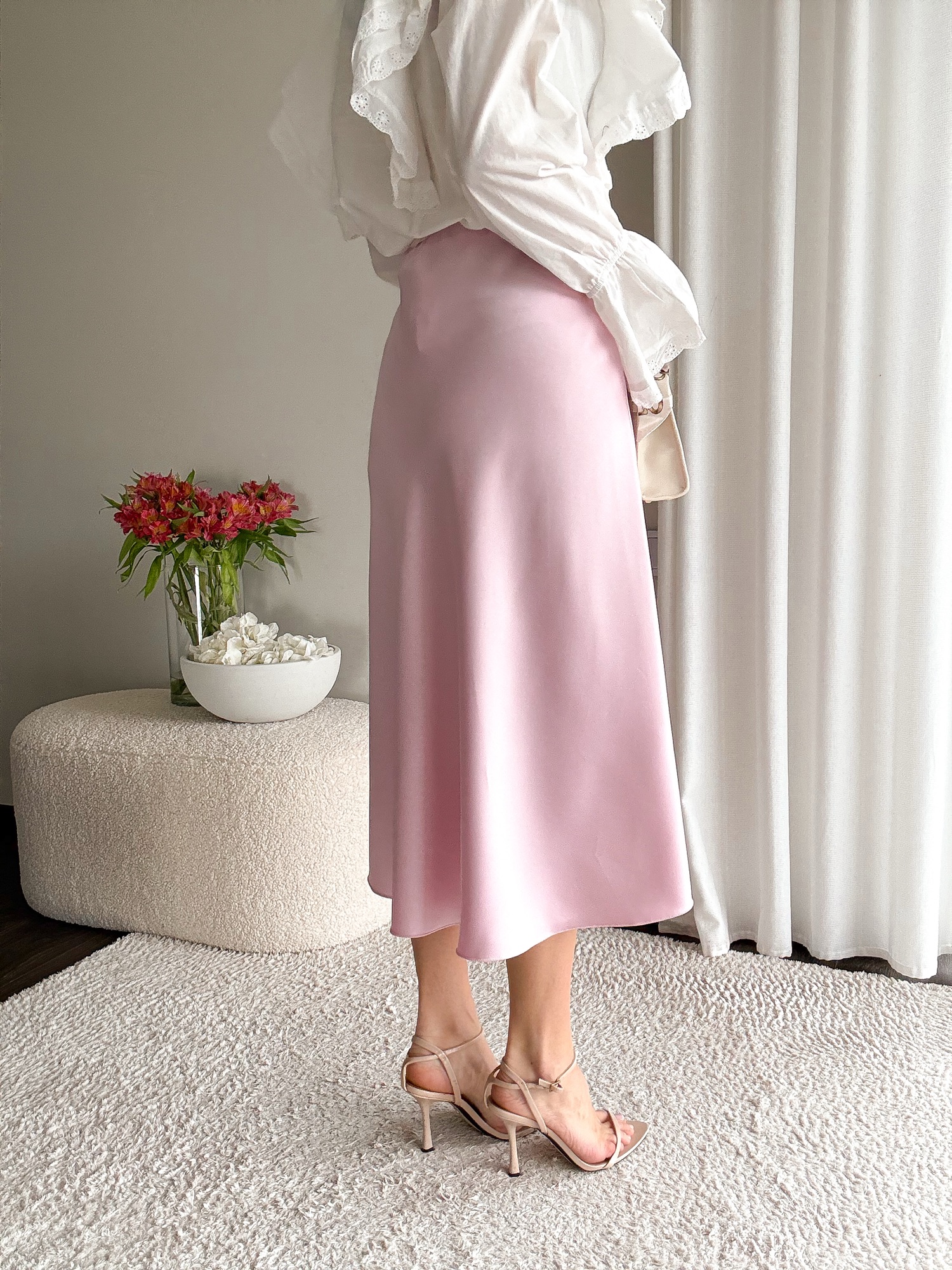 Satynowa spódnica o kroju w literę A, dopasowana w biodrach, rozkloszowana ku dołowi.