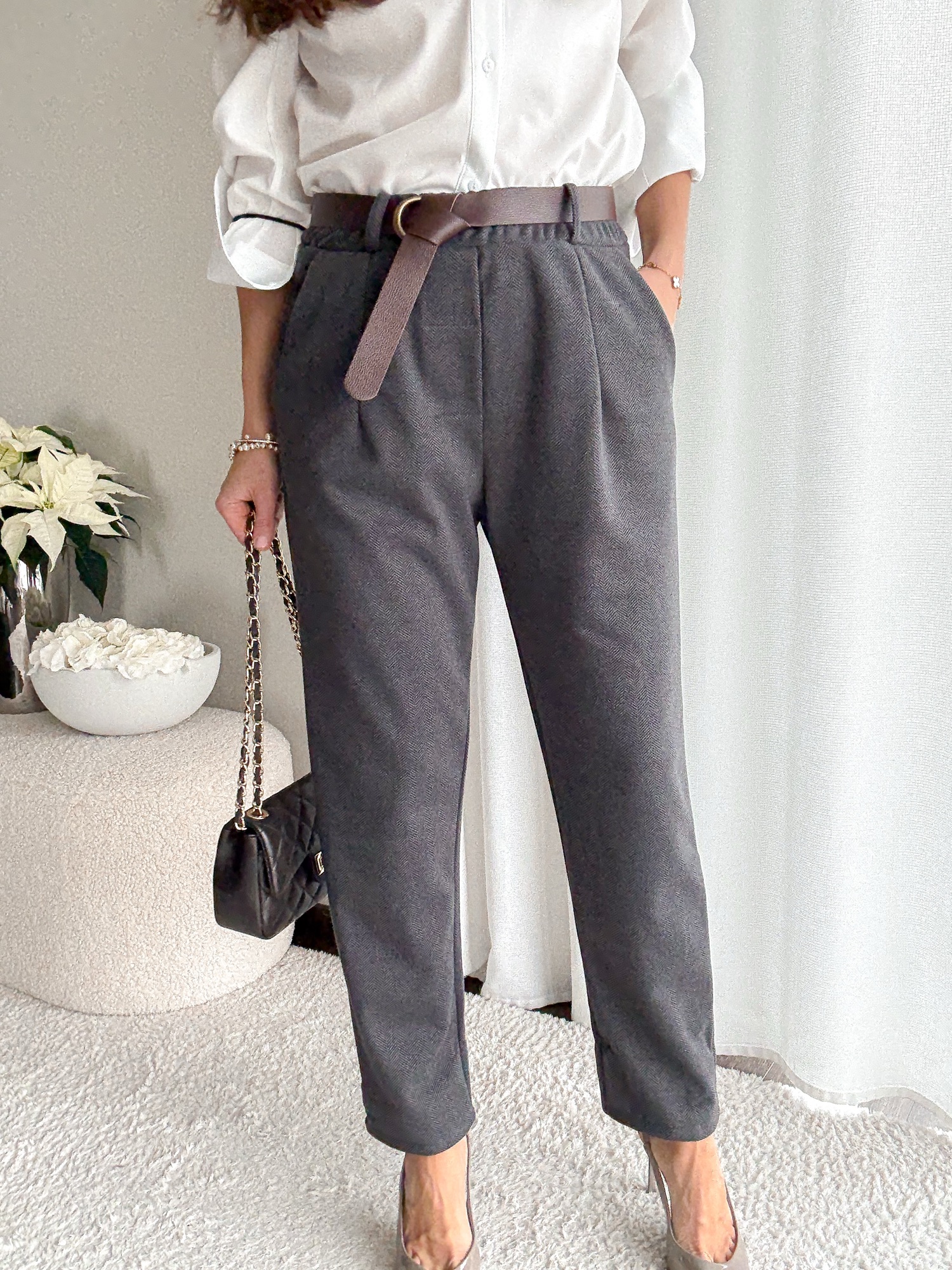 Spodnie z grubszej, ciepłej tkaniny w jodełkę.