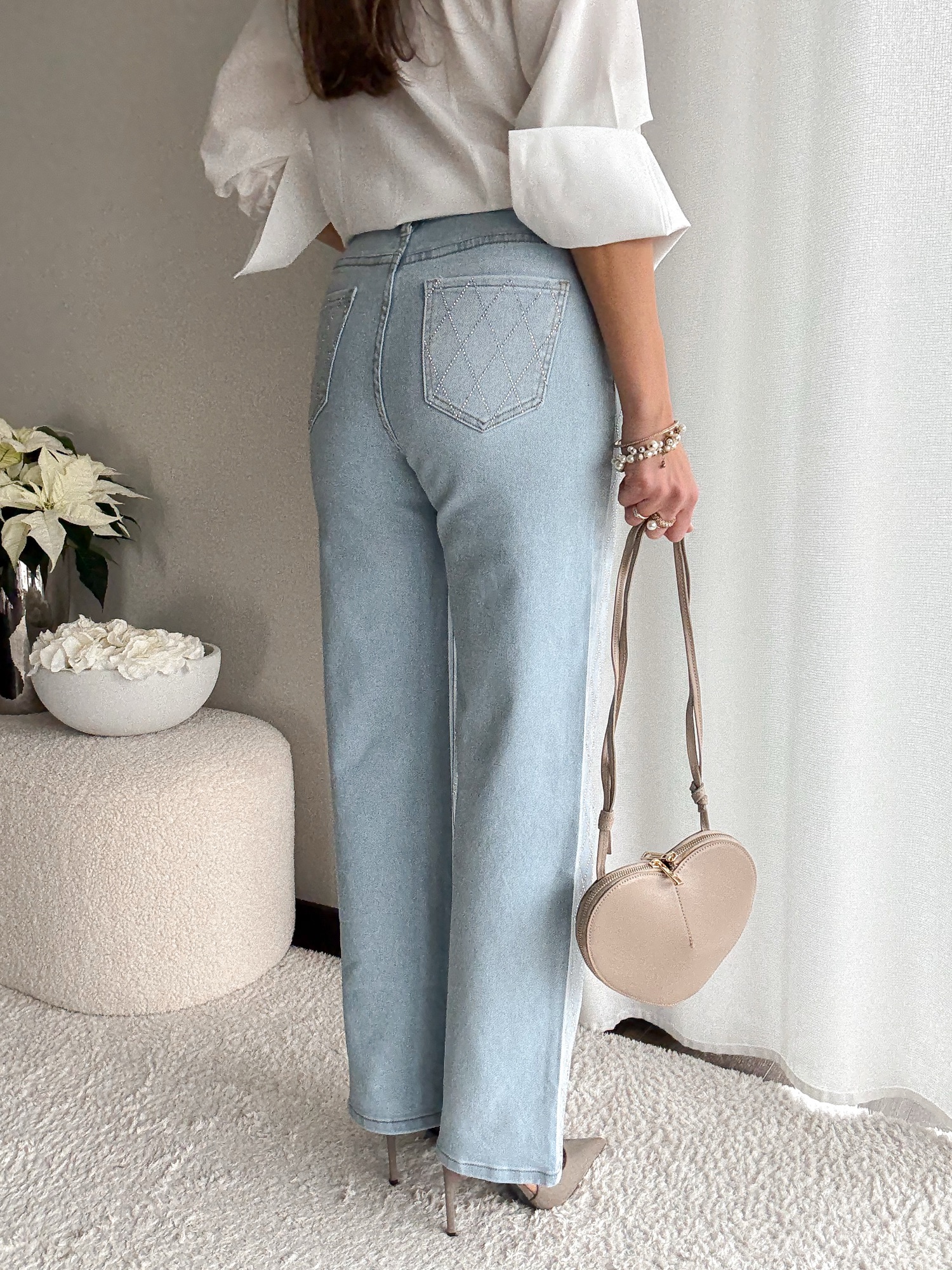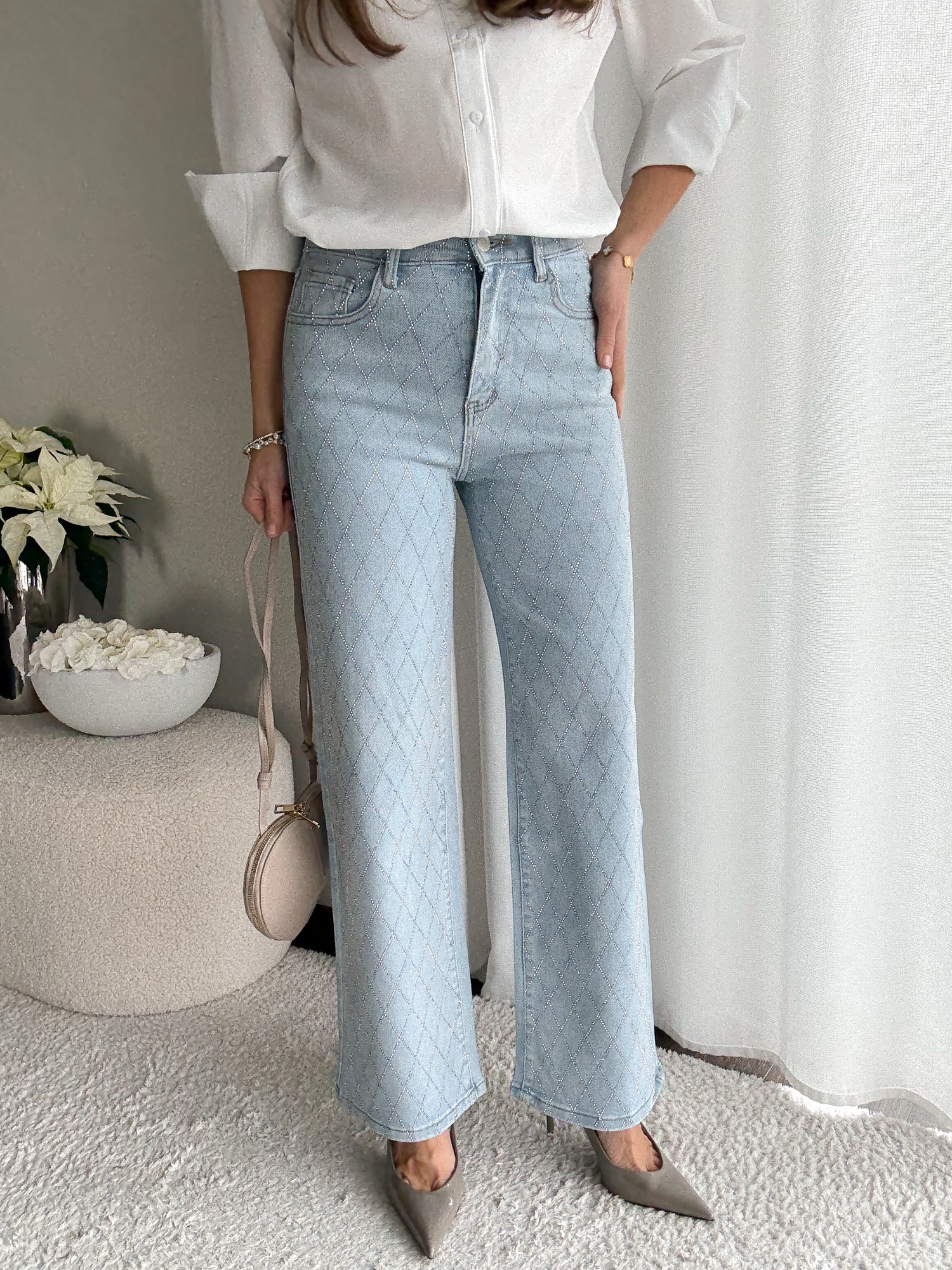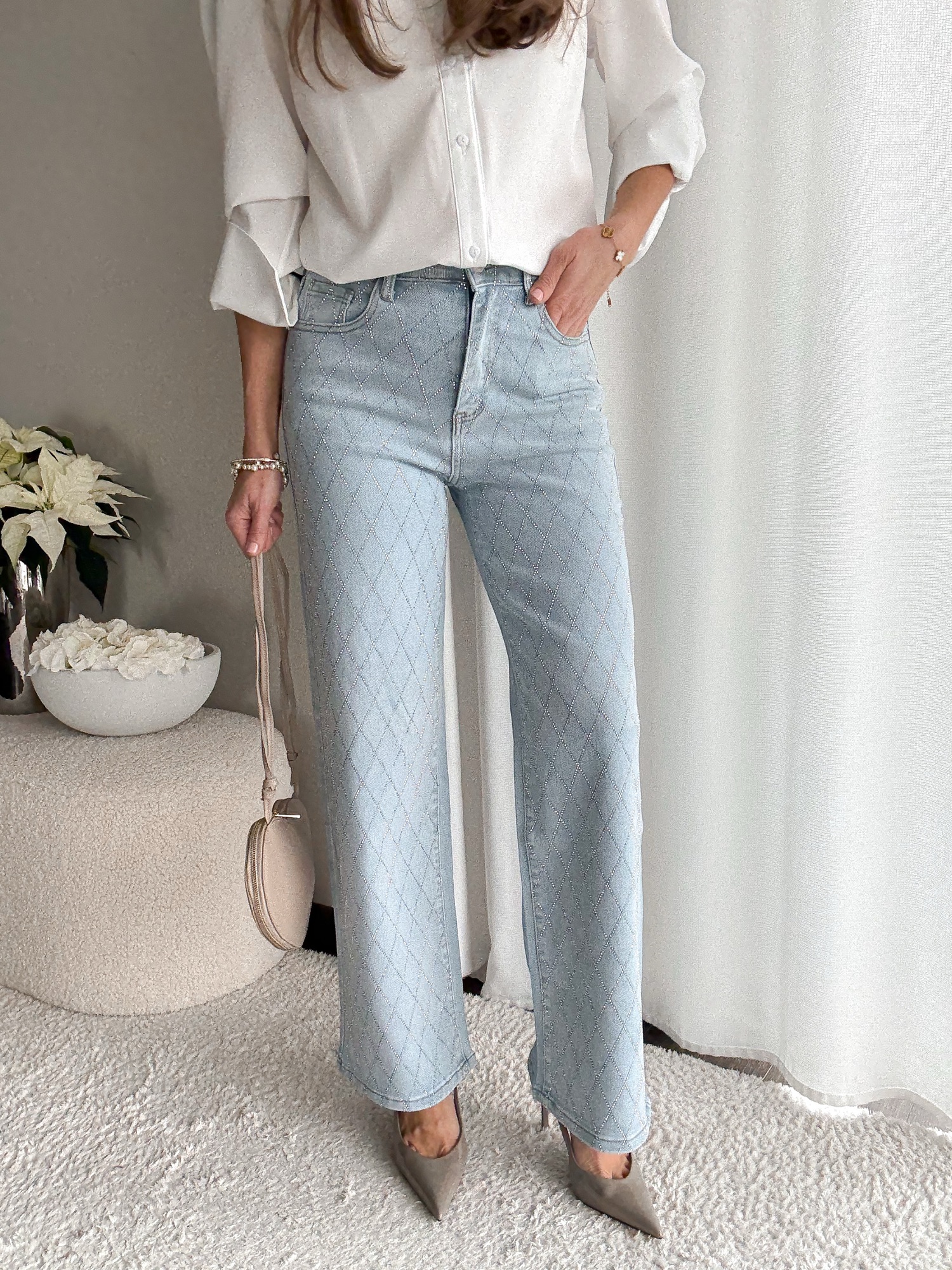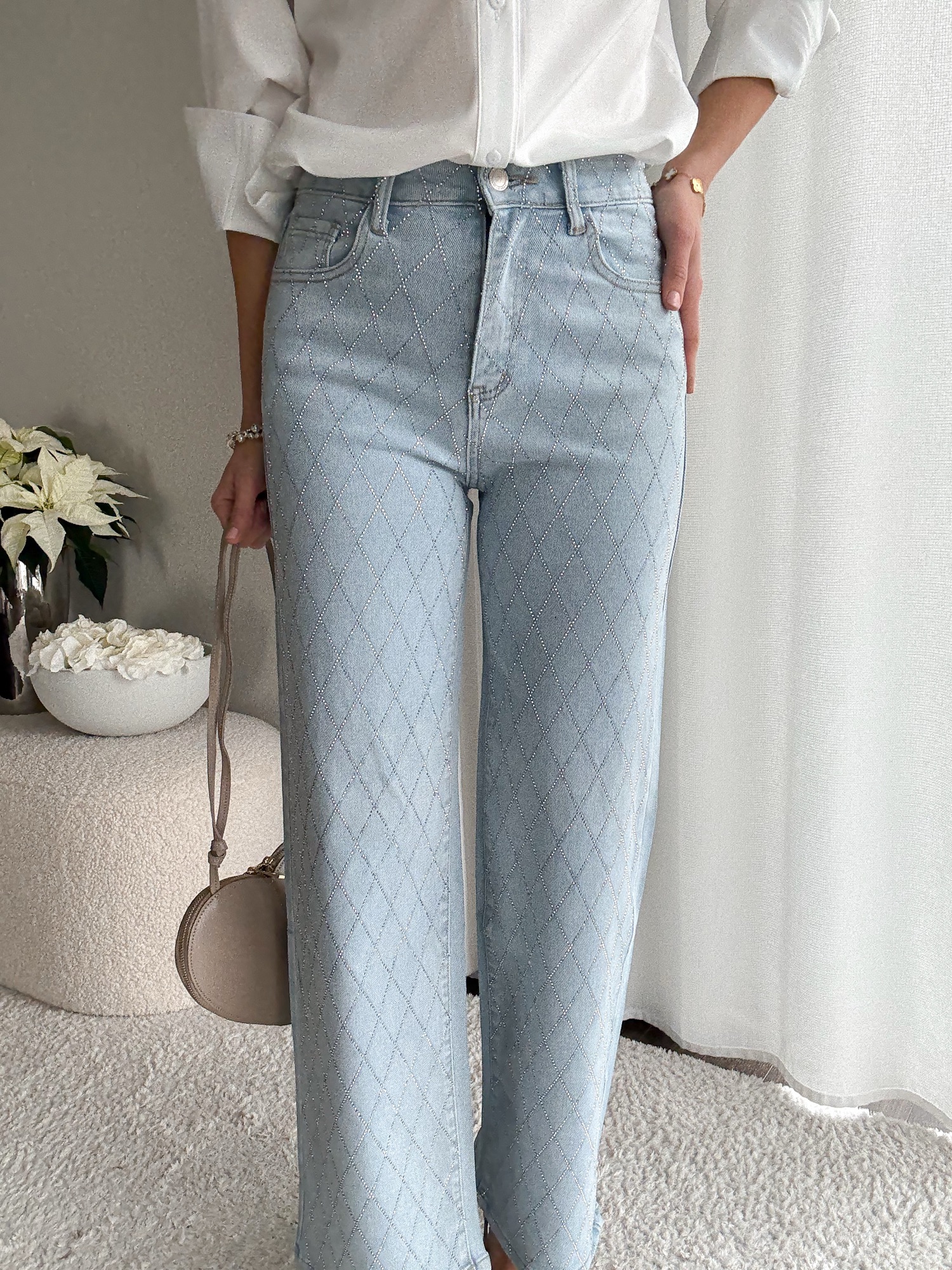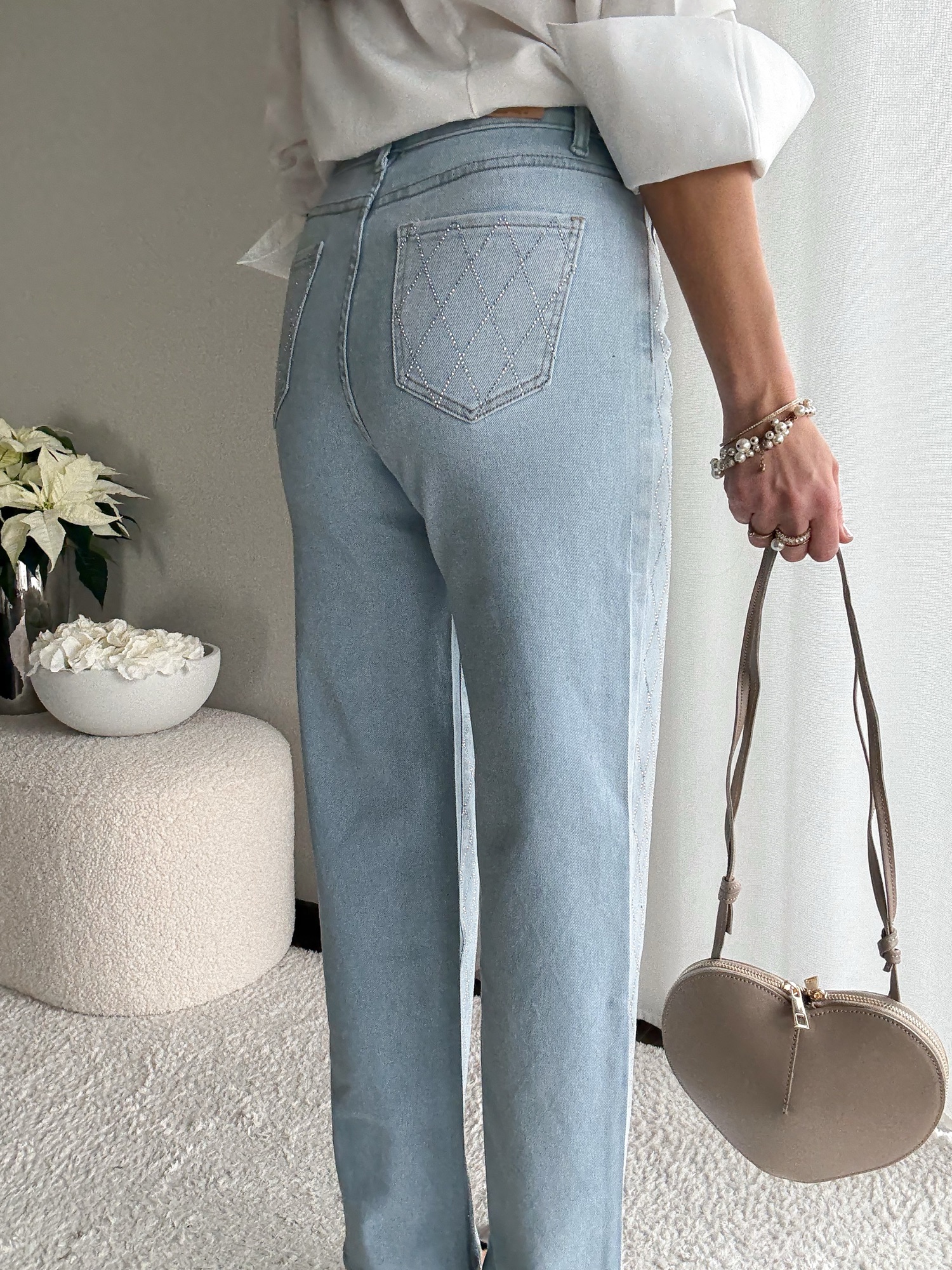 Jasne jeansy ozdobione cyrkoniami w kształcie rombów z przodu i na tylnych kieszeniach.