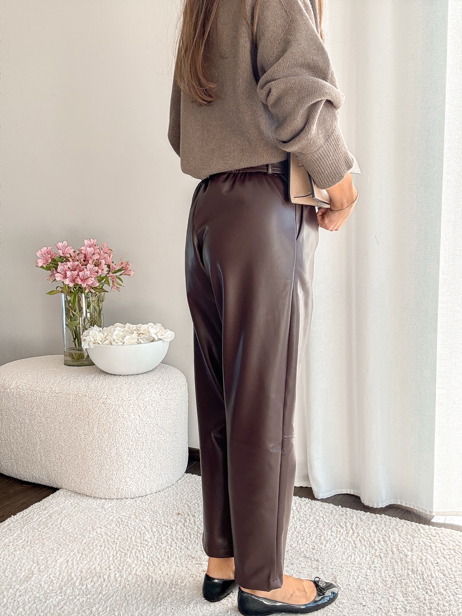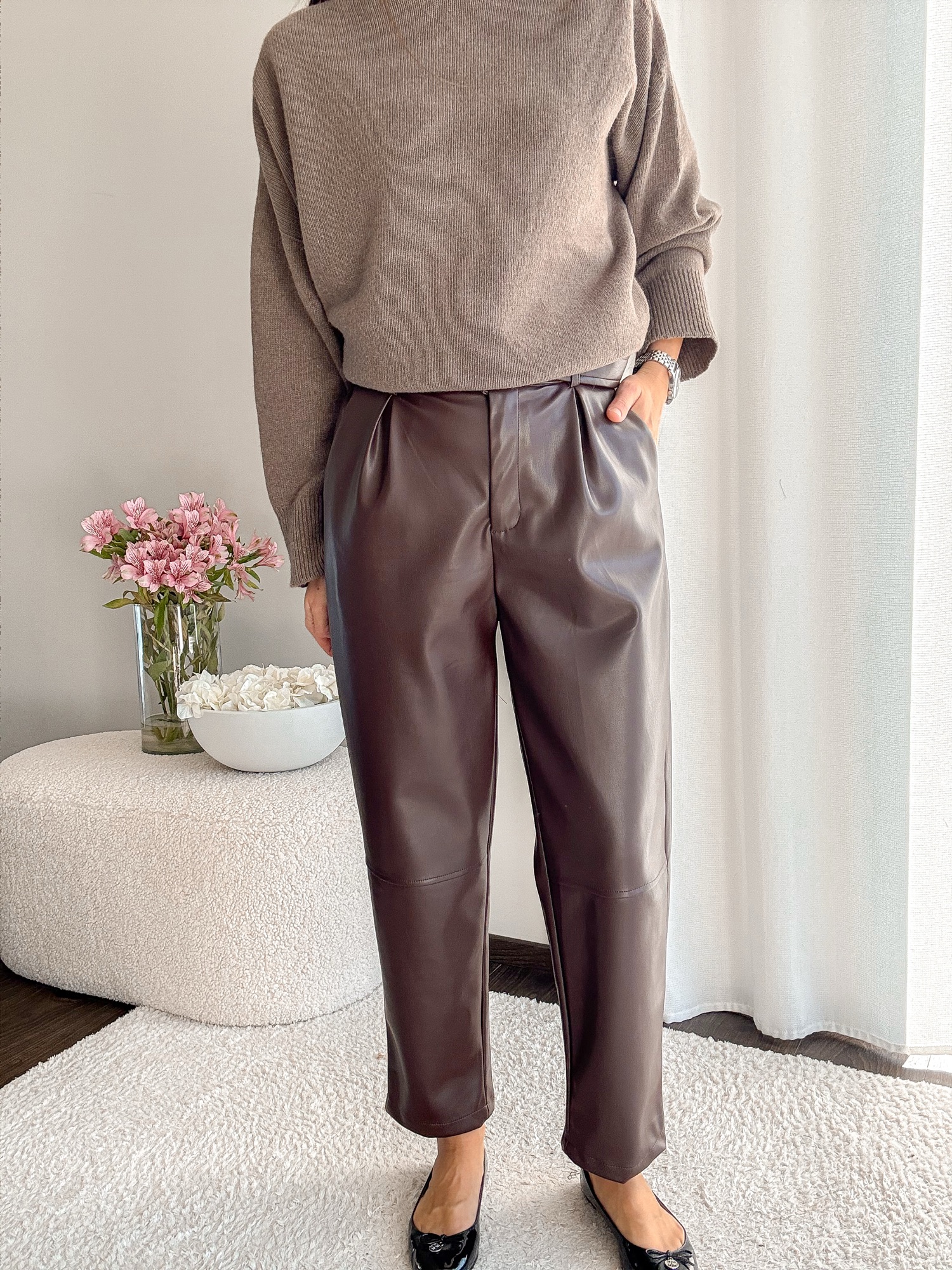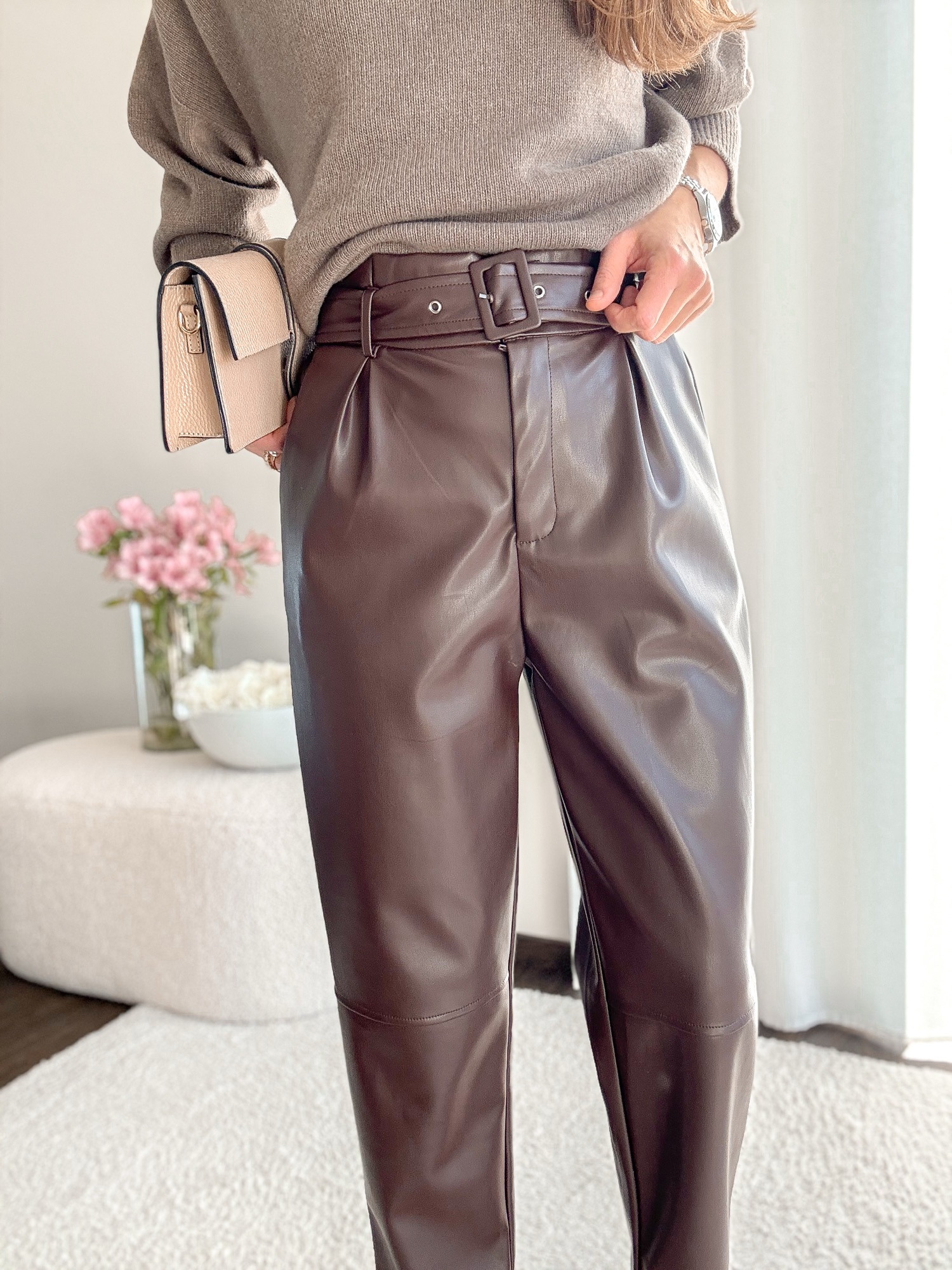 Spodnie z miękkiej eko skóry z delikatnie zwężaną nogawką i wysokim stanem.
