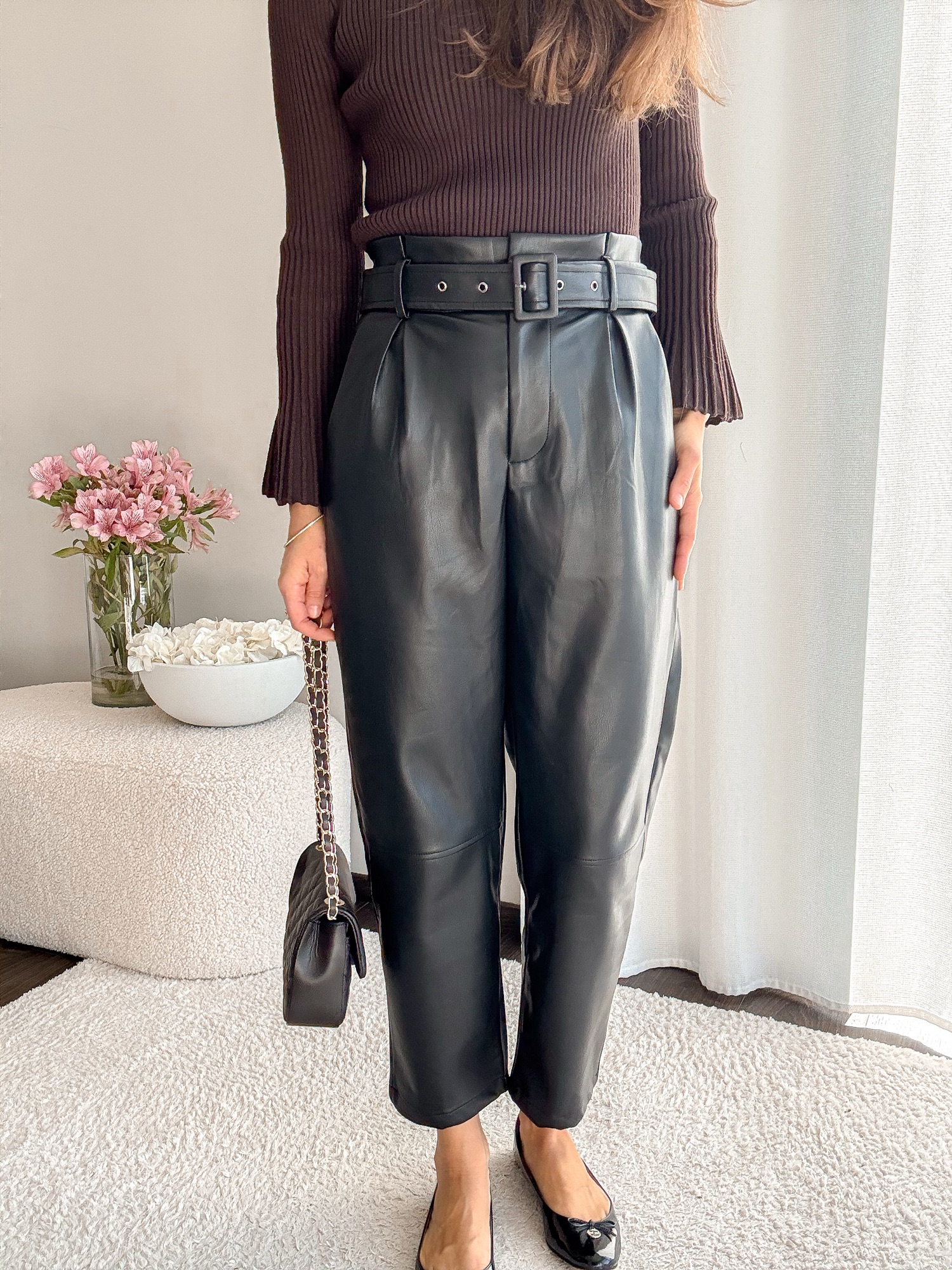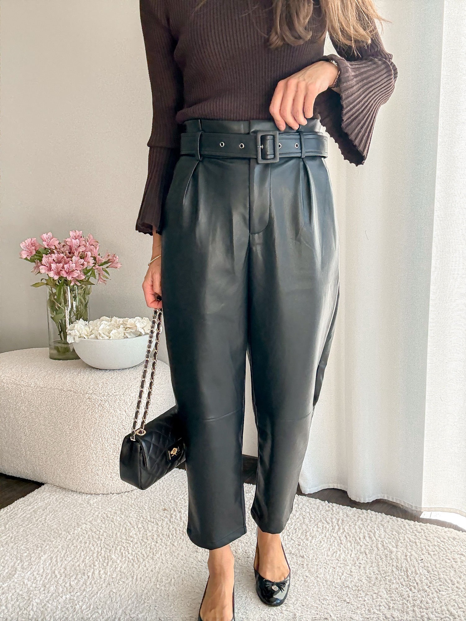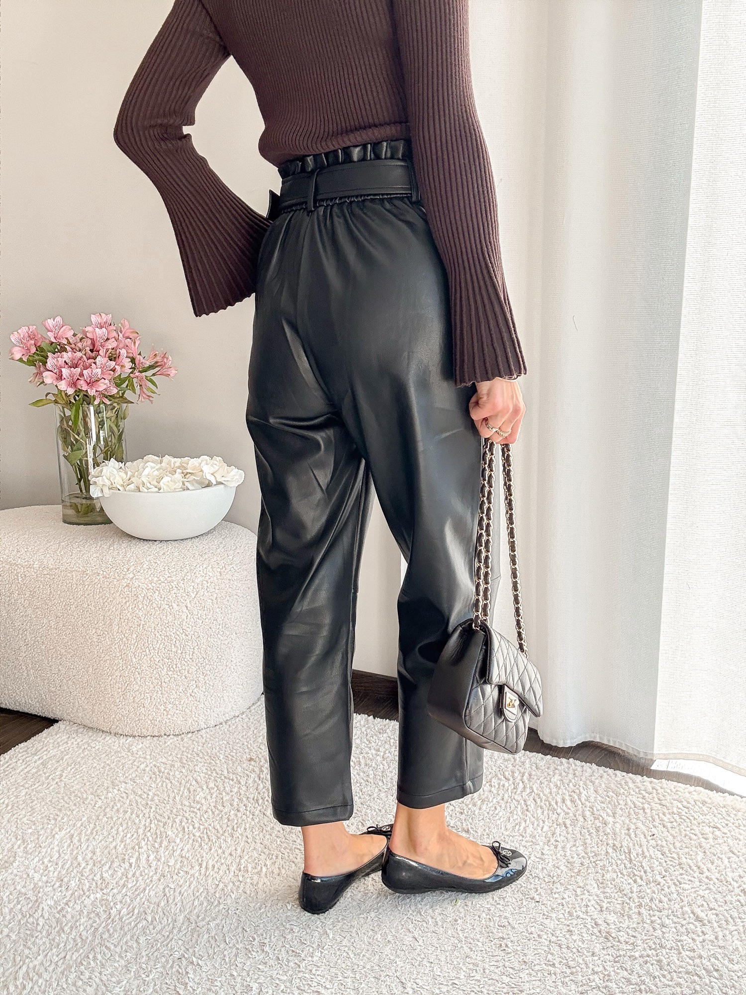 Spodnie z miękkiej eko skóry z delikatnie zwężaną nogawką i wysokim stanem.