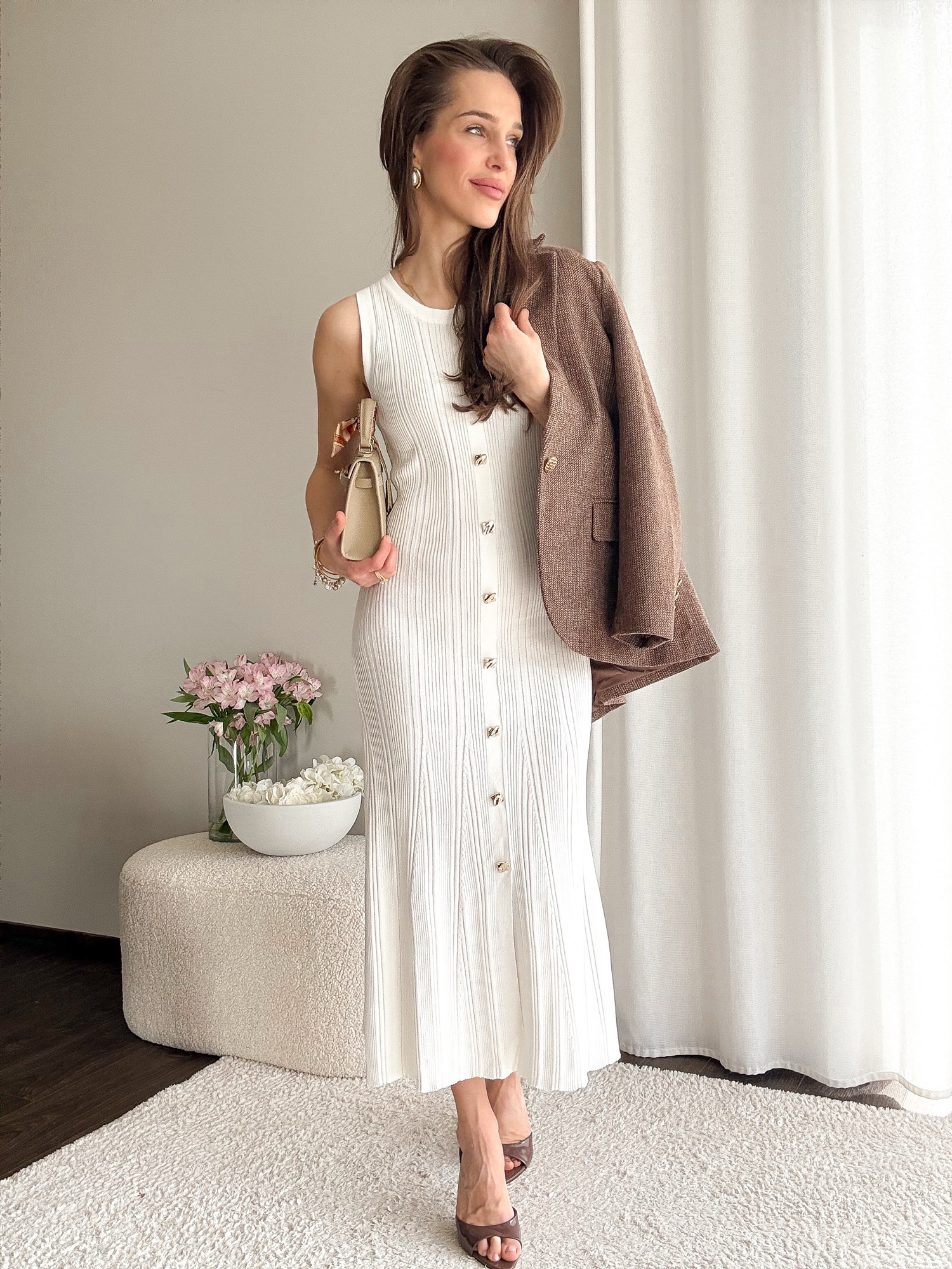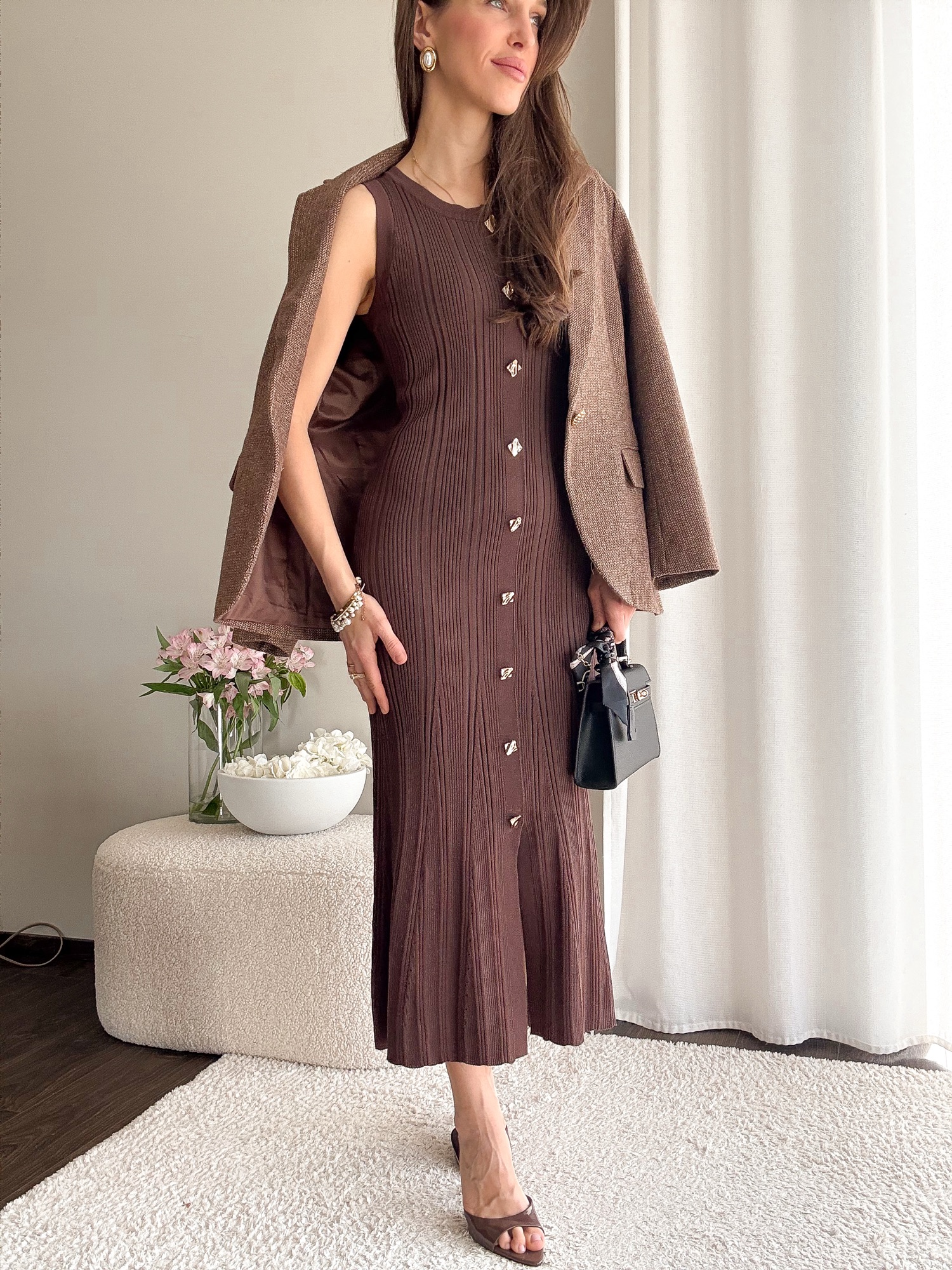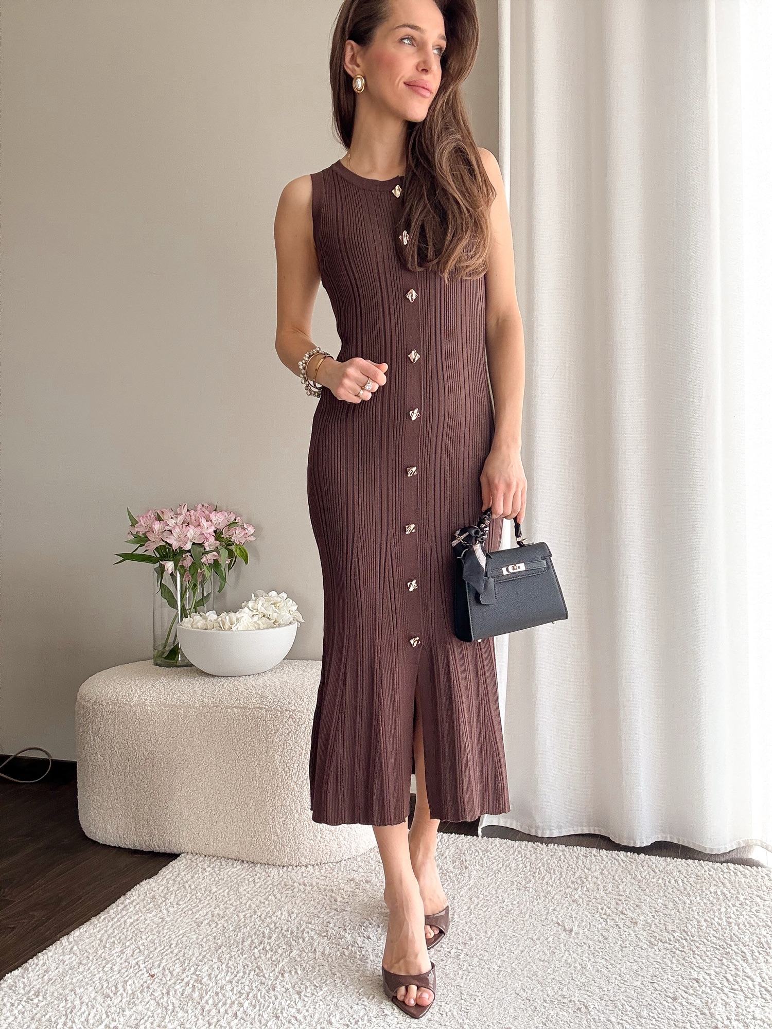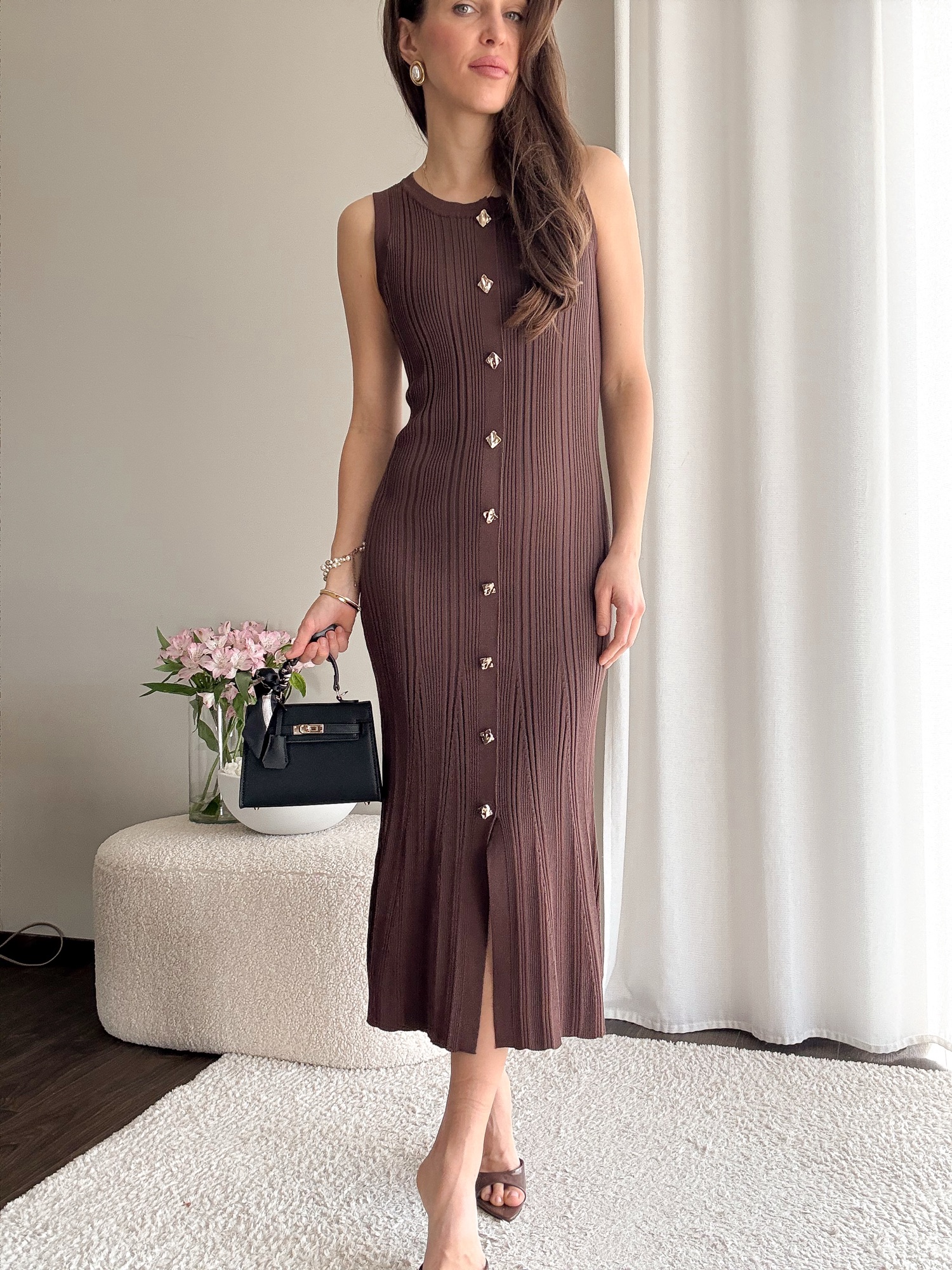 Dopasowana dzianinowa sukienka długości midi bez rękawów.