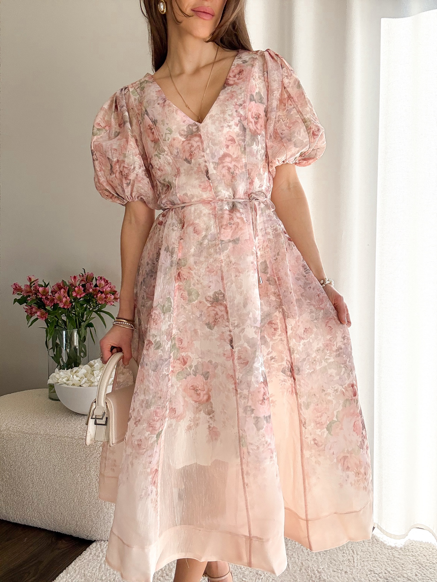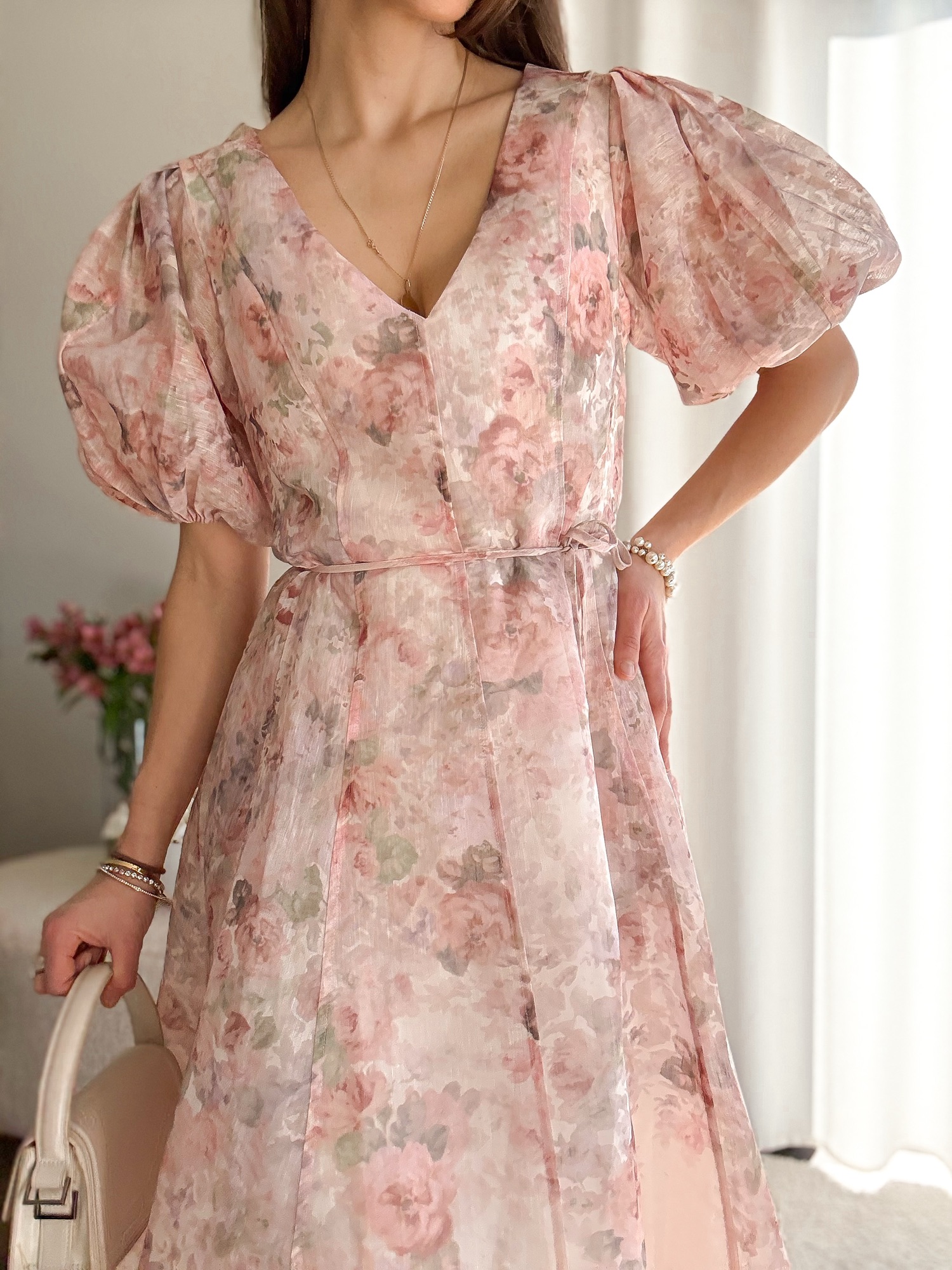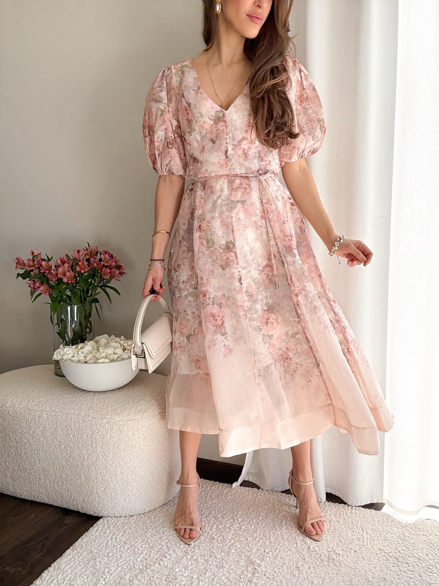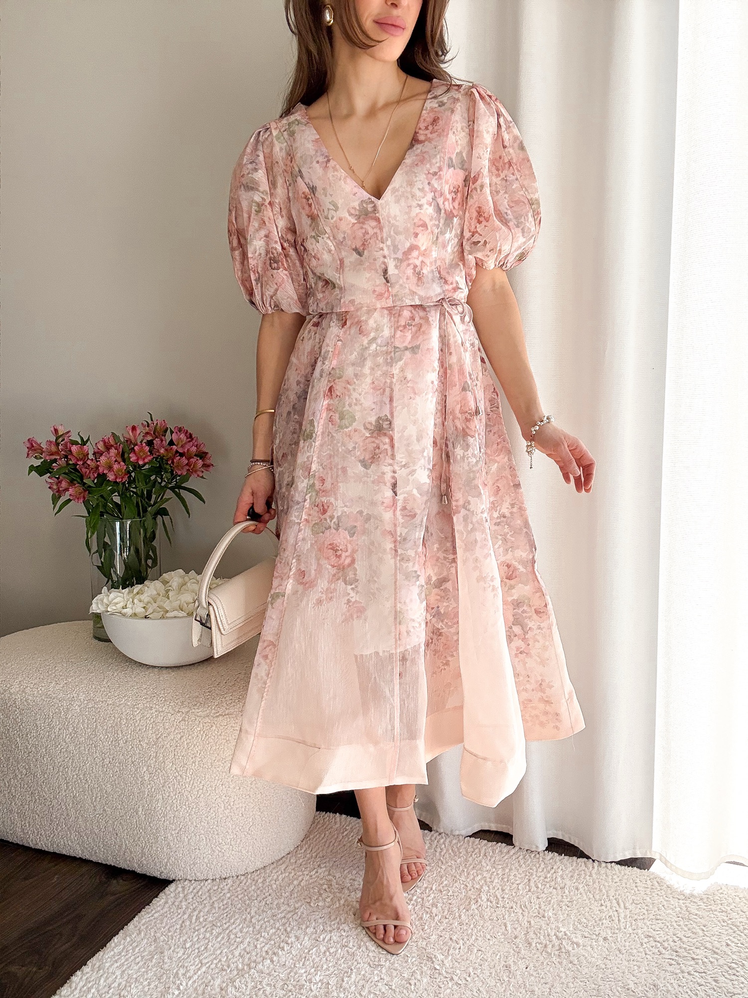 Sukienka o długości midi z bufiastymi rękawami o długości 3/4.