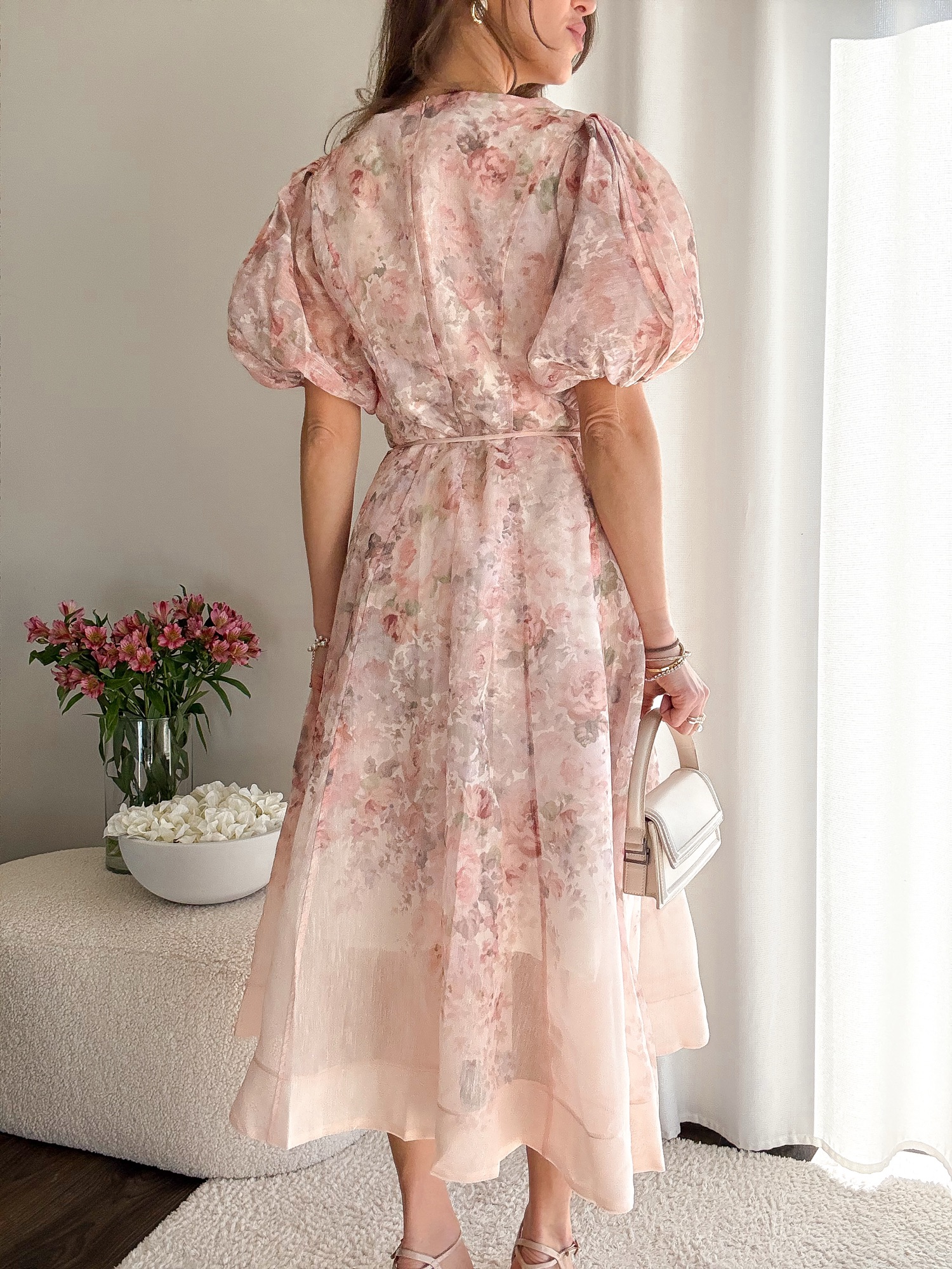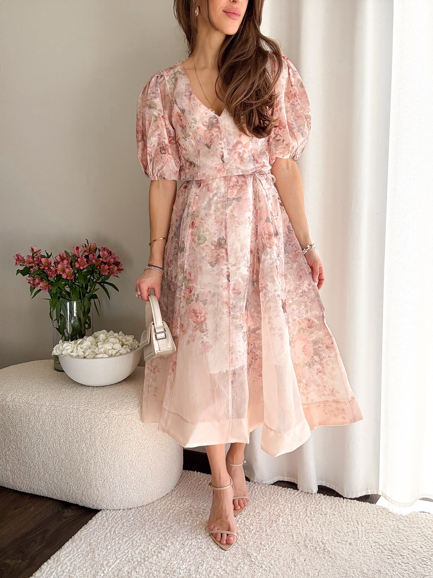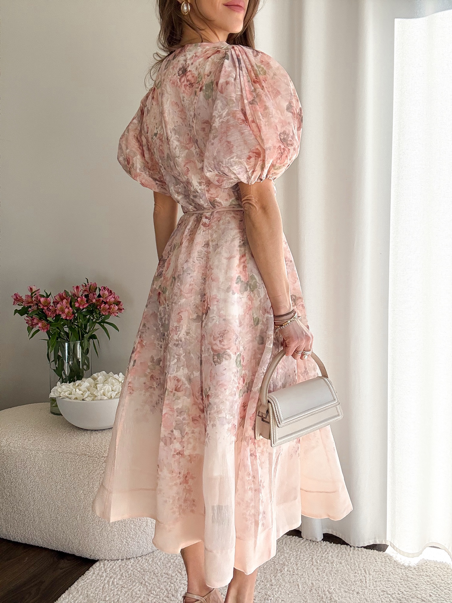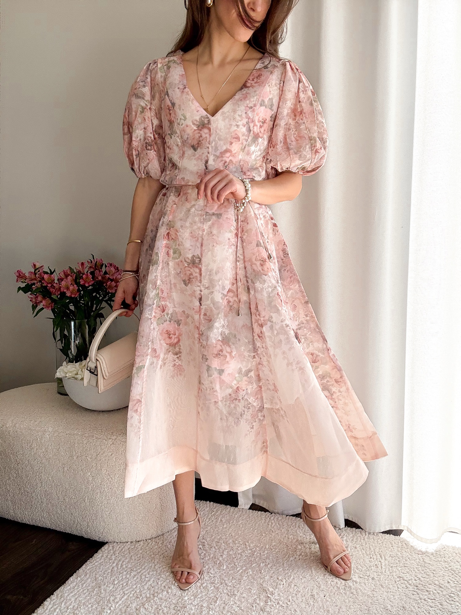 Sukienka o długości midi z bufiastymi rękawami o długości 3/4.