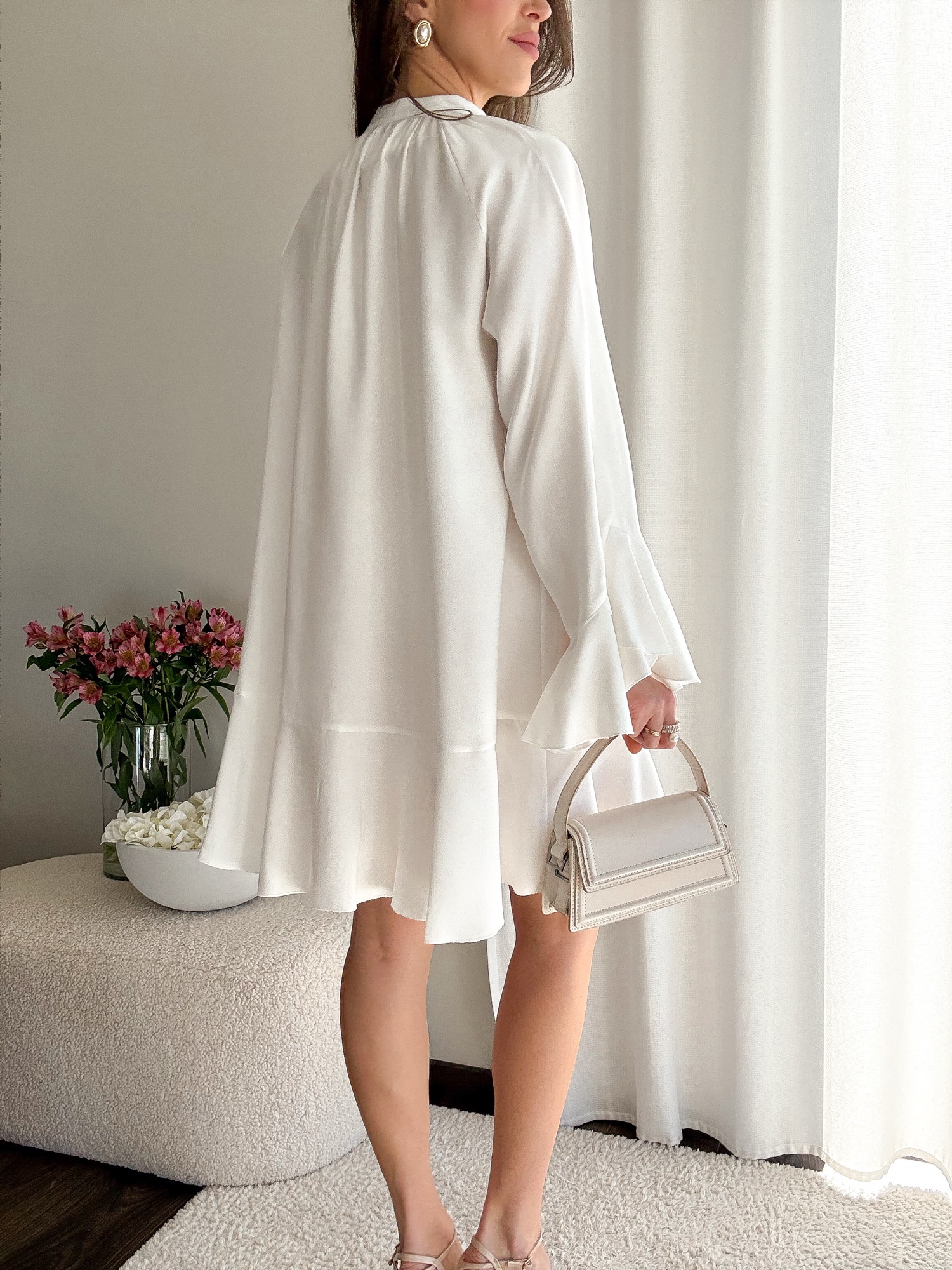 Dół sukienki jak i rękawy wykończone falbanami.