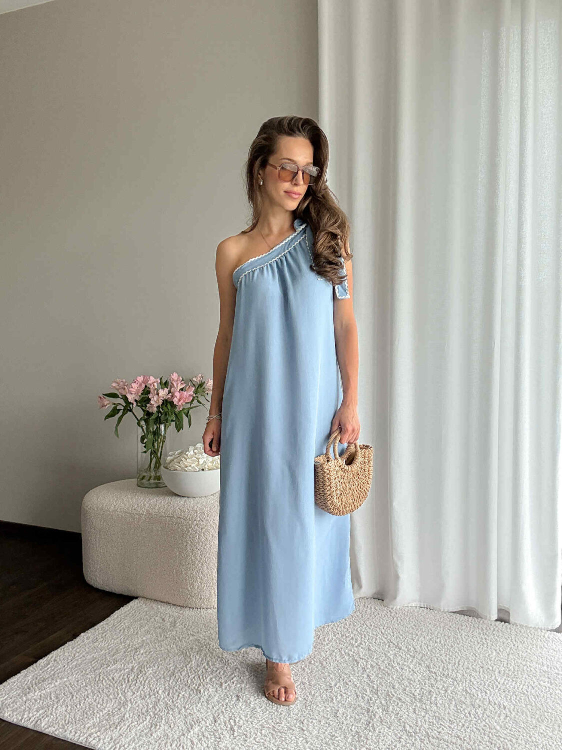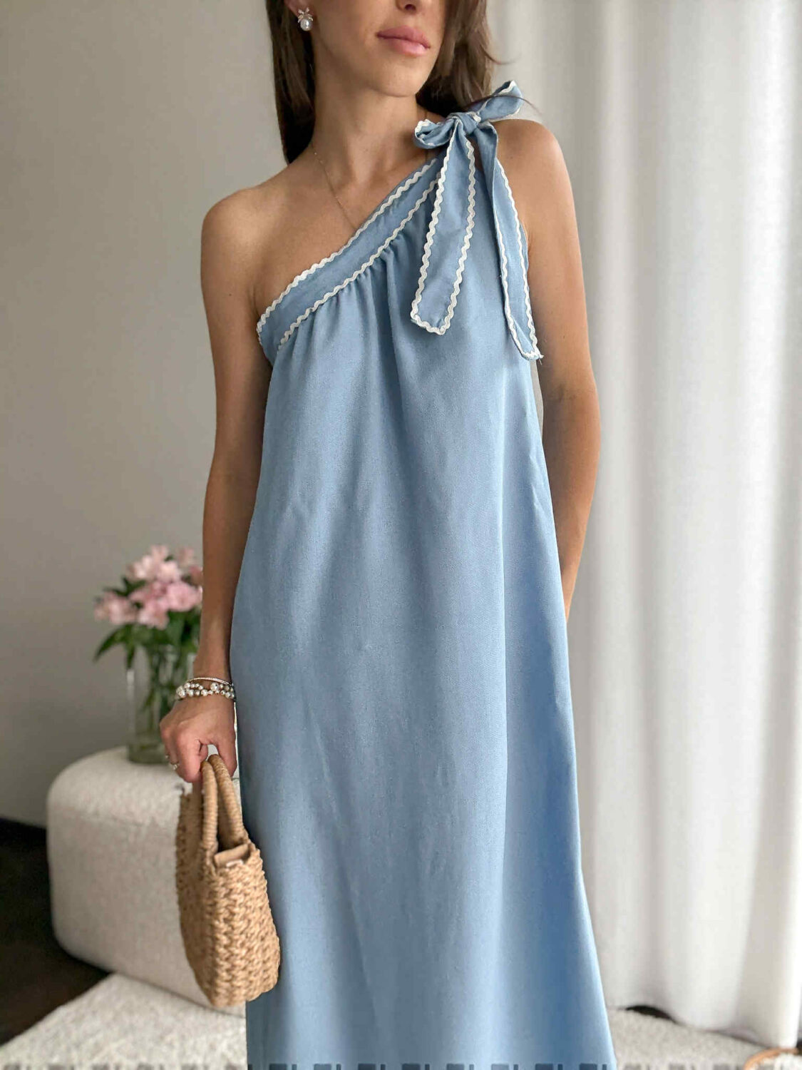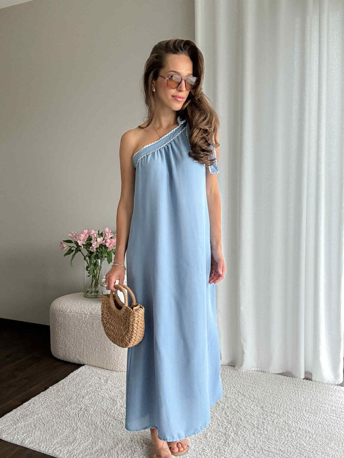 Sukienka maxi wiązana na jedno ramię za pomocą dwóch sztywnych tasiemek.