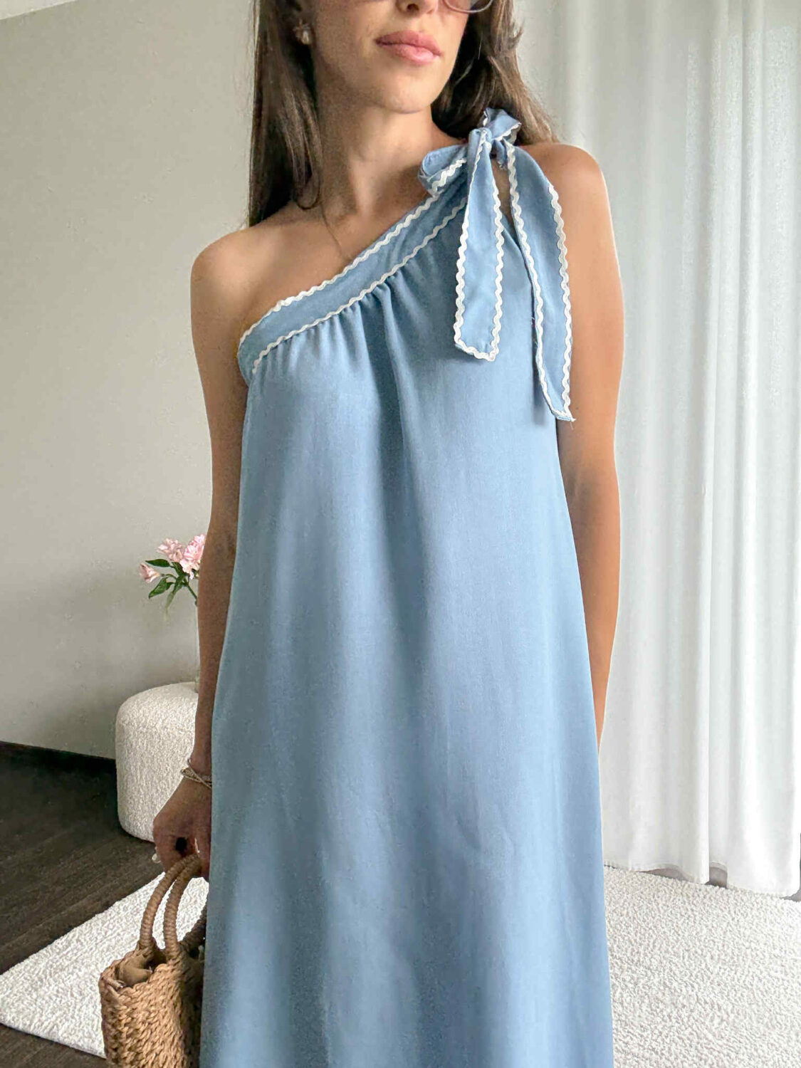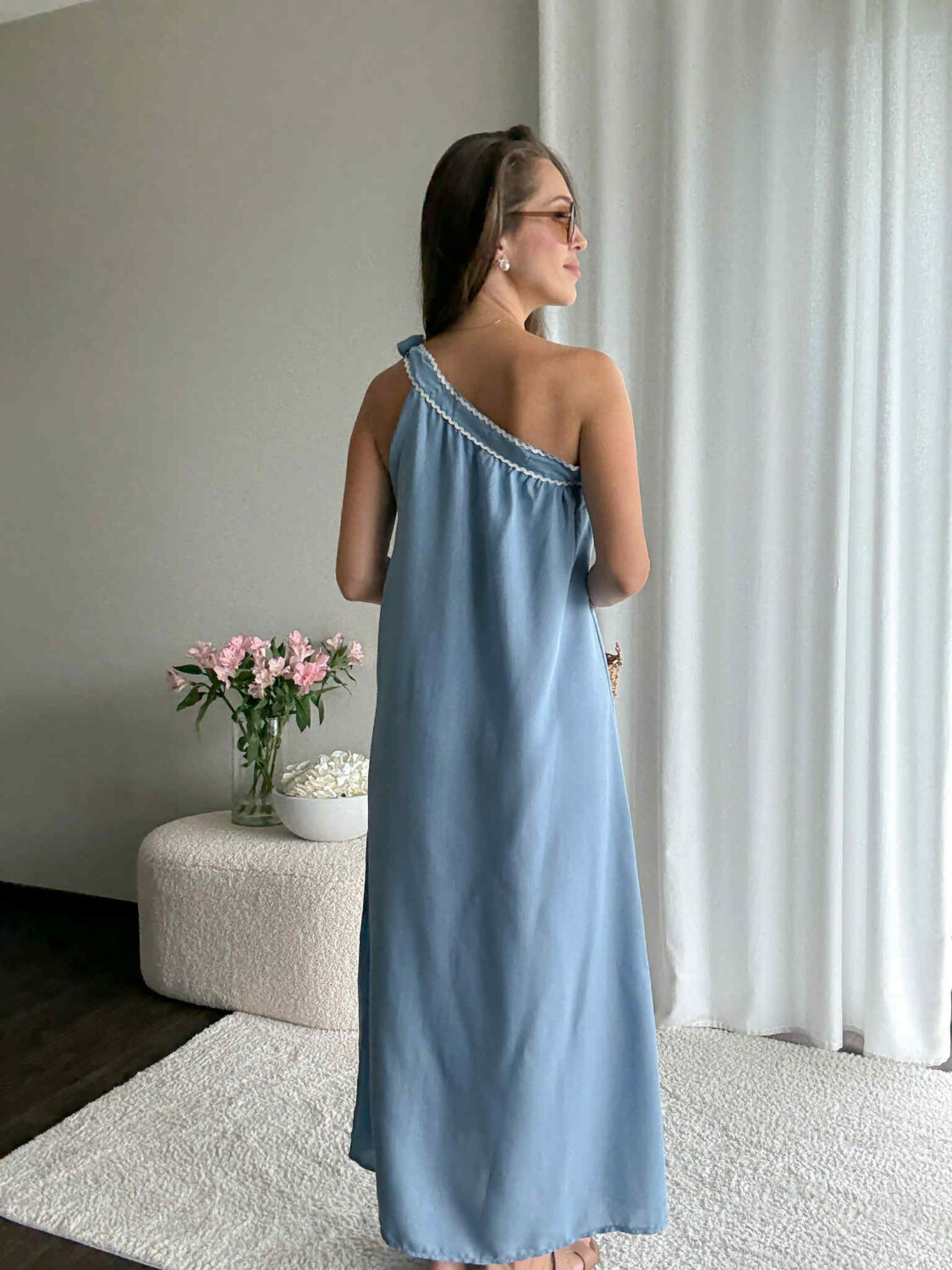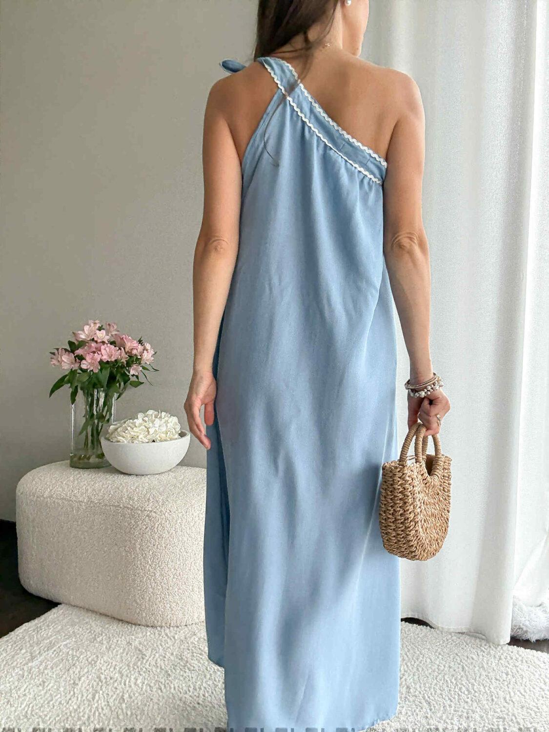 Sukienka maxi wiązana na jedno ramię za pomocą dwóch sztywnych tasiemek.