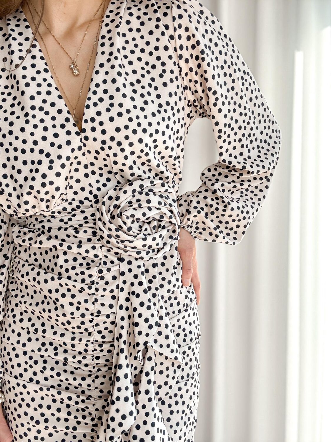 Sukienka z drapowanym dołem i paskiem z ozdobną różą i falbaniastymi szarfami.
