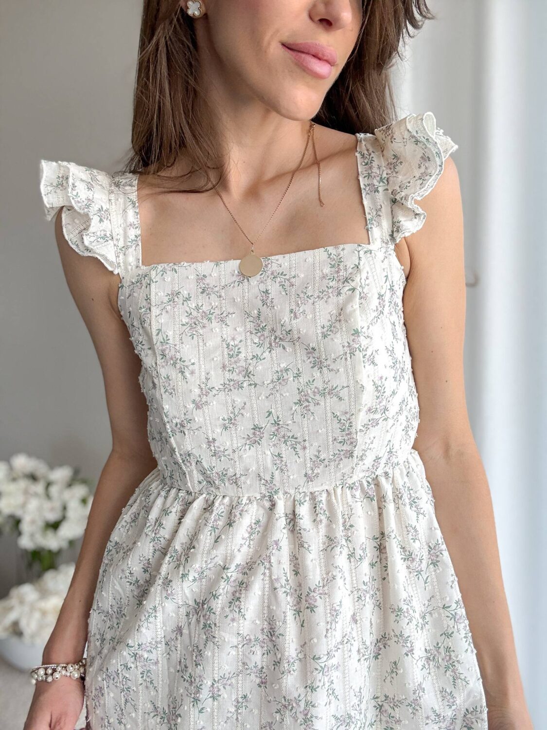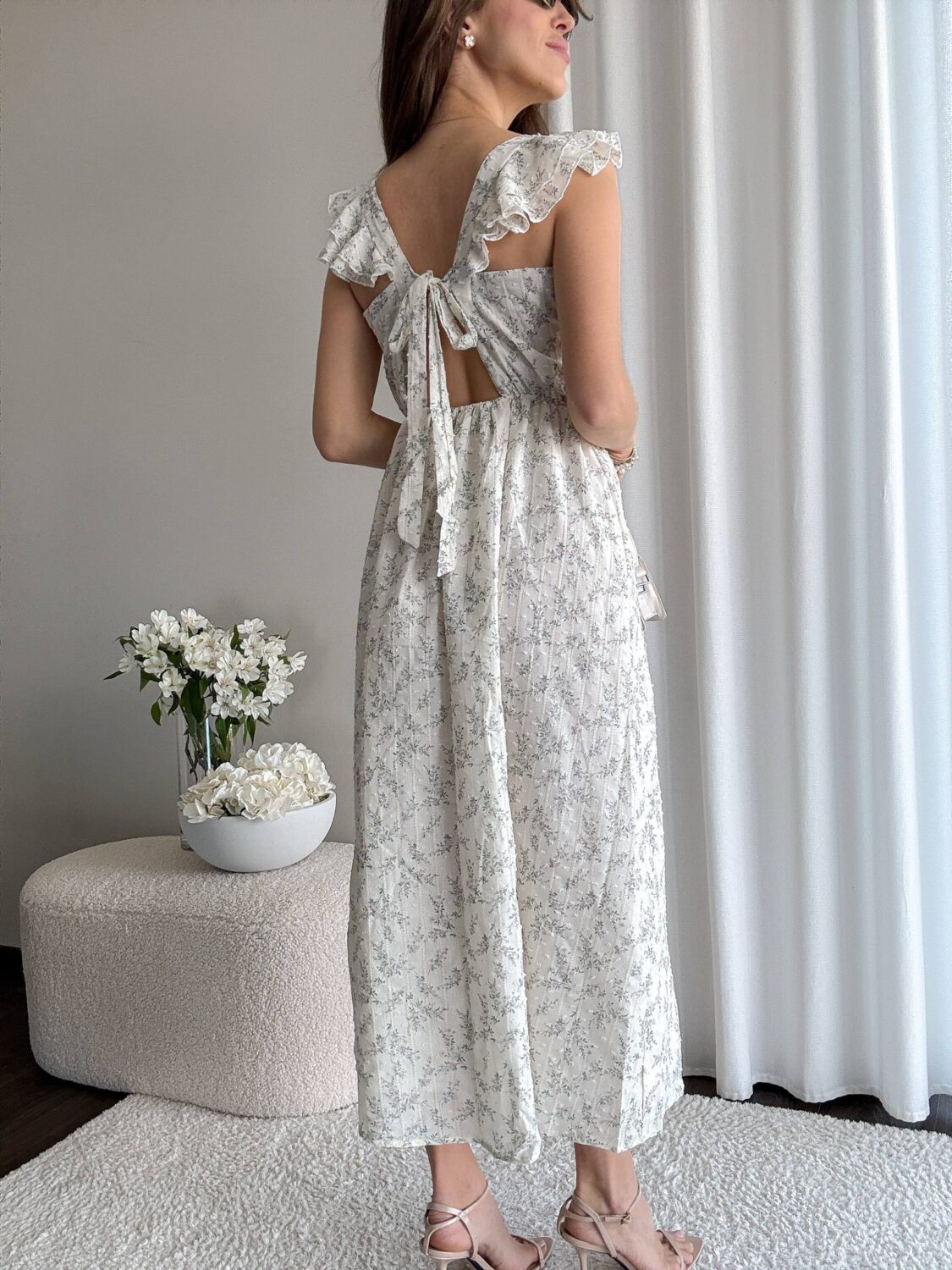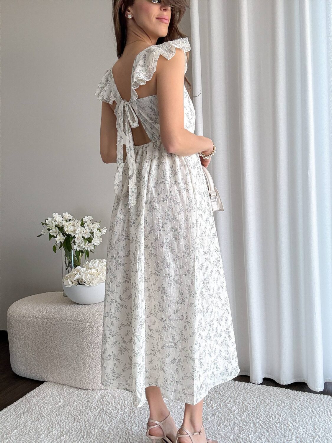 Sukienka posiada odkryte plecy oraz wiązanie z tyłu.