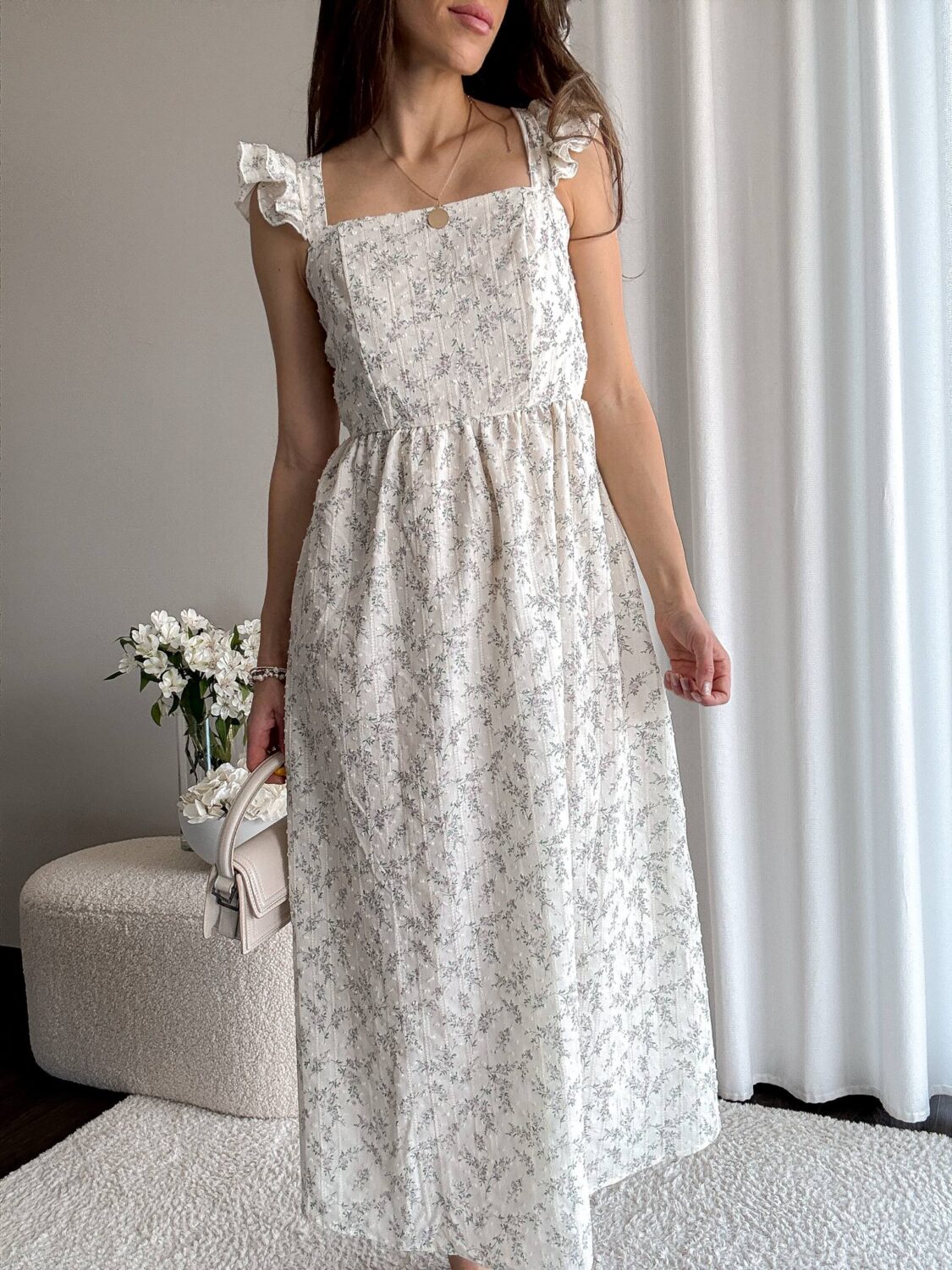 Sukienka o długości midi na ramiączkach z falbanką i rozszerzanym dołem.