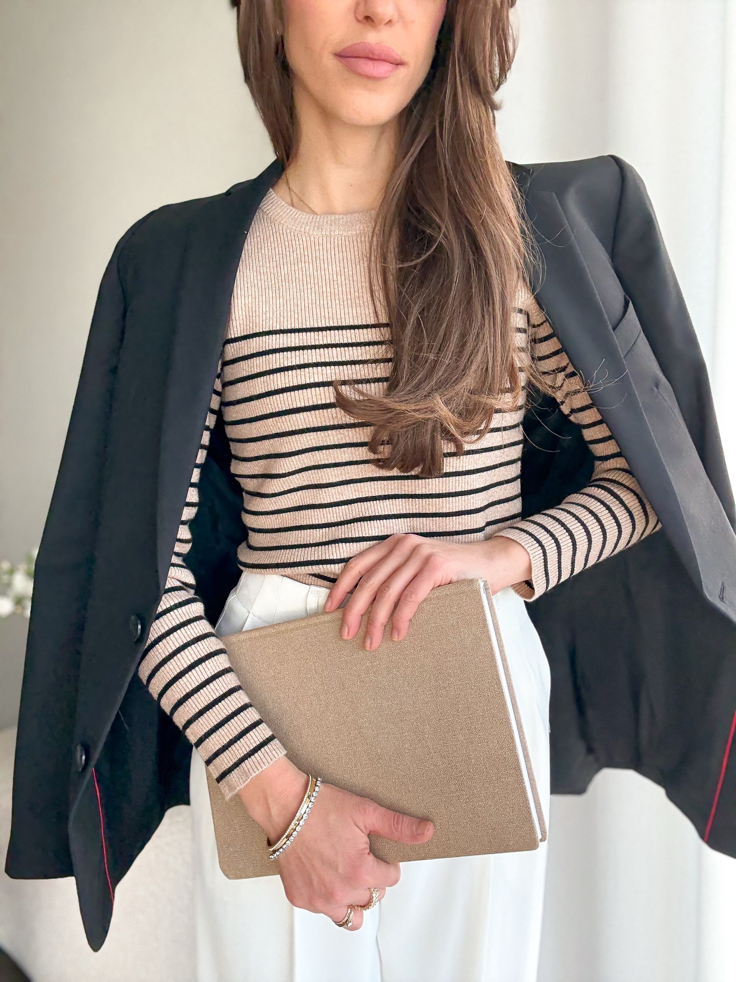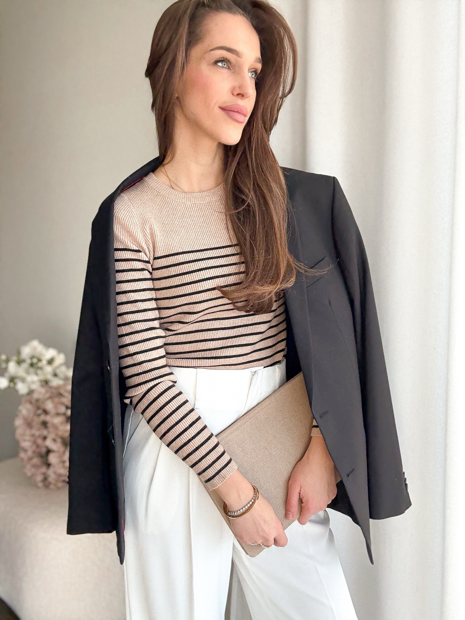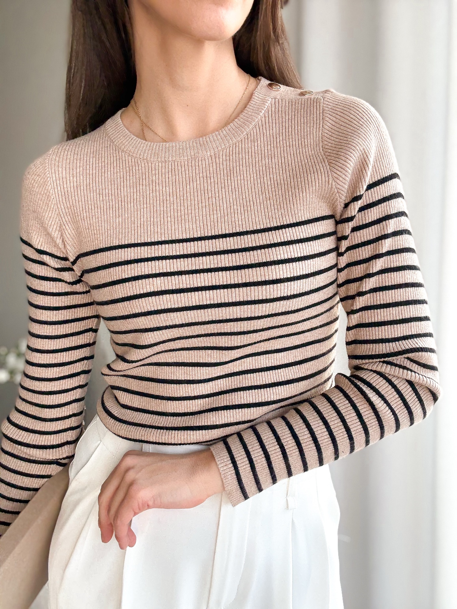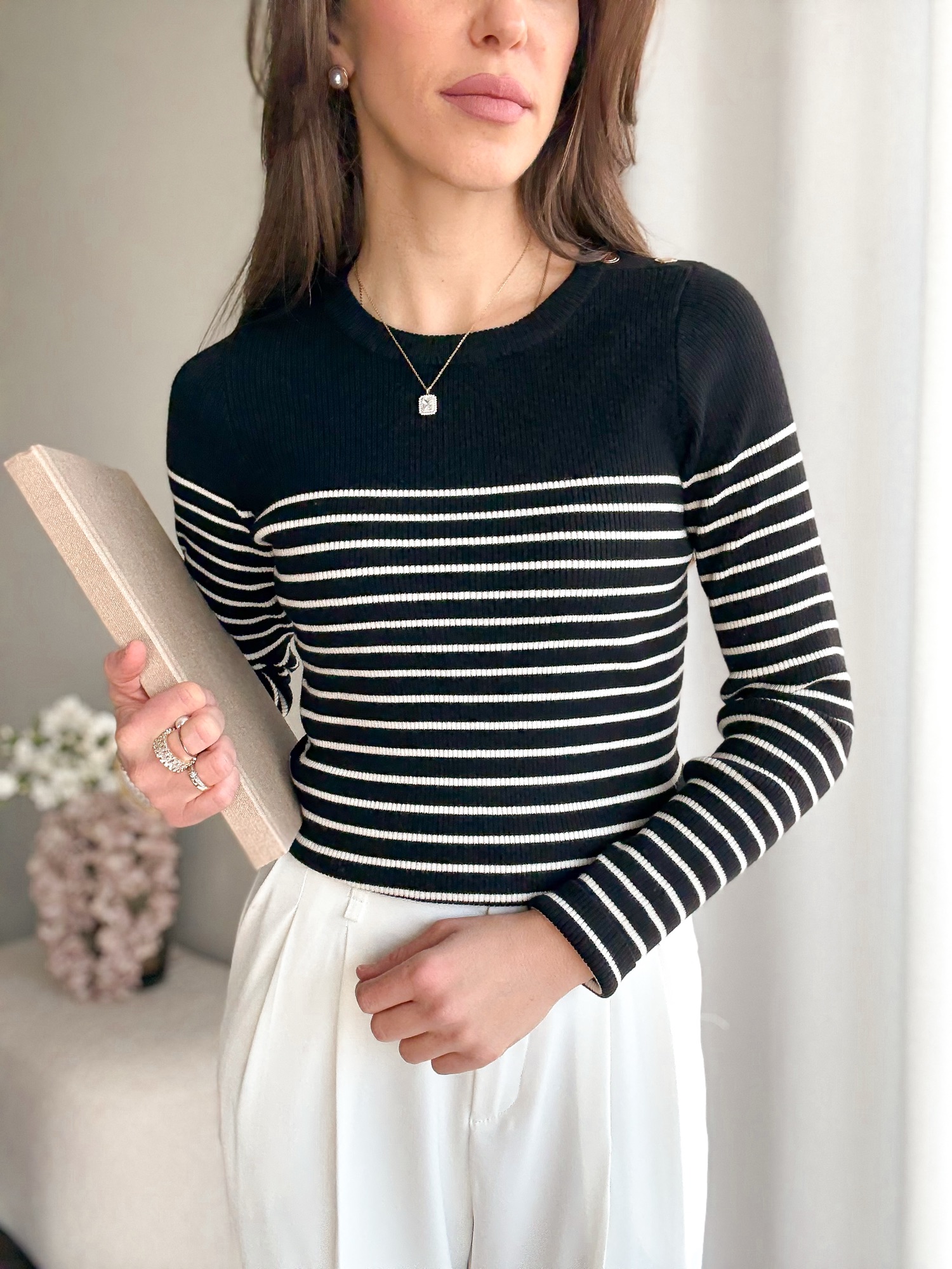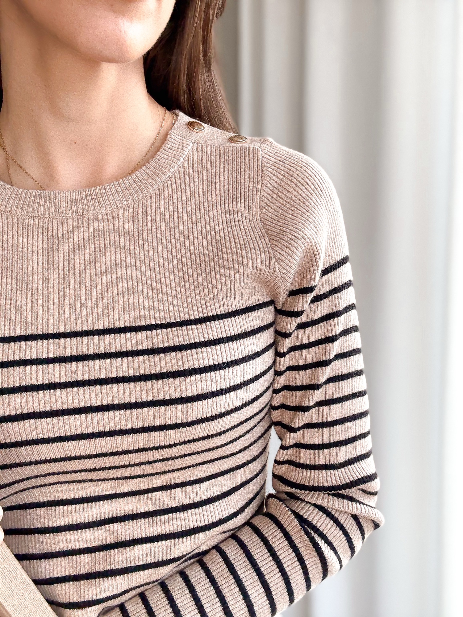 Sweter z delikatnej i przyjemnej dzianiny w wąskie paski.