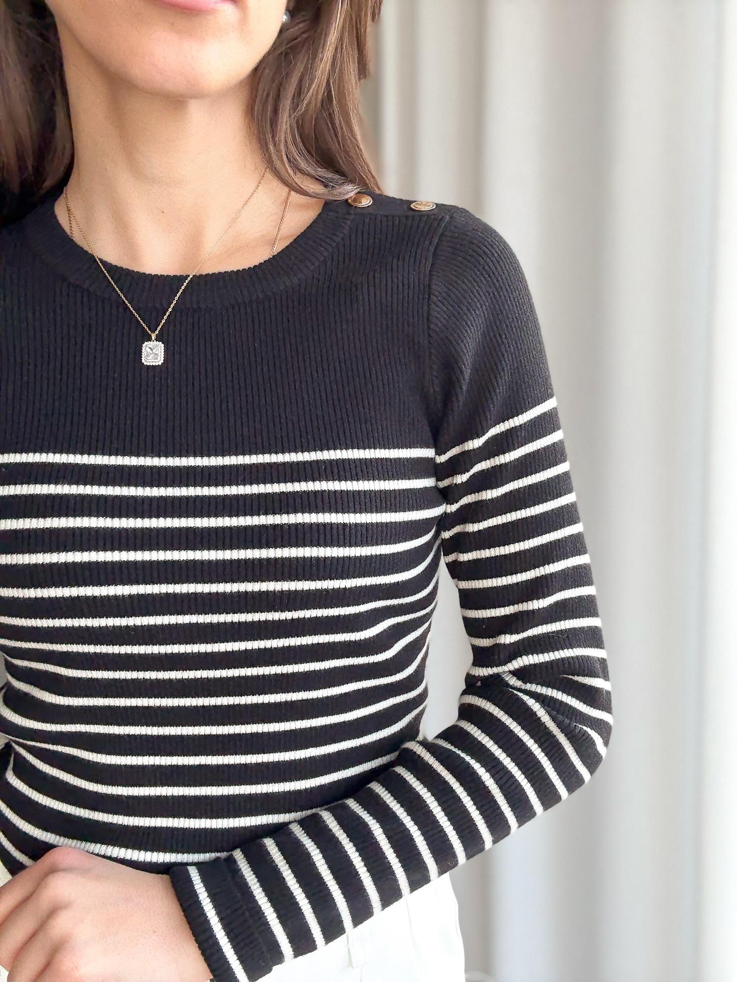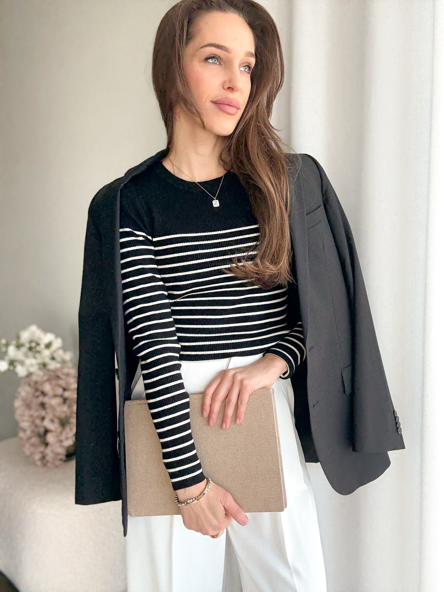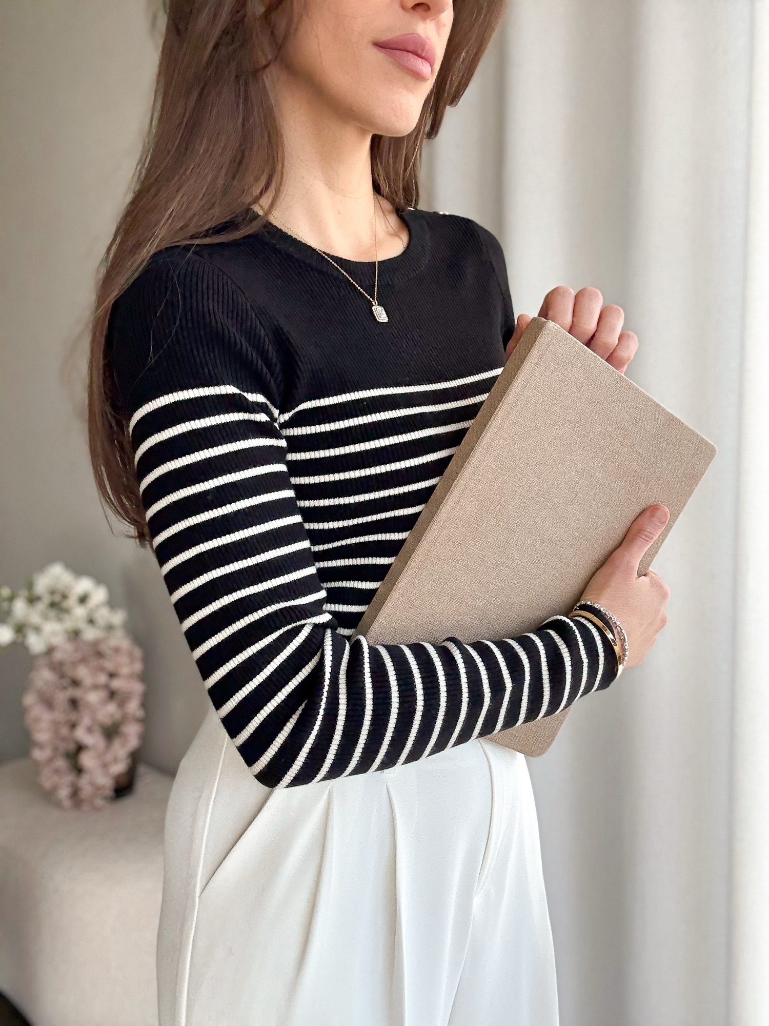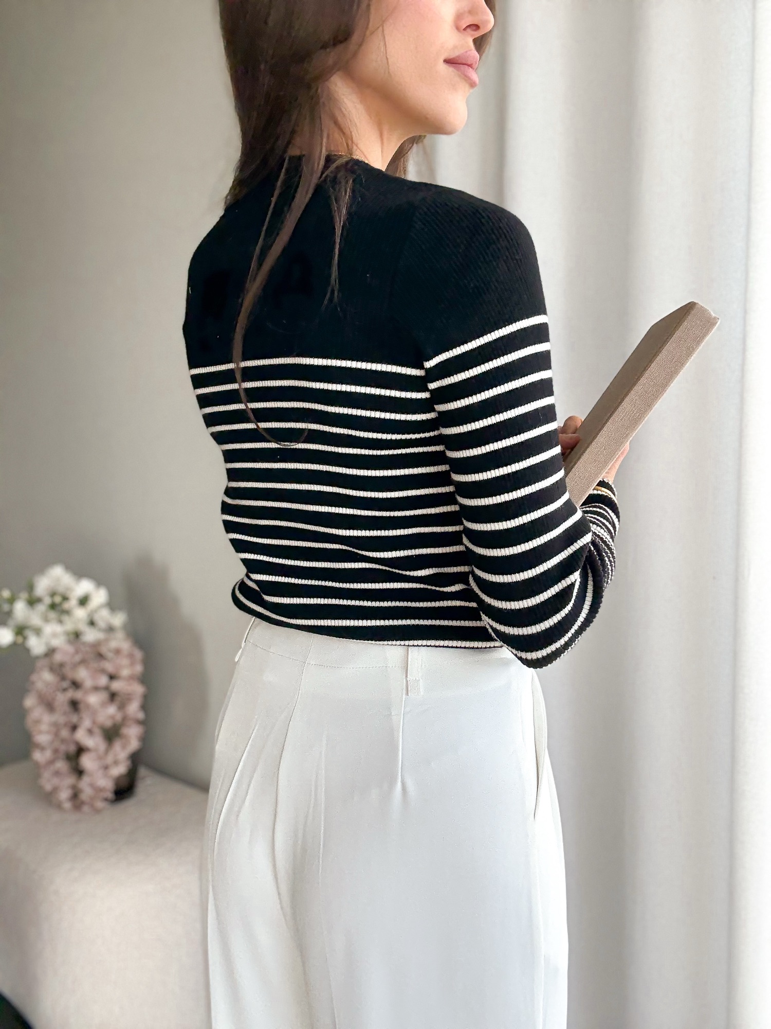 Sweter z delikatnej i przyjemnej dzianiny w wąskie paski.