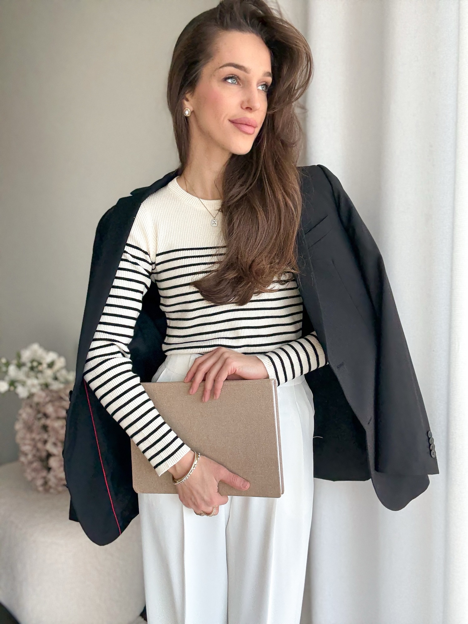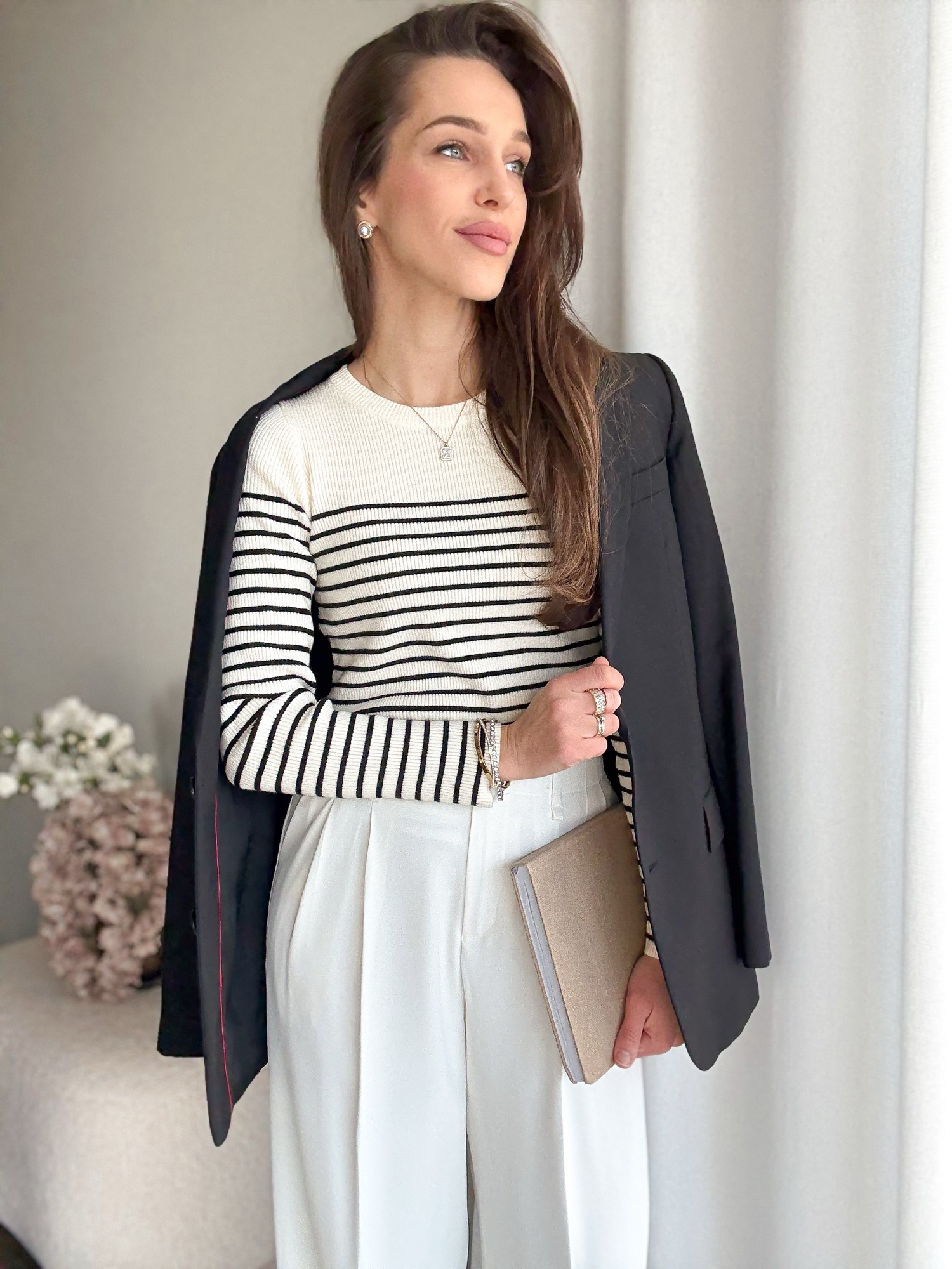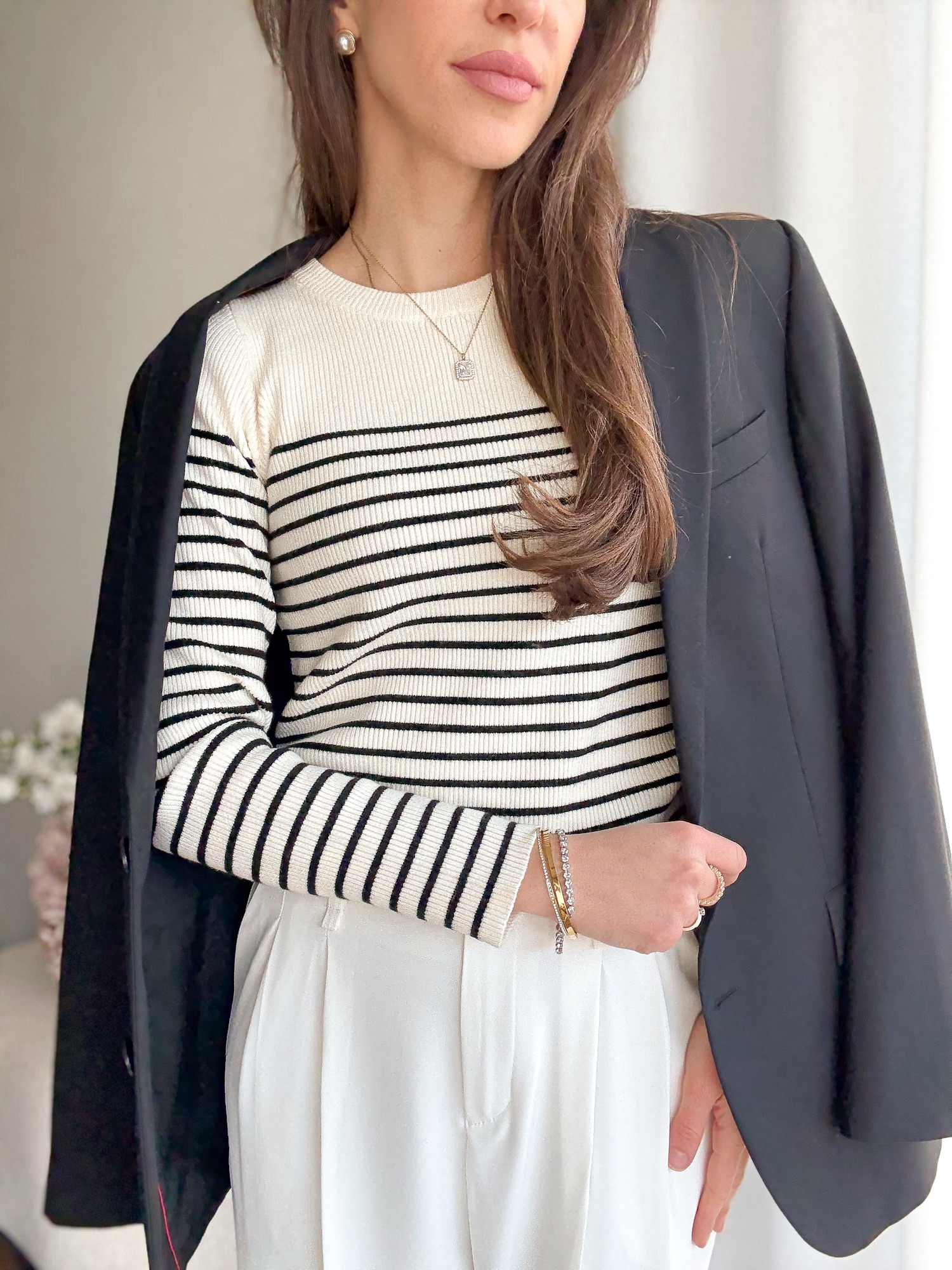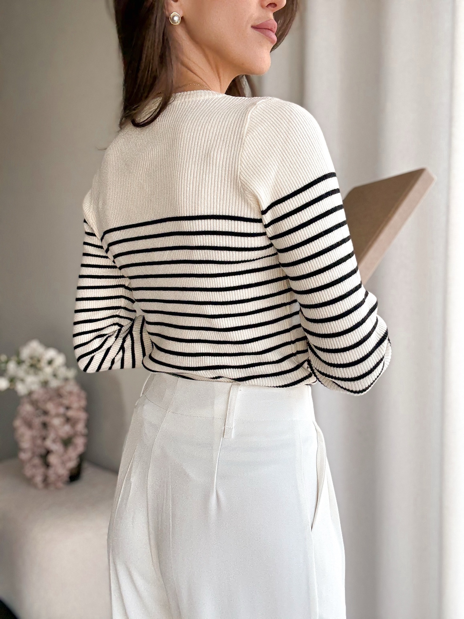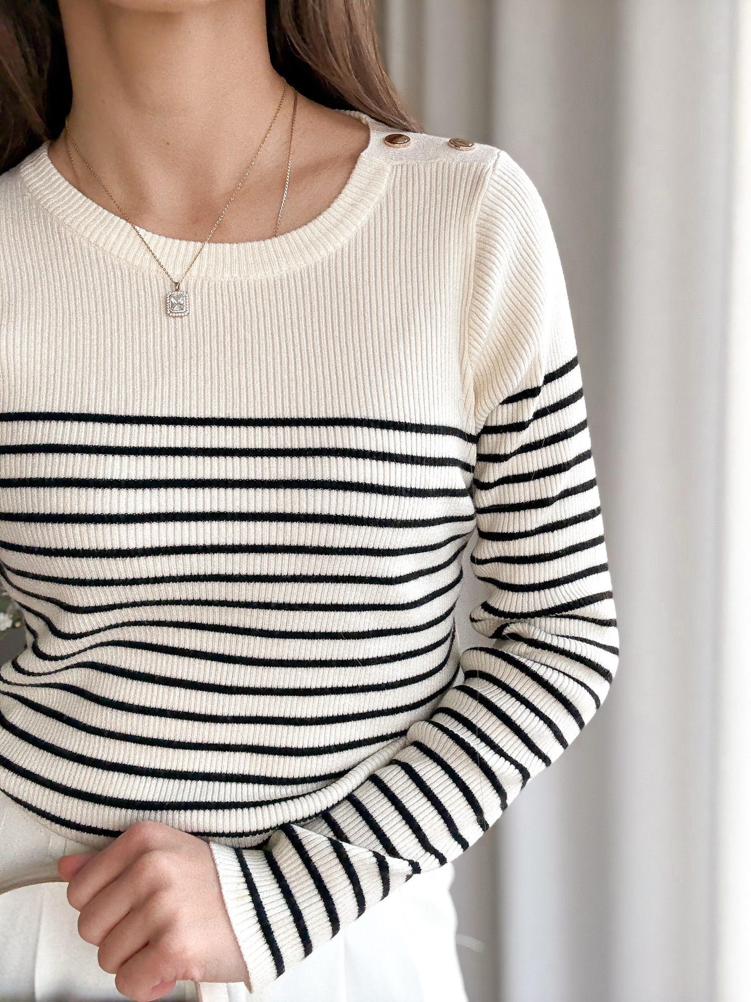 Sweter z delikatnej i przyjemnej dzianiny w wąskie paski.