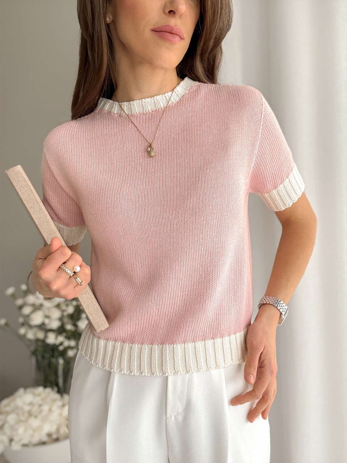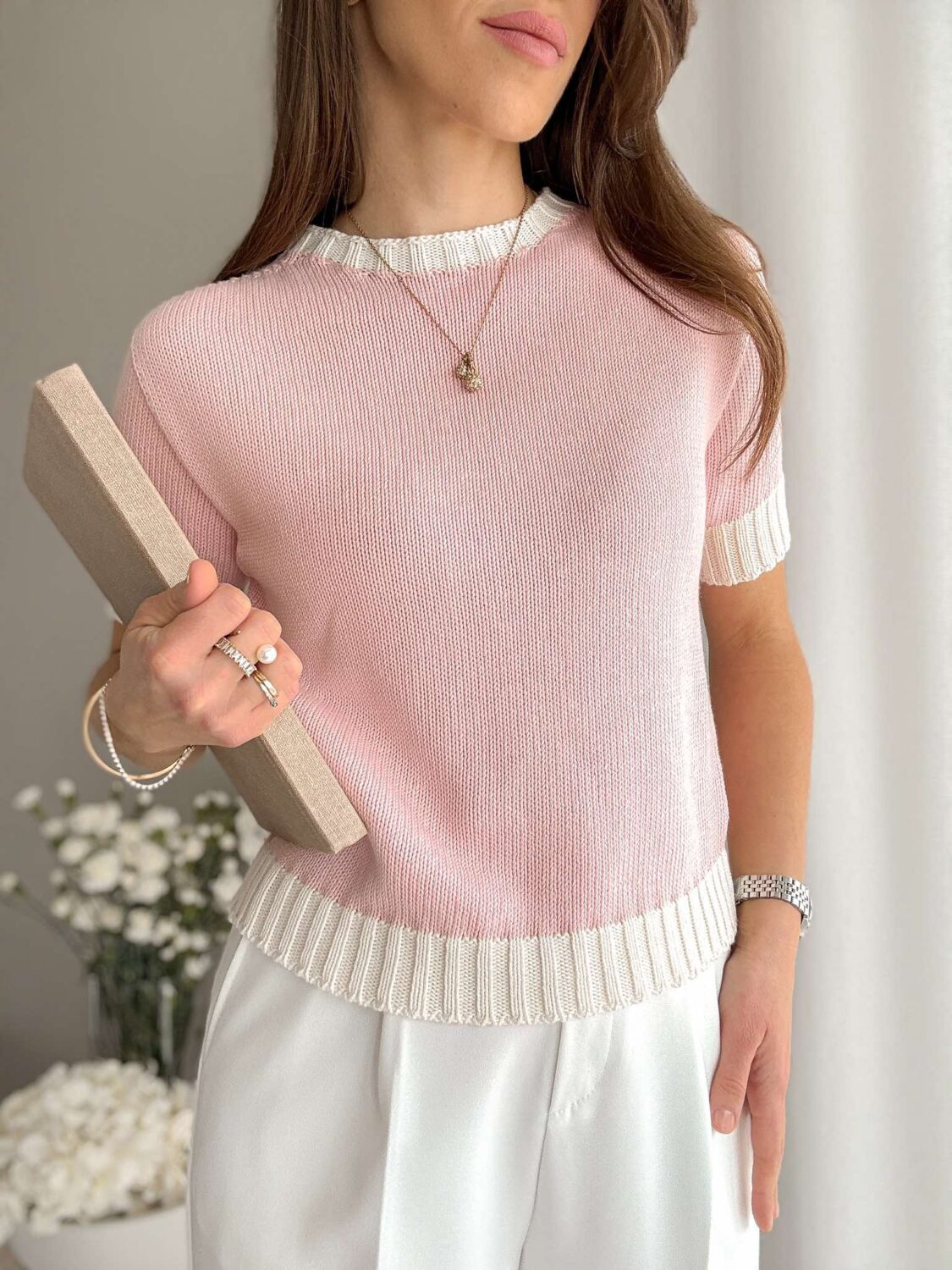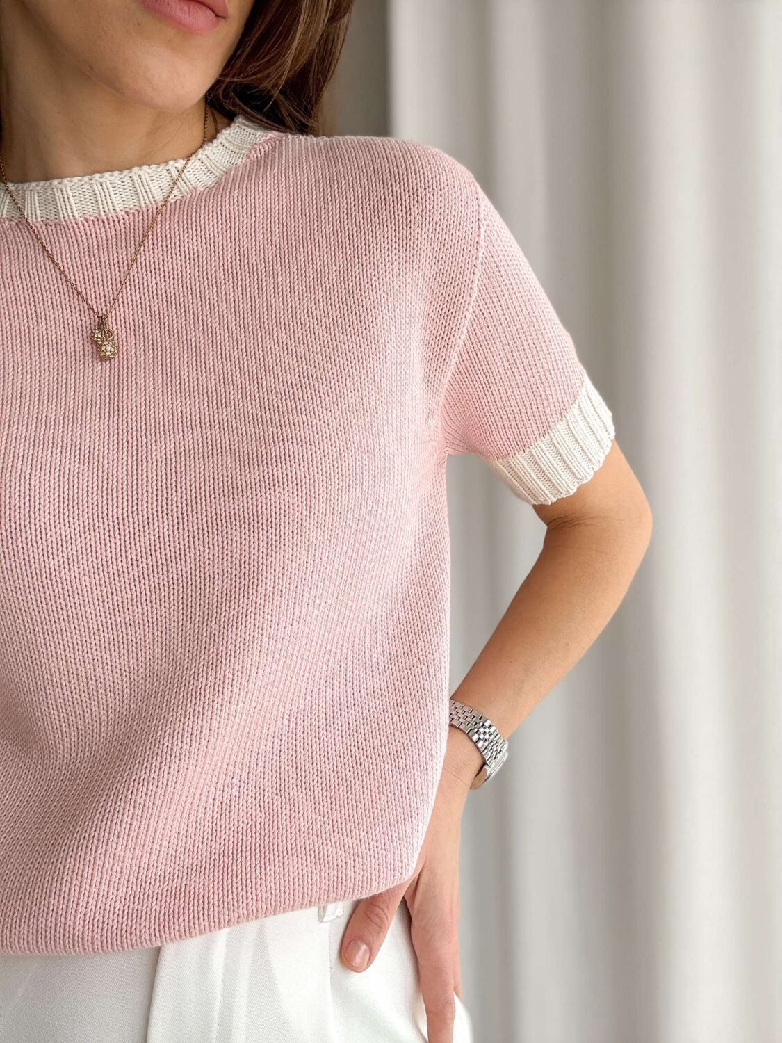 Basicowy, mięsisty sweter z okrągłym dekoltem i krótkim rękawem.
