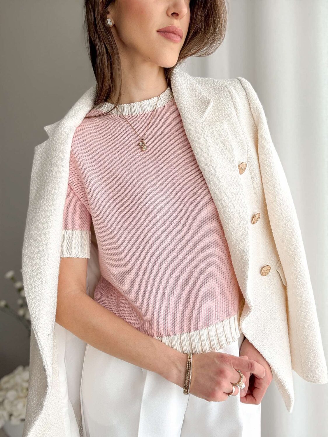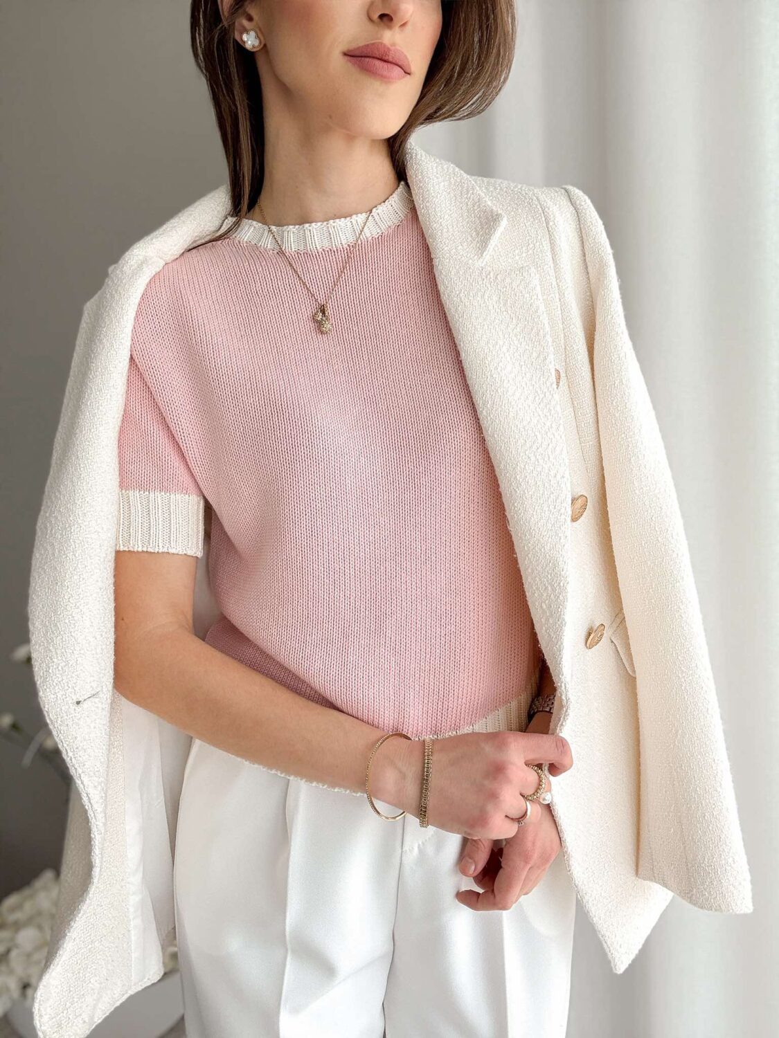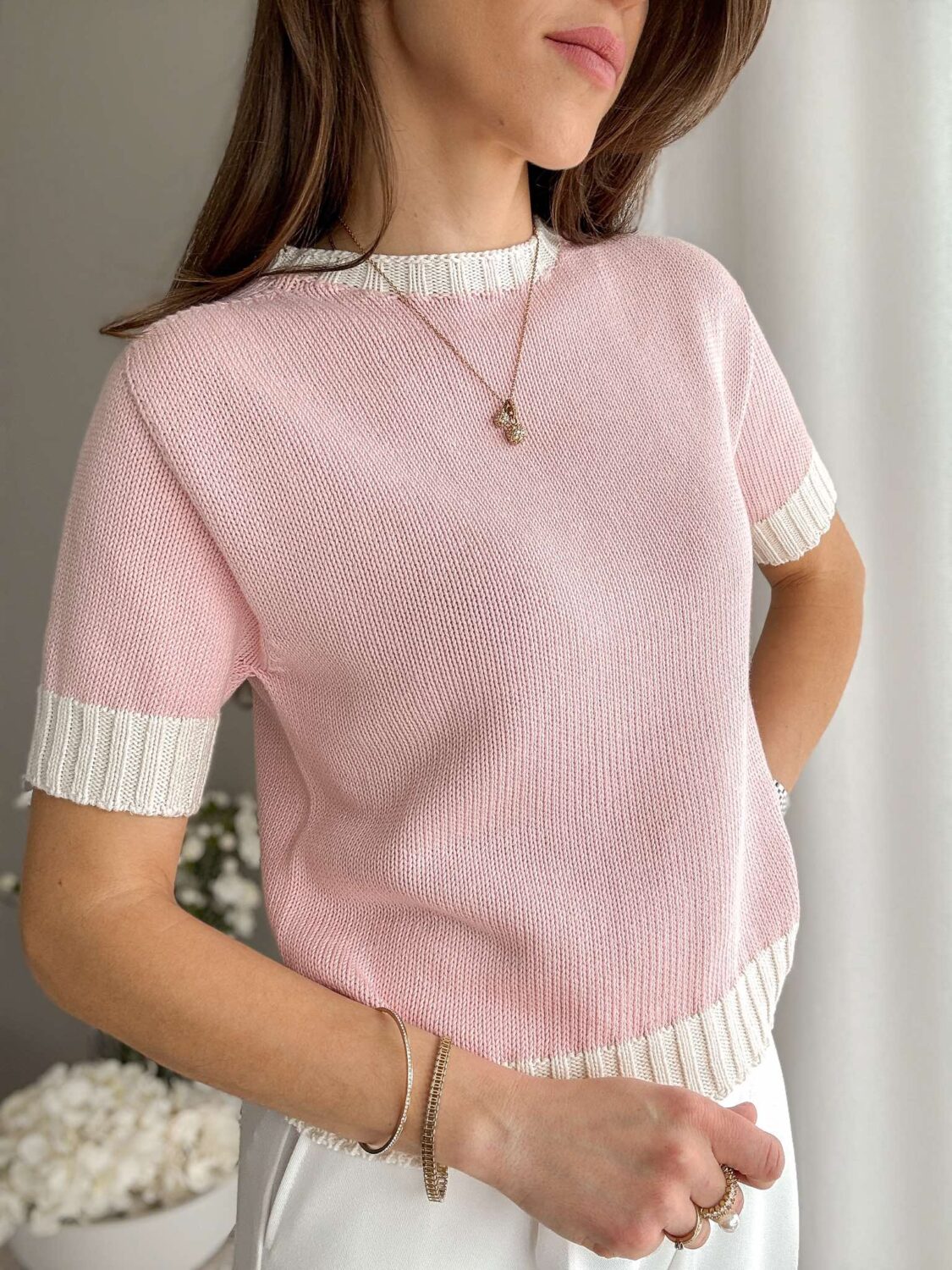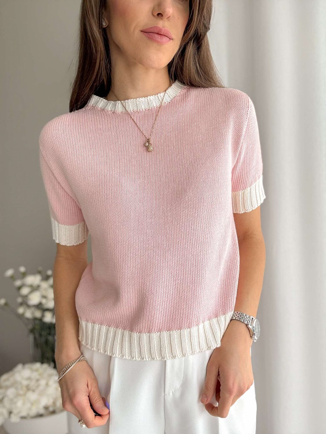 Basicowy, mięsisty sweter z okrągłym dekoltem i krótkim rękawem.