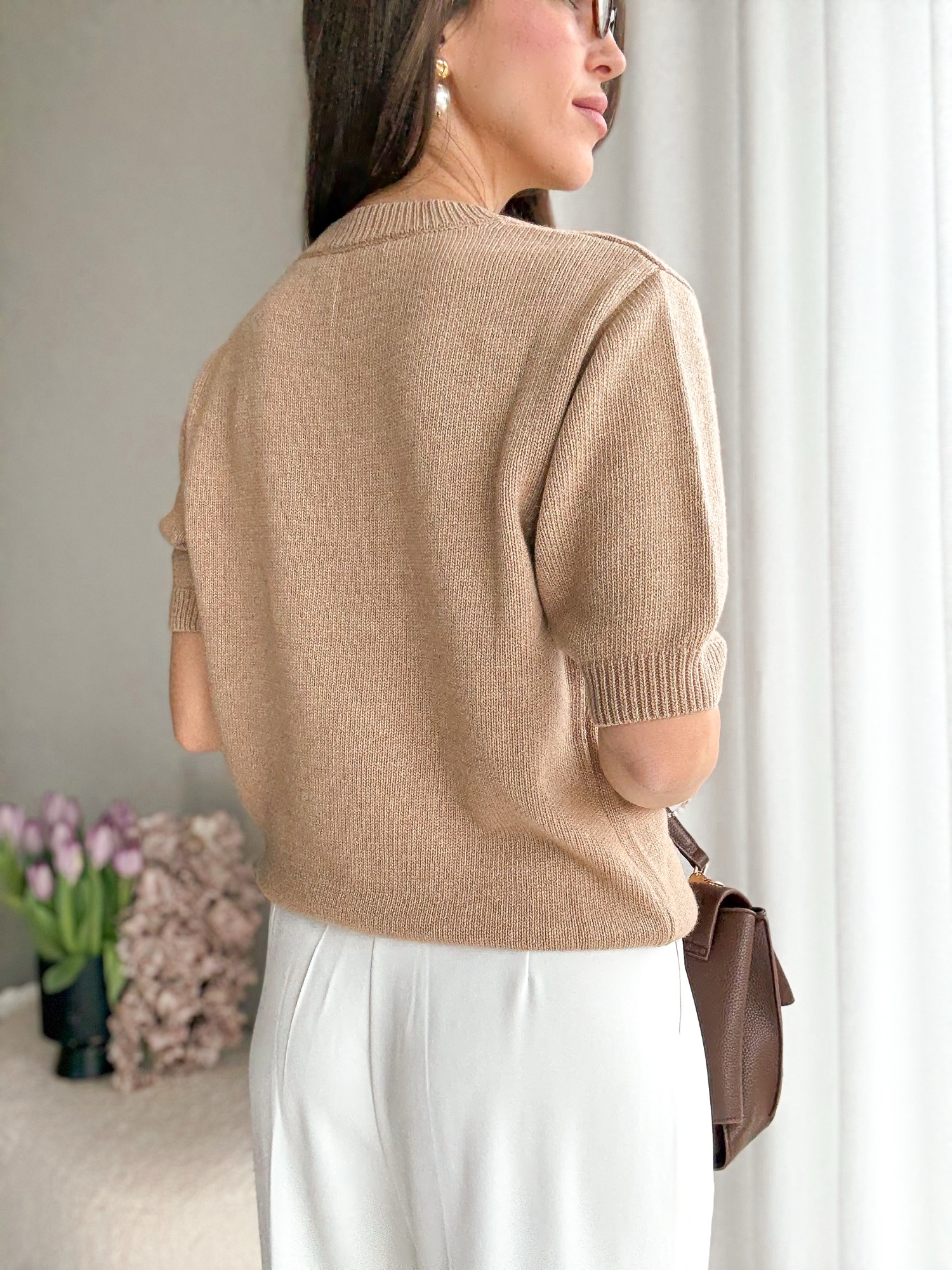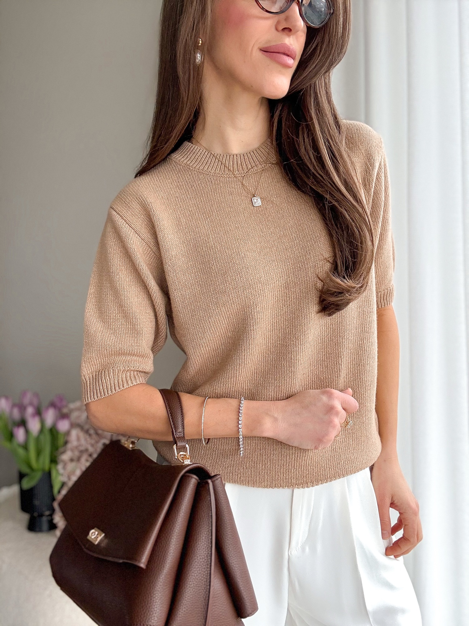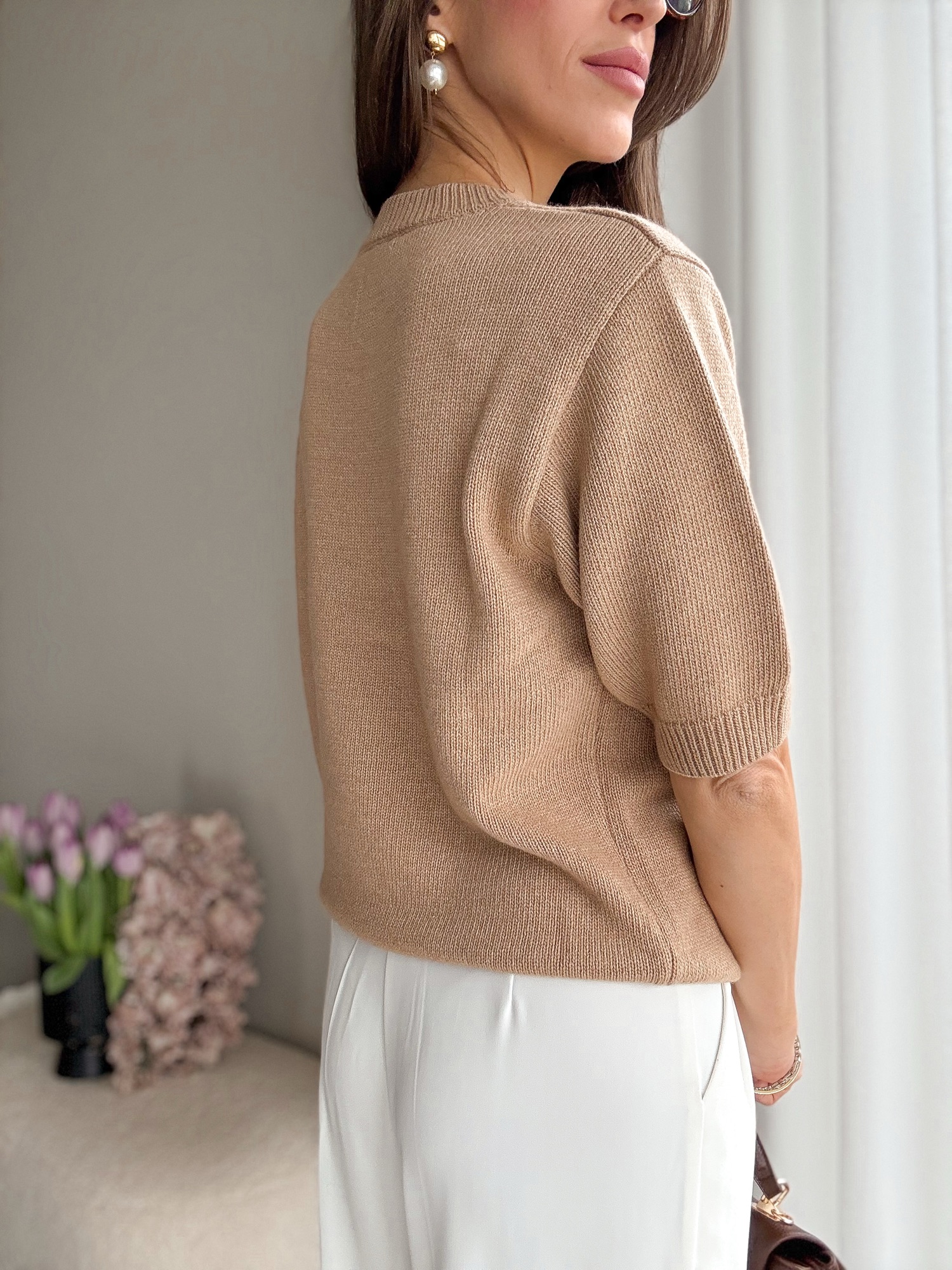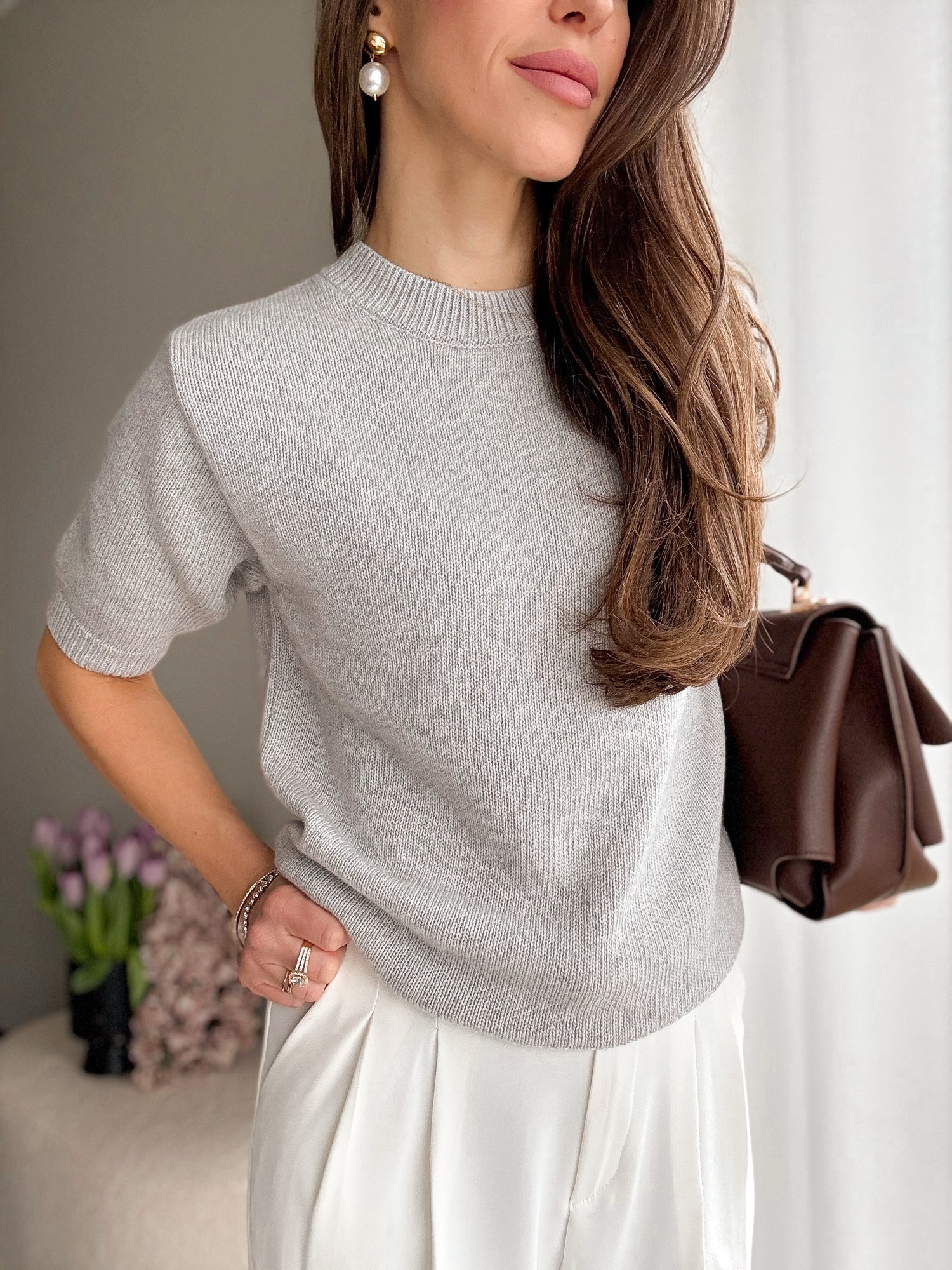 Basicowy, mięsisty sweter z okrągłym dekoltem i krótkim rękawem wykonany z wełny merino.