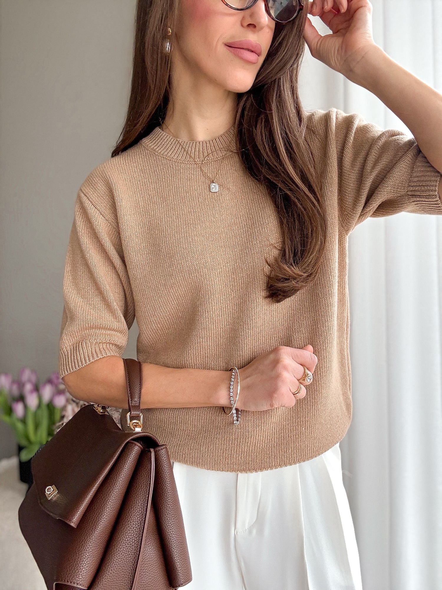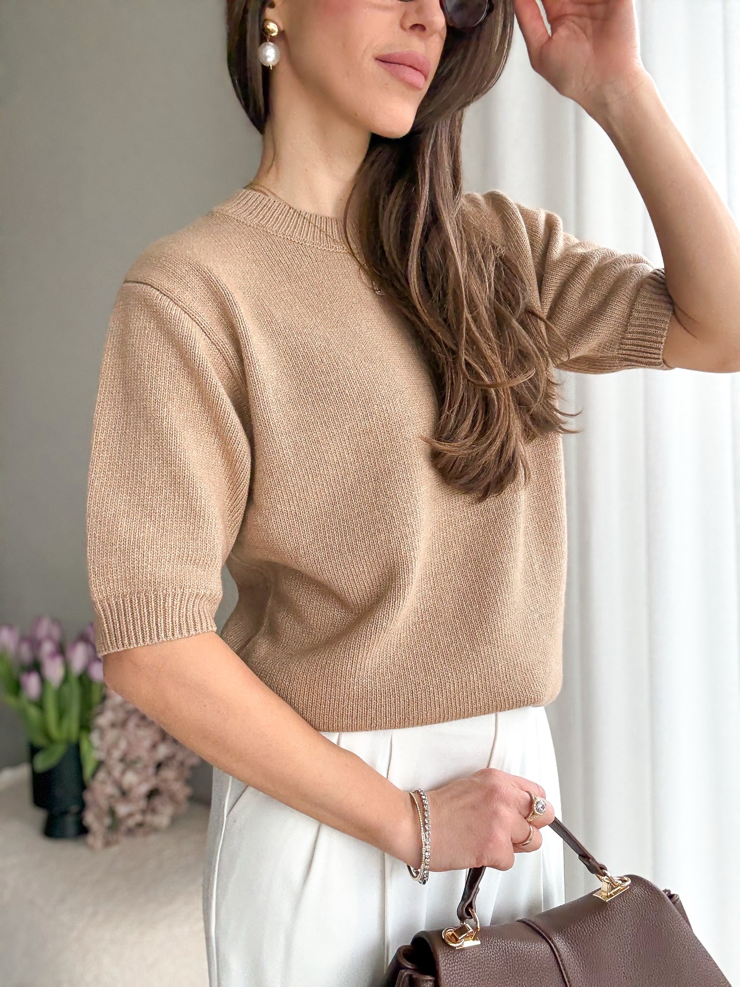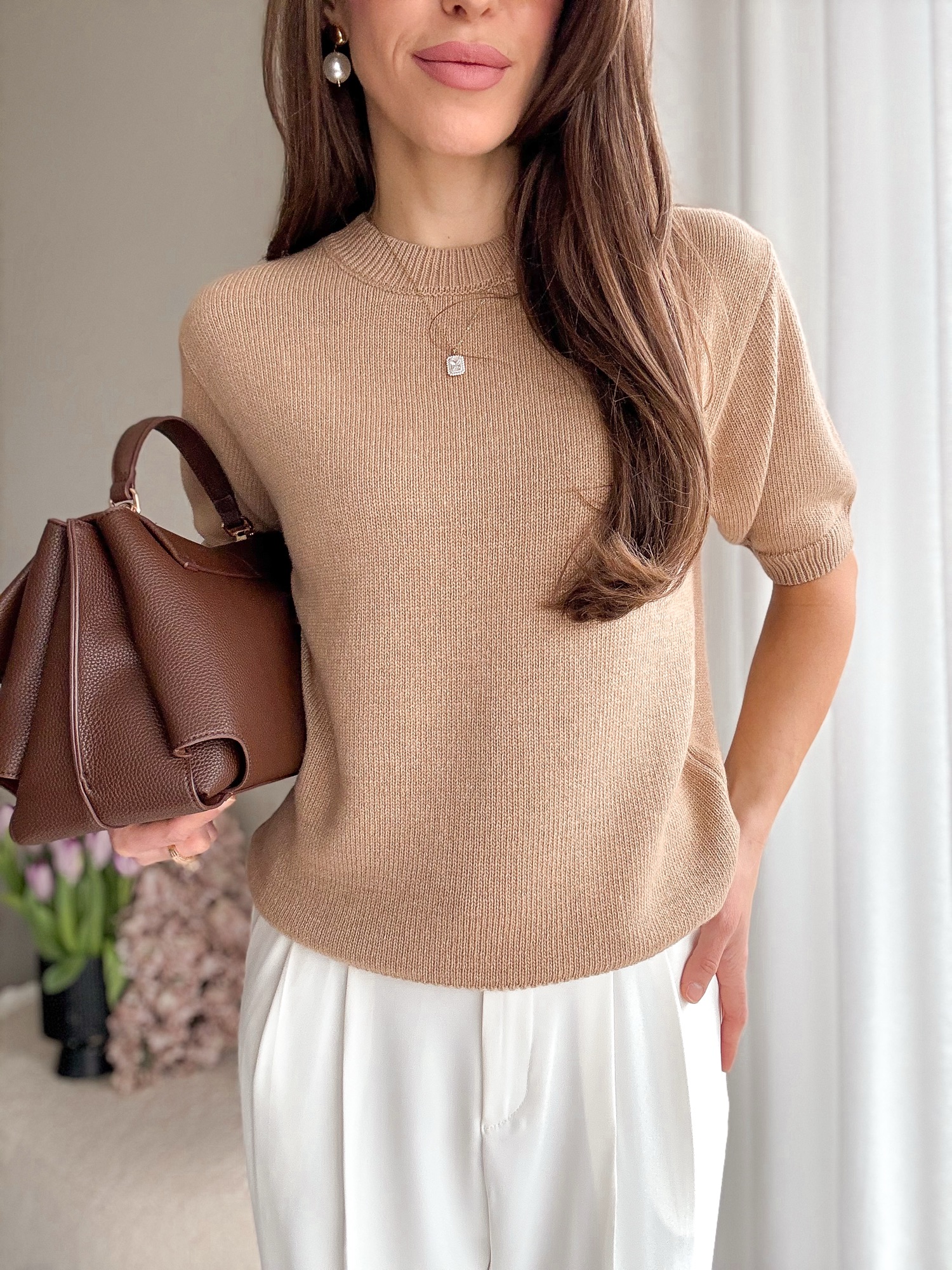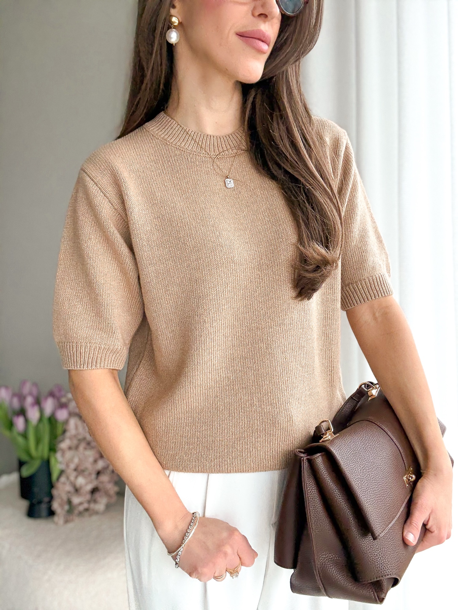 Basicowy, mięsisty sweter z okrągłym dekoltem i krótkim rękawem wykonany z wełny merino.