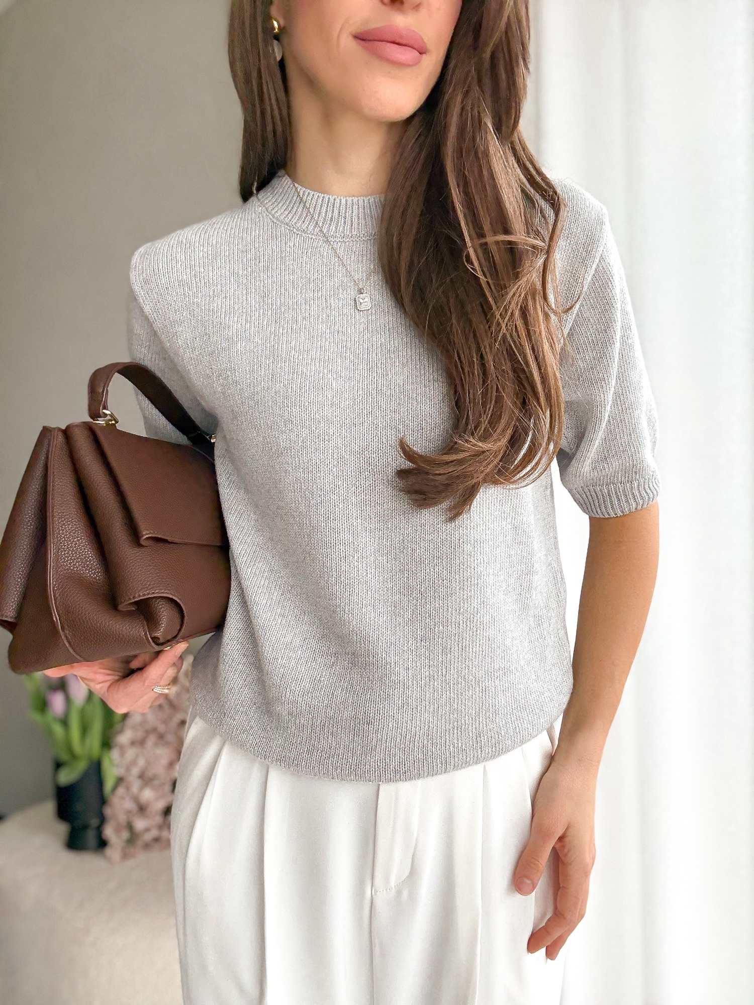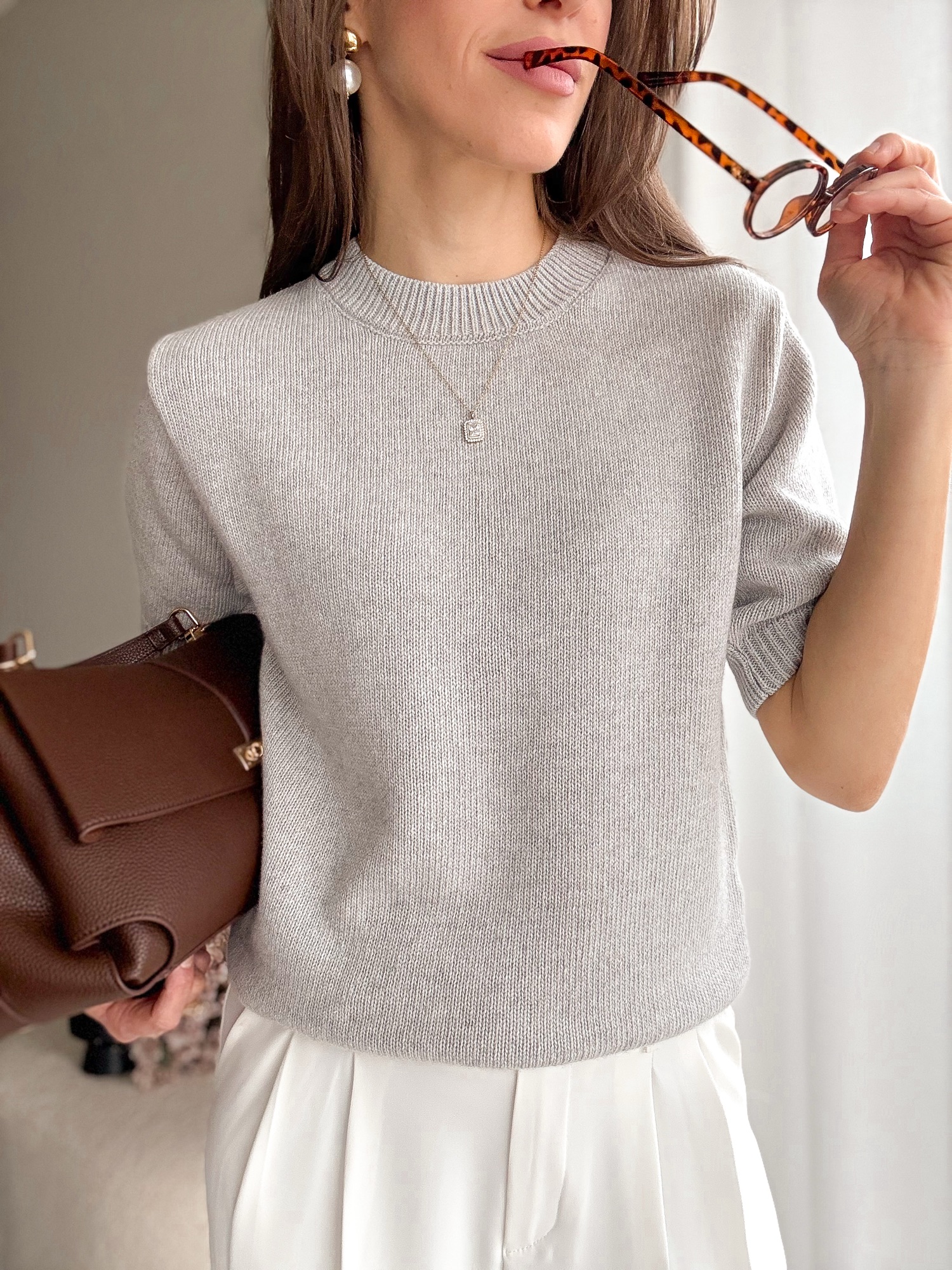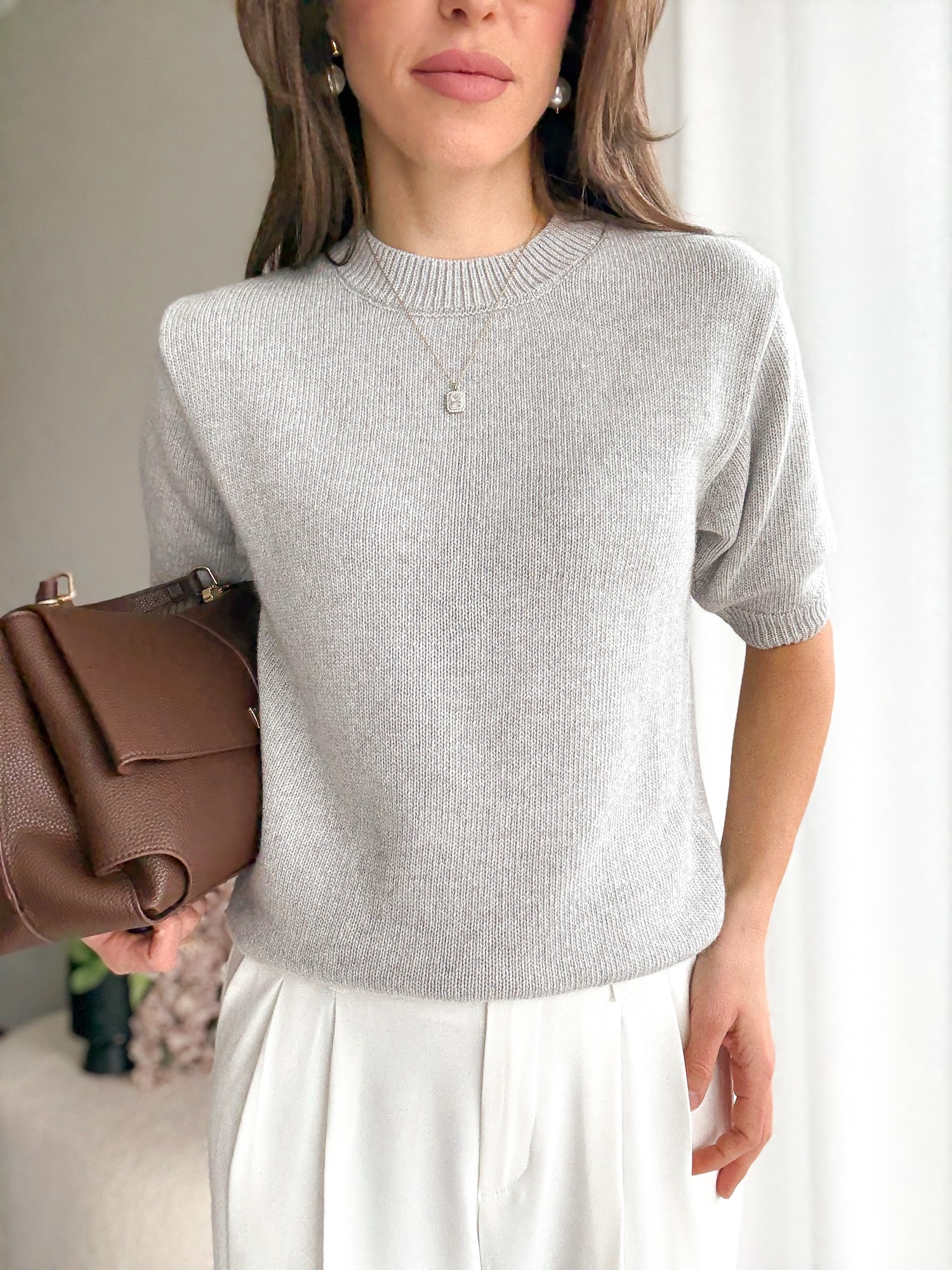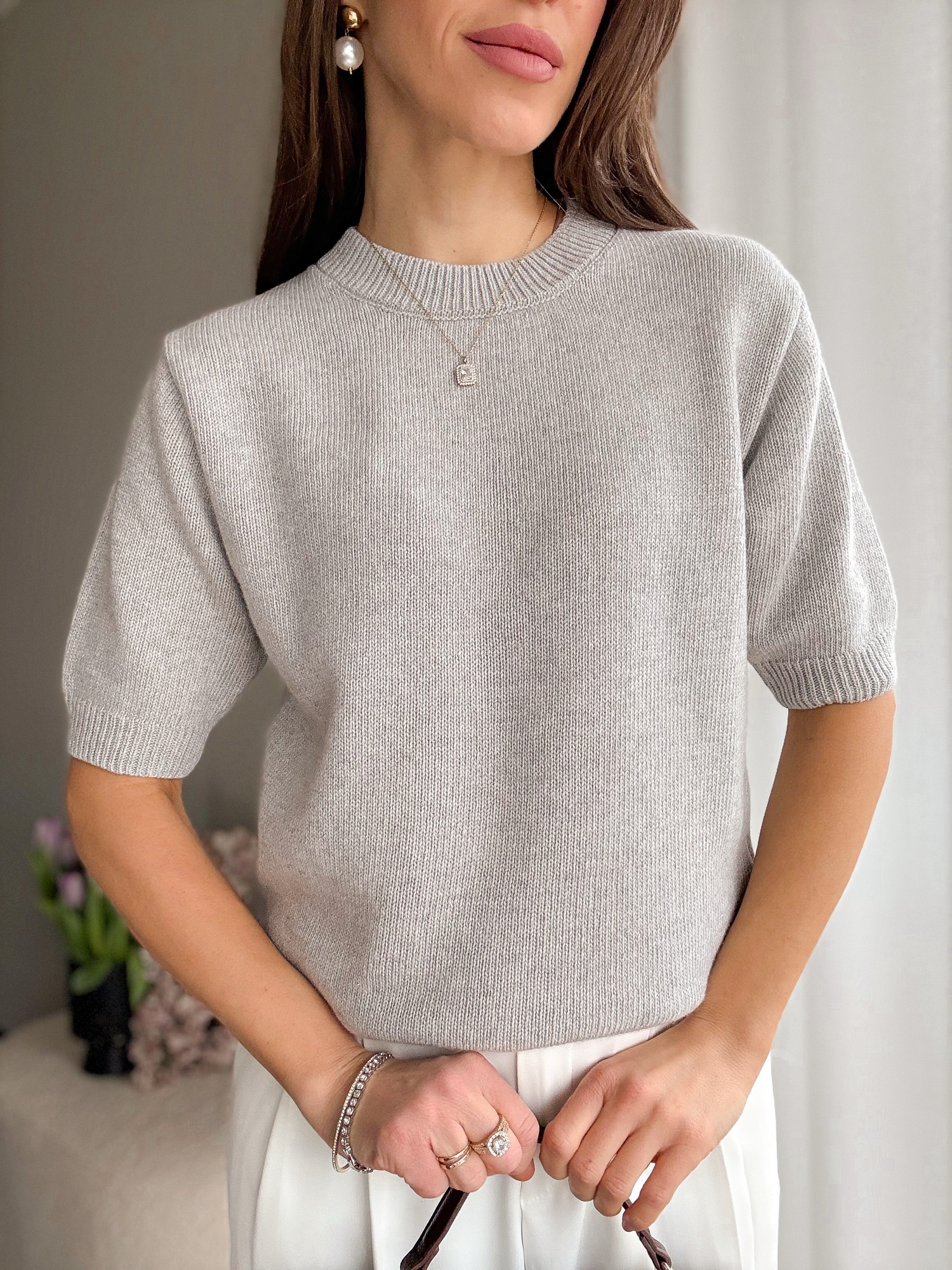 Basicowy, mięsisty sweter z okrągłym dekoltem i krótkim rękawem wykonany z wełny merino.