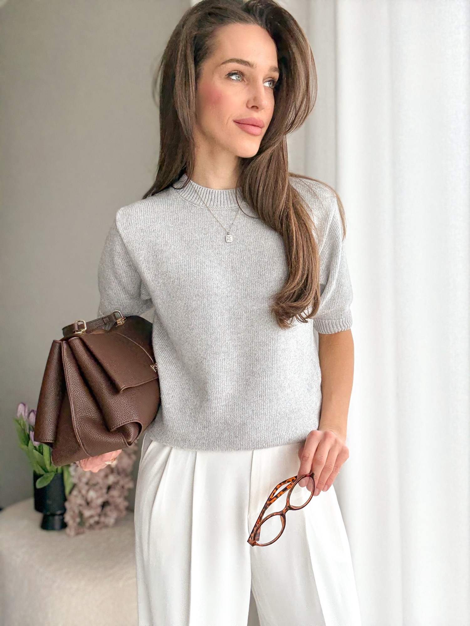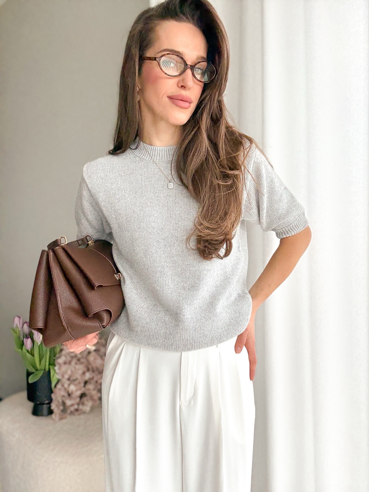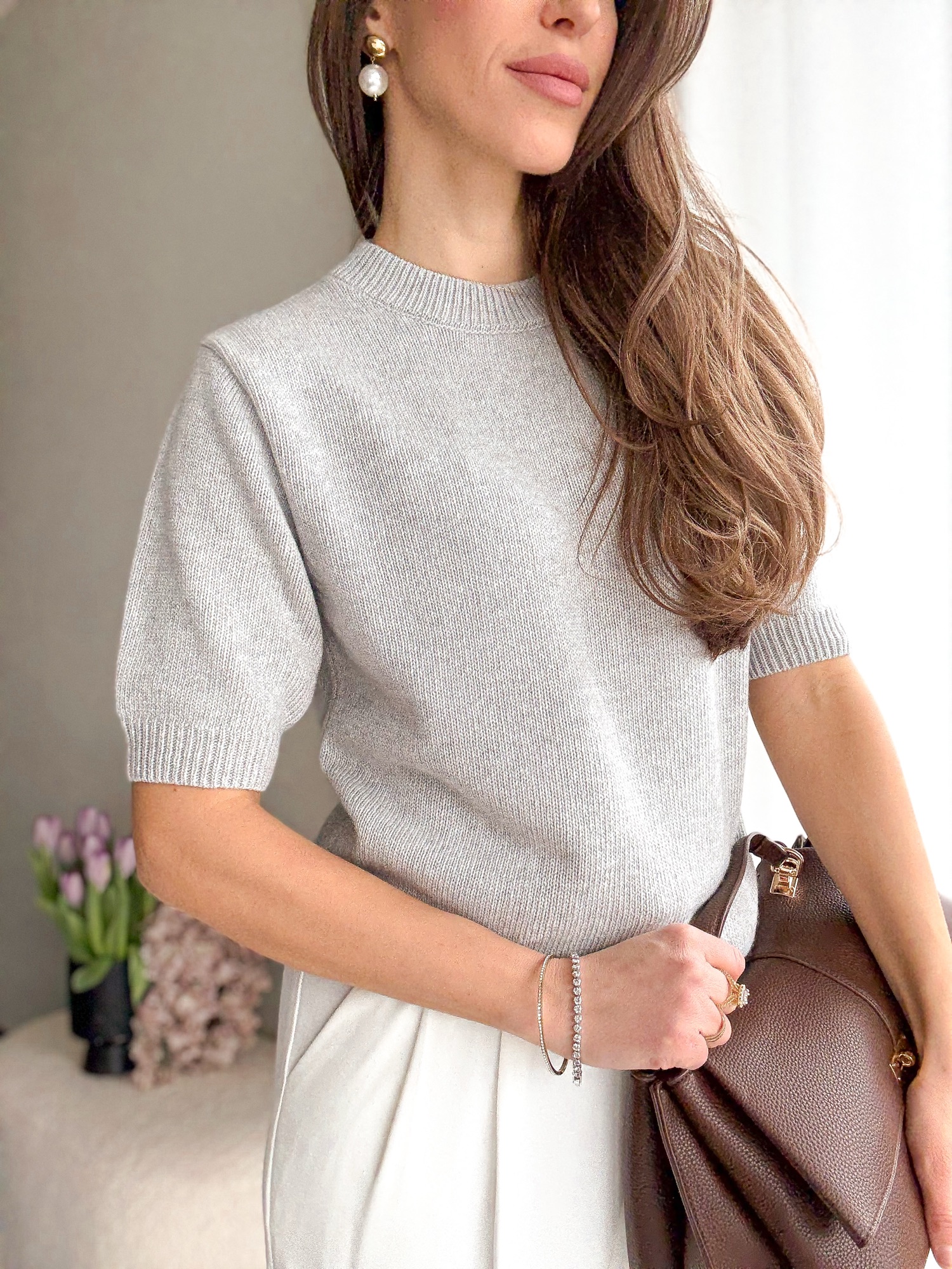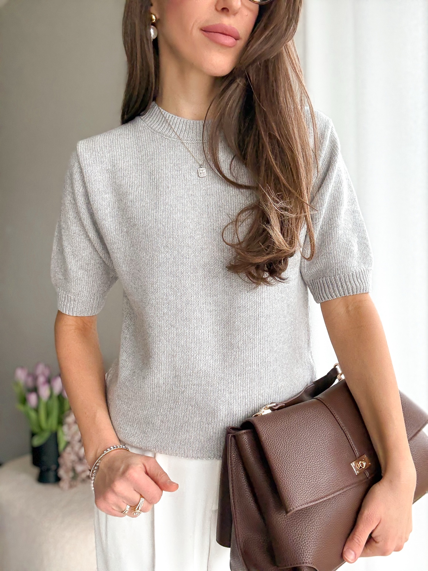 Basicowy, mięsisty sweter z okrągłym dekoltem i krótkim rękawem wykonany z wełny merino.