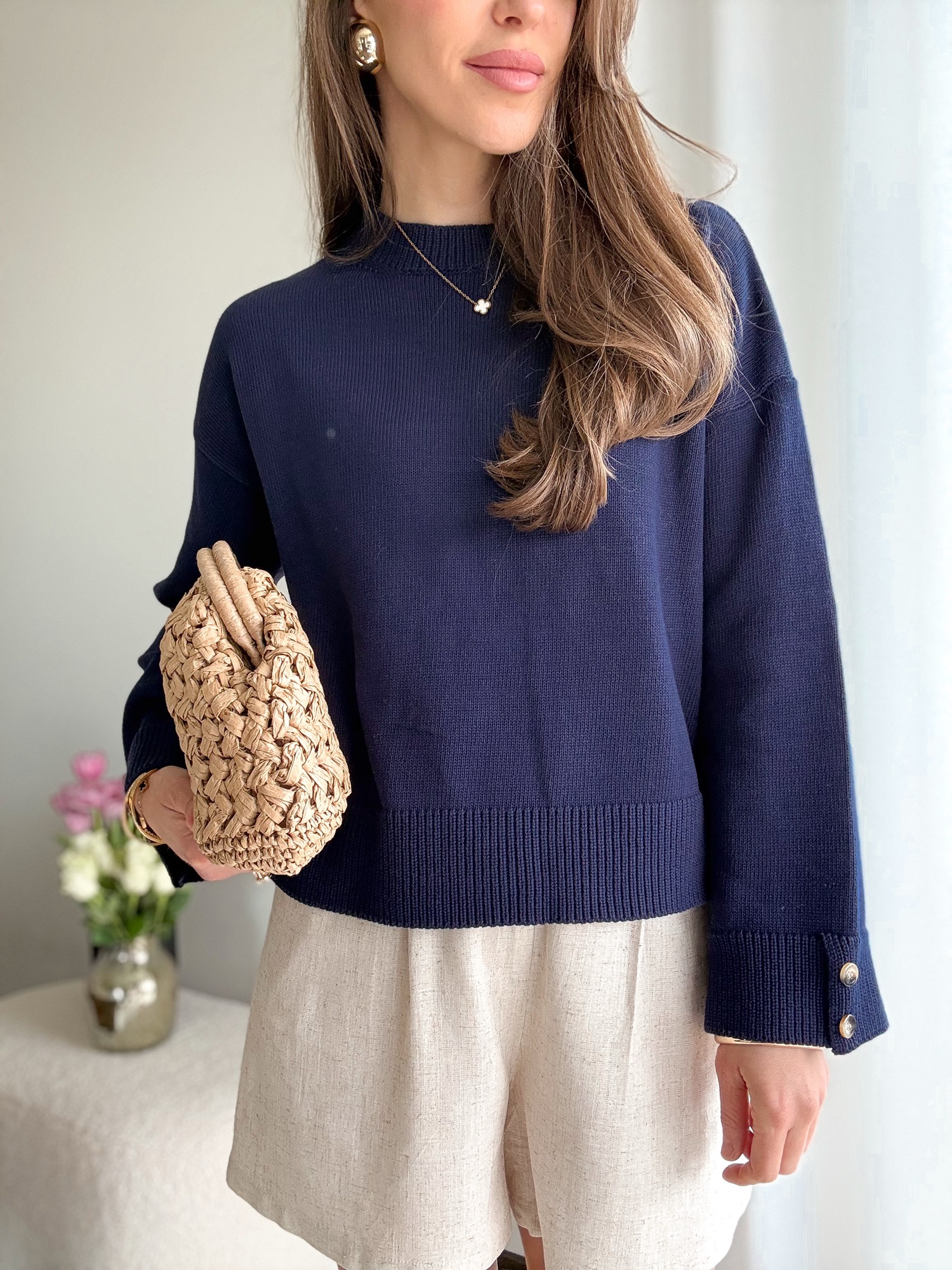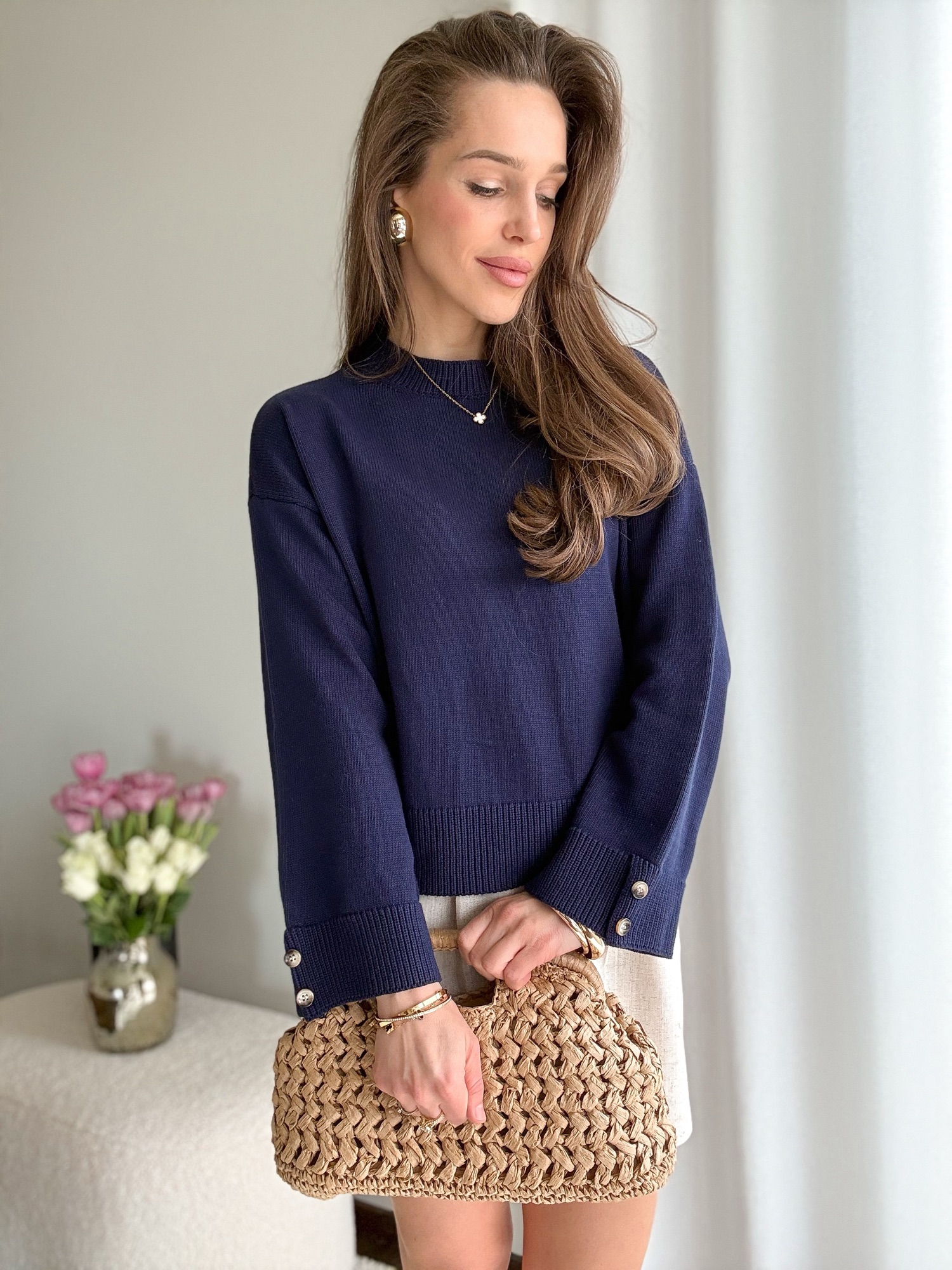 Szerokie rękawy zapinane na dwa szylkretowe guziki.