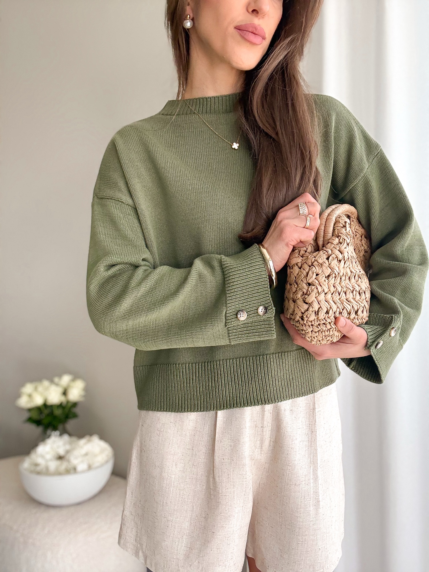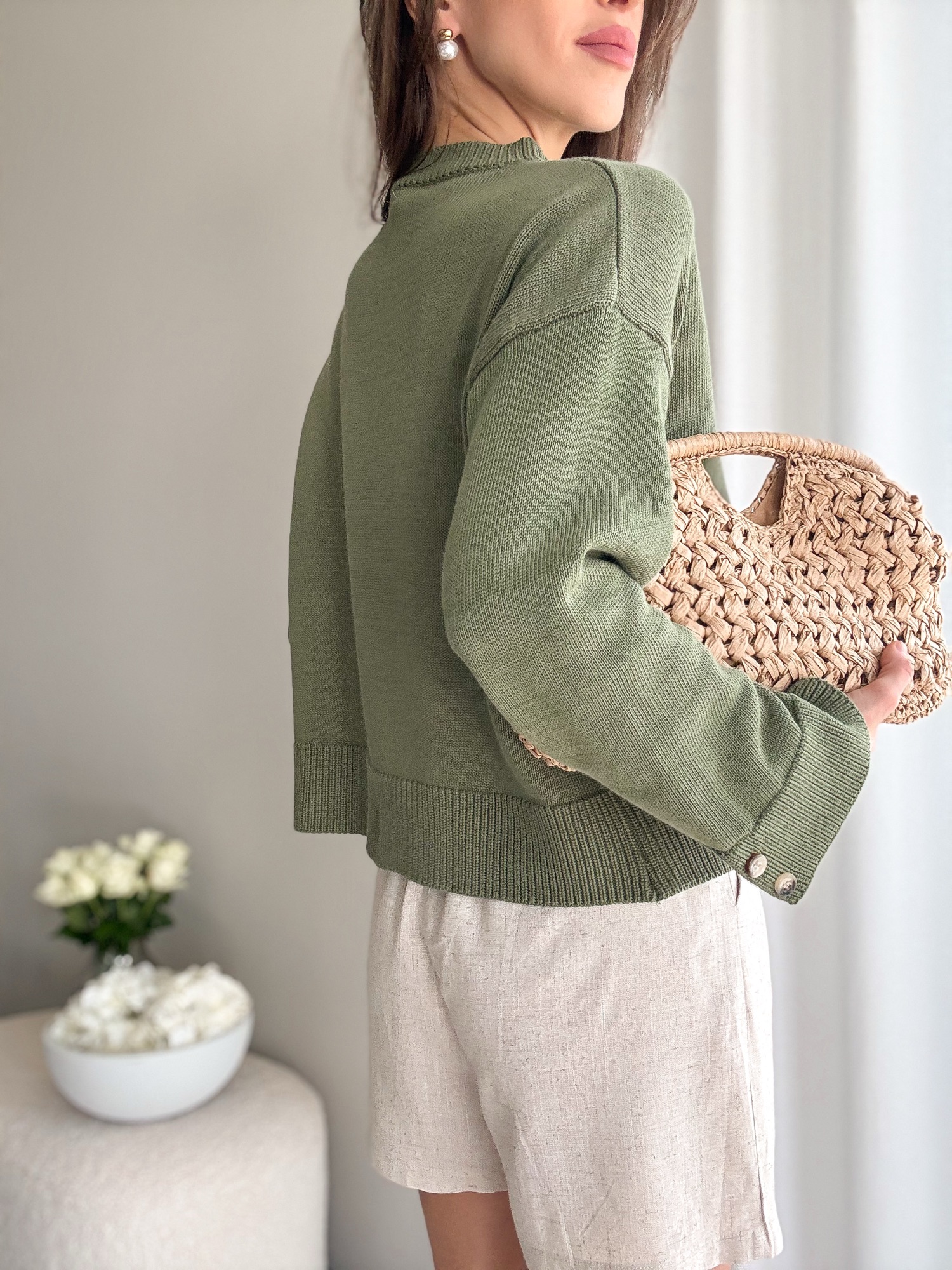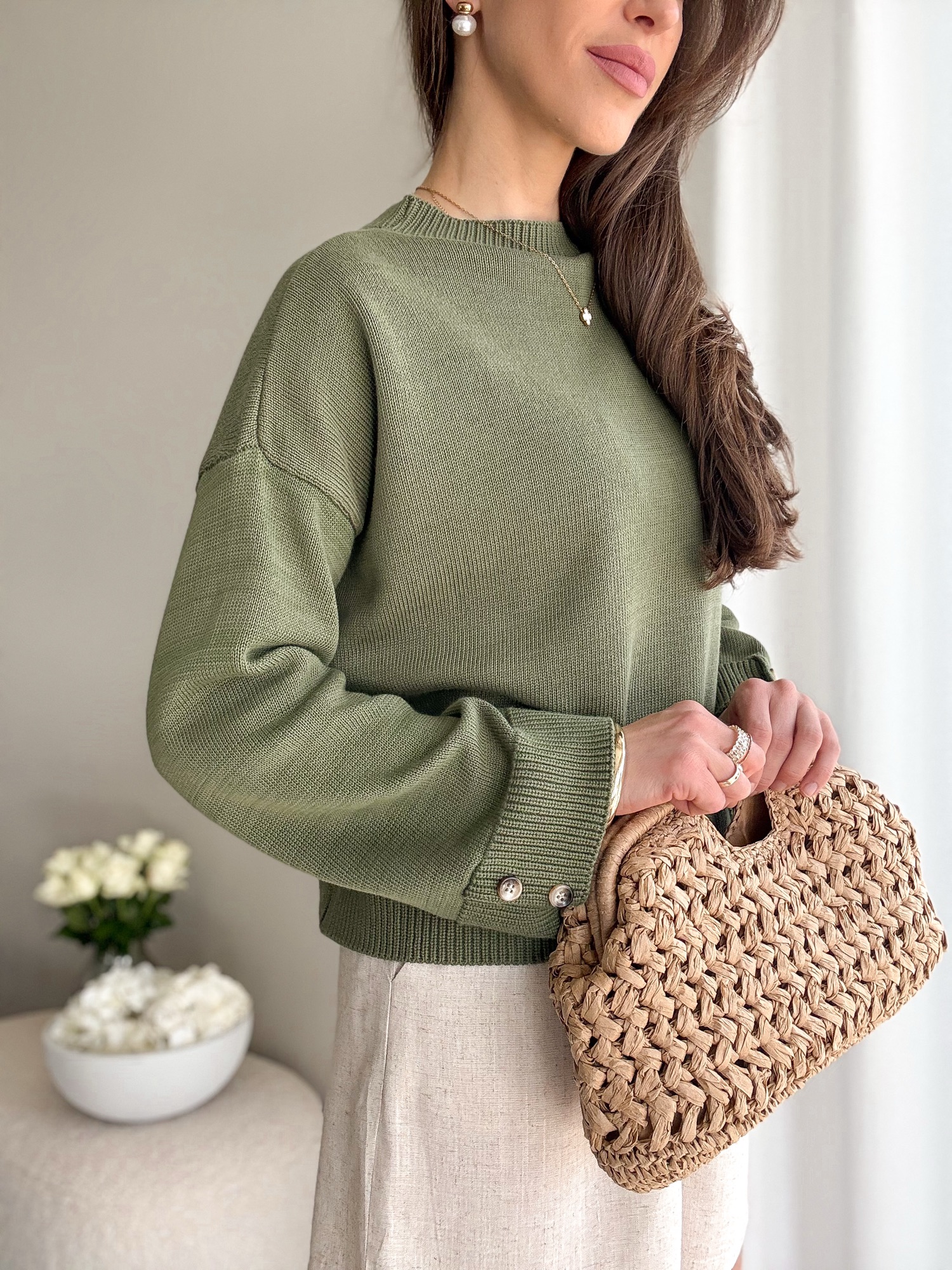 Klasyczny sweter o pudełkowym, luźniejszym fasonie.