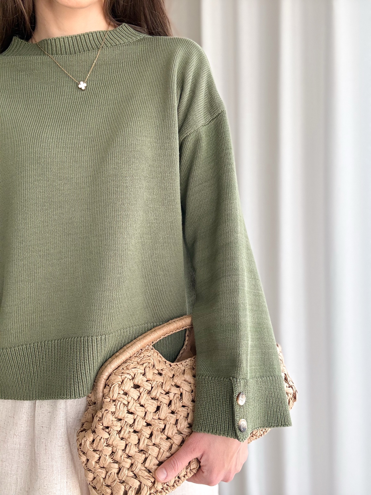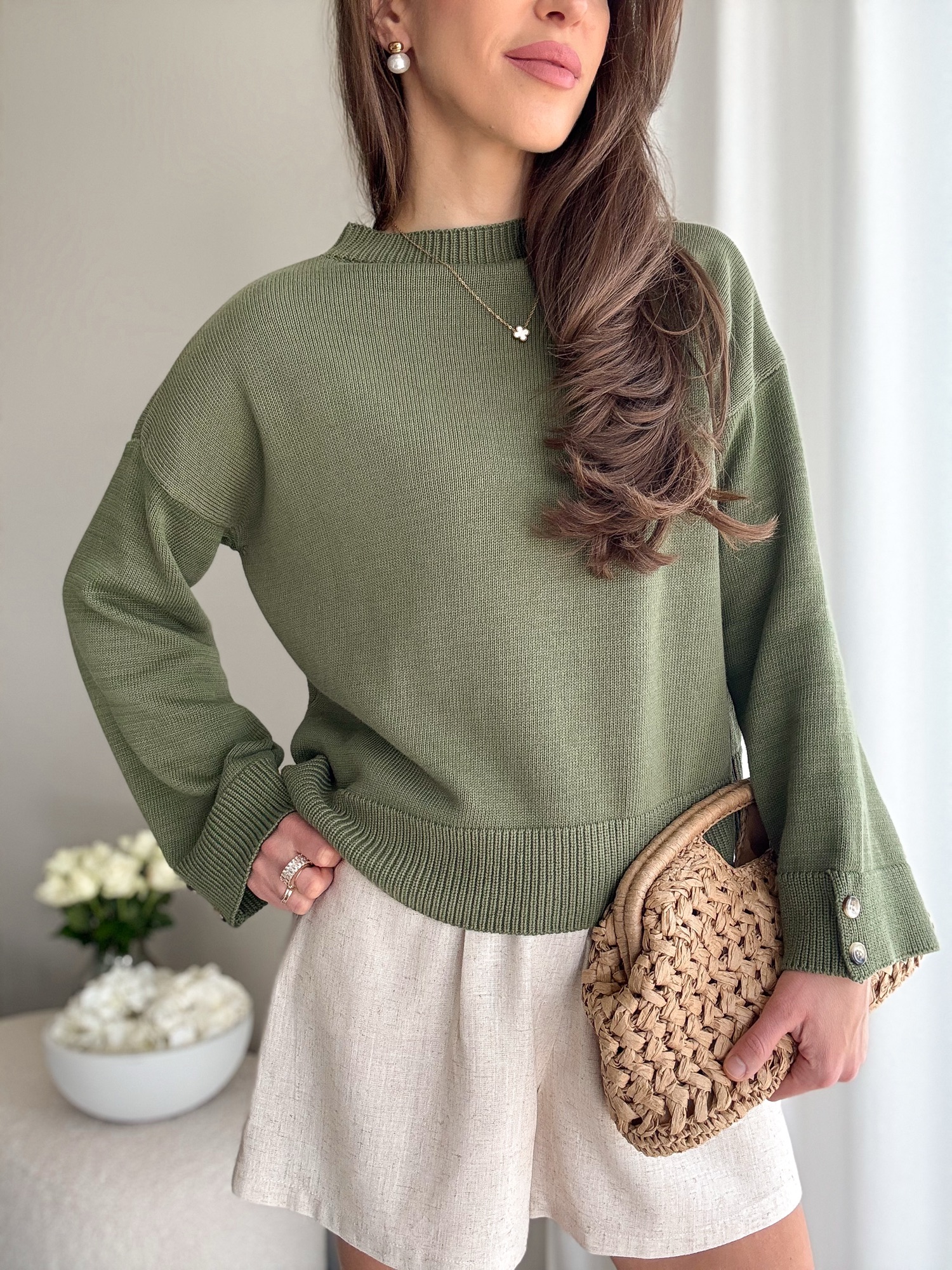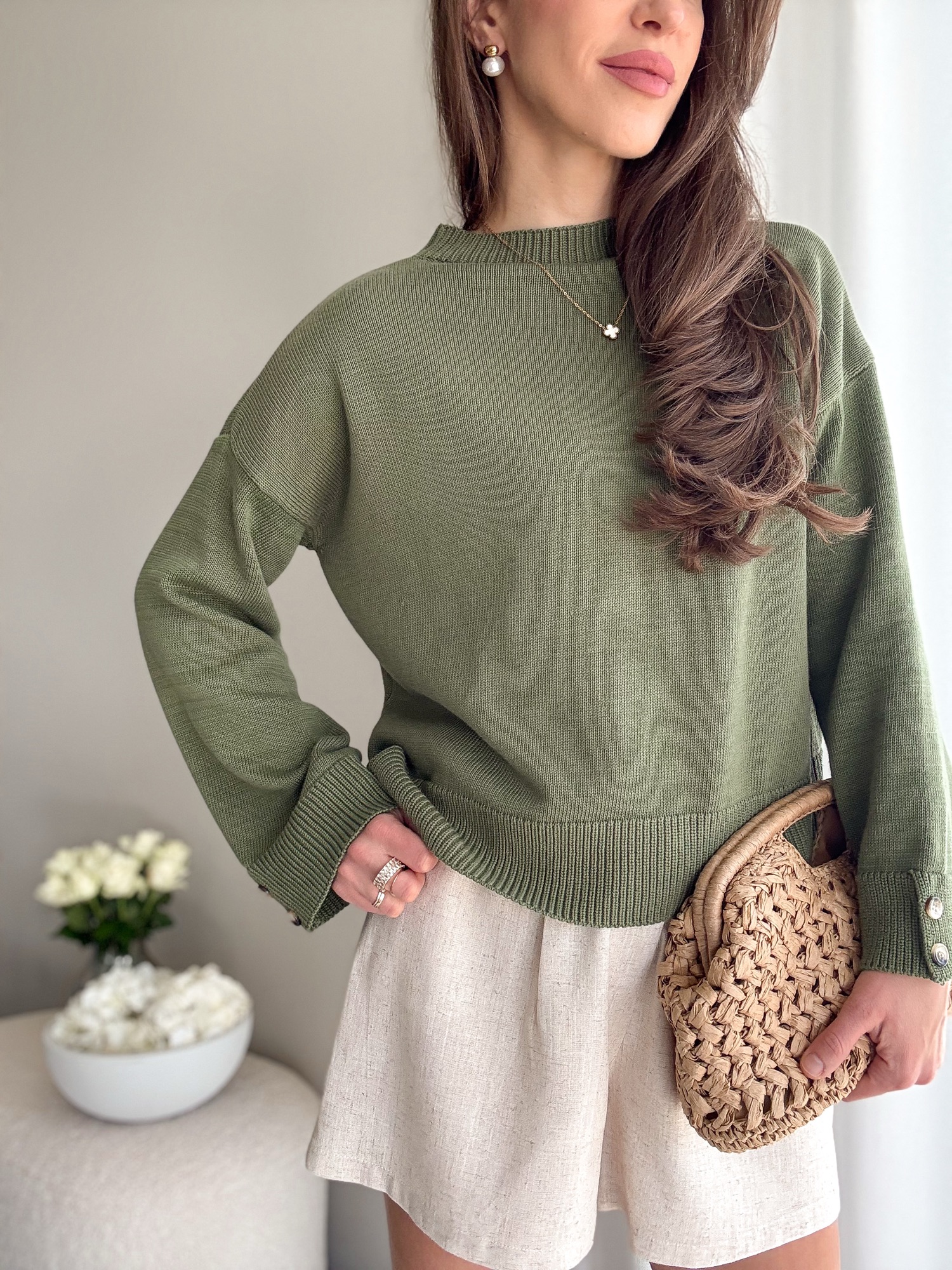Klasyczny sweter o pudełkowym, luźniejszym fasonie.
