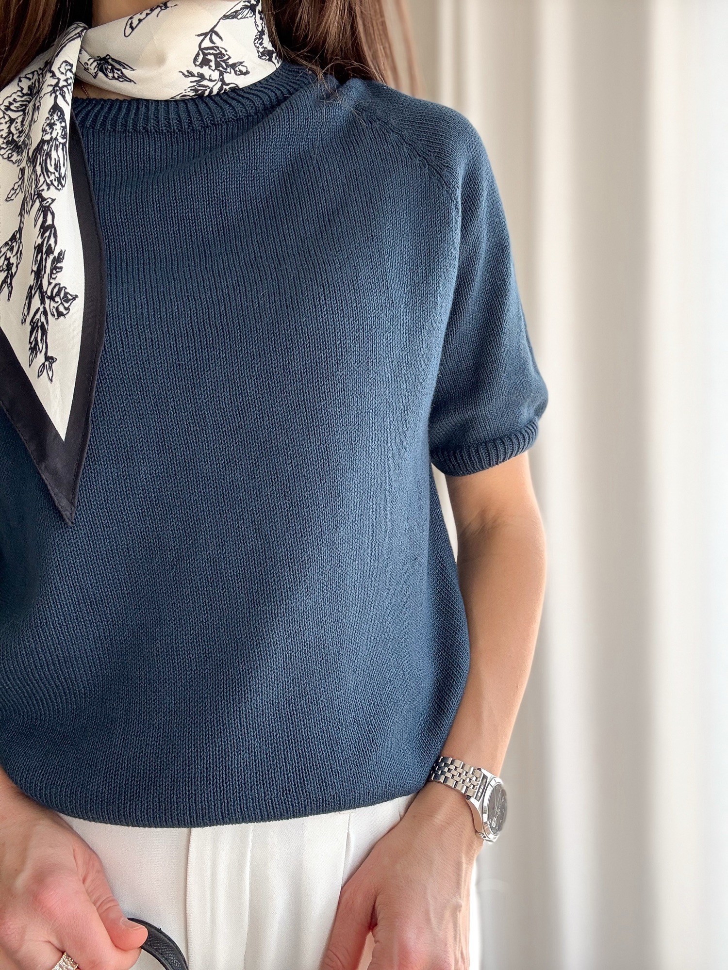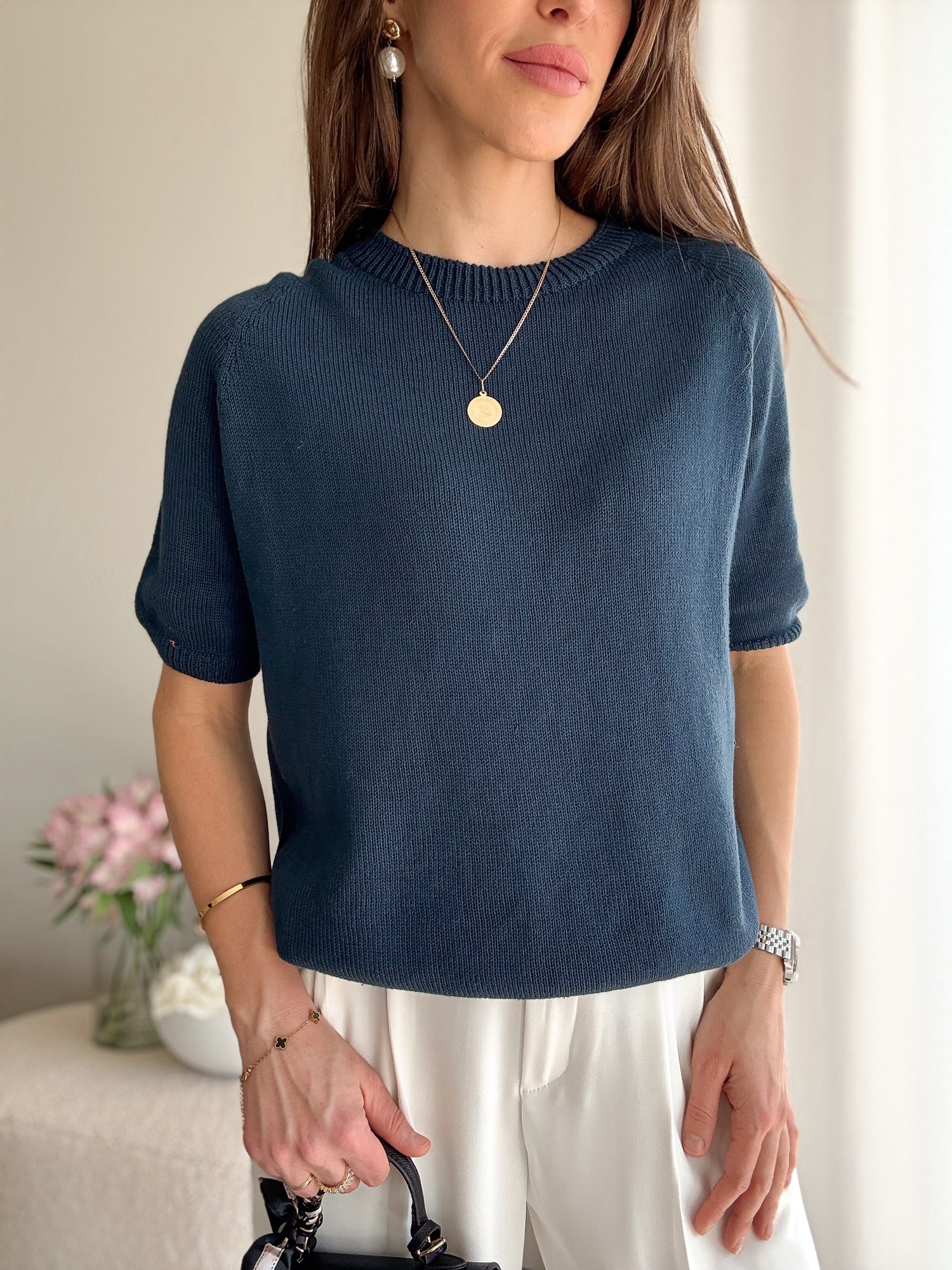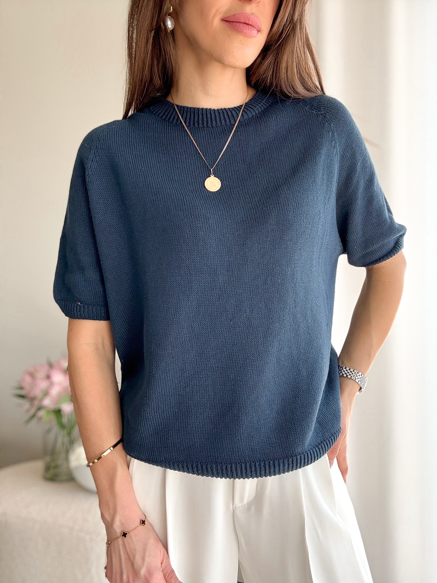 Basicowy, mięsisty sweter z okrągłym dekoltem i krótkim rękawem.