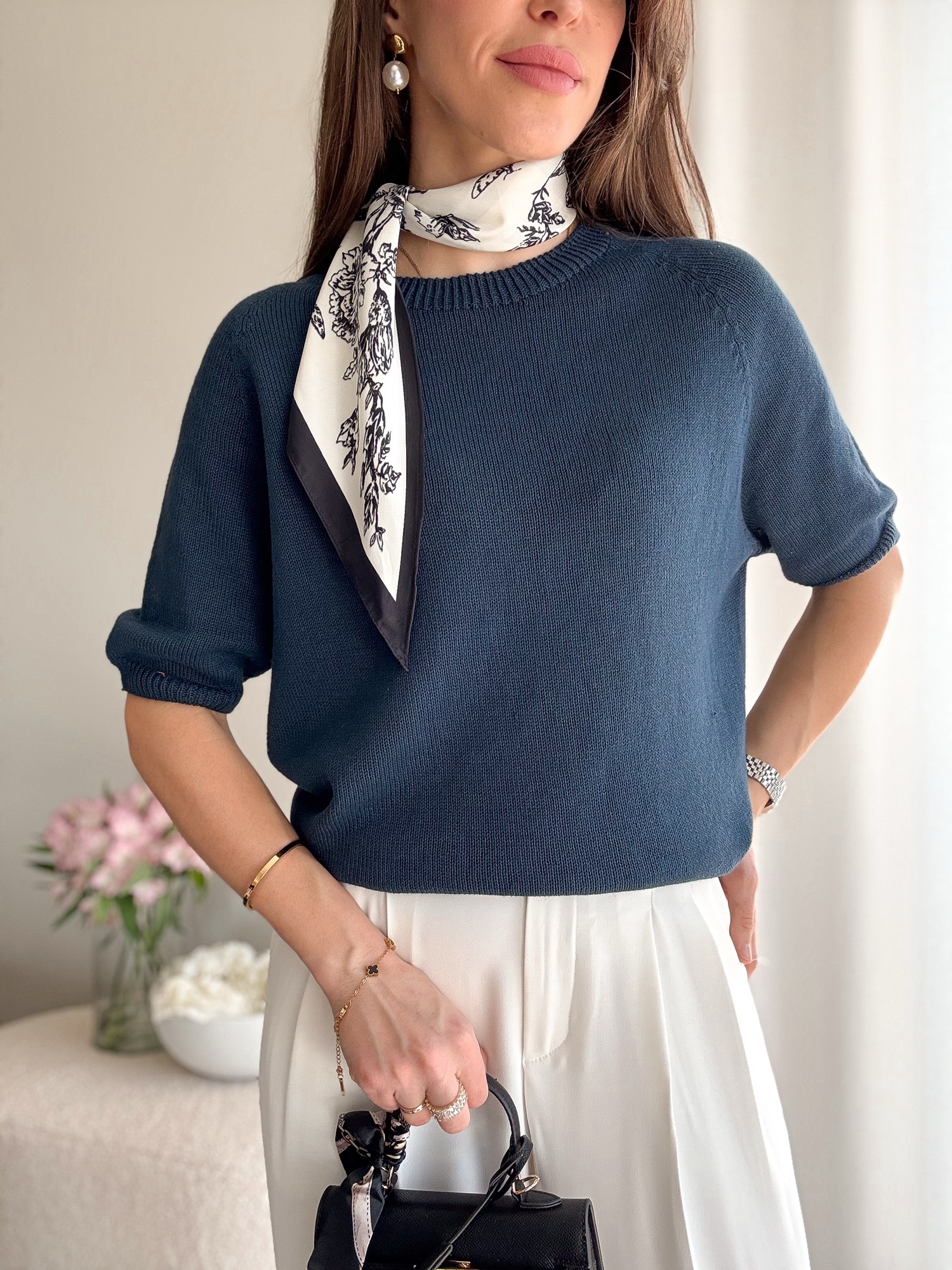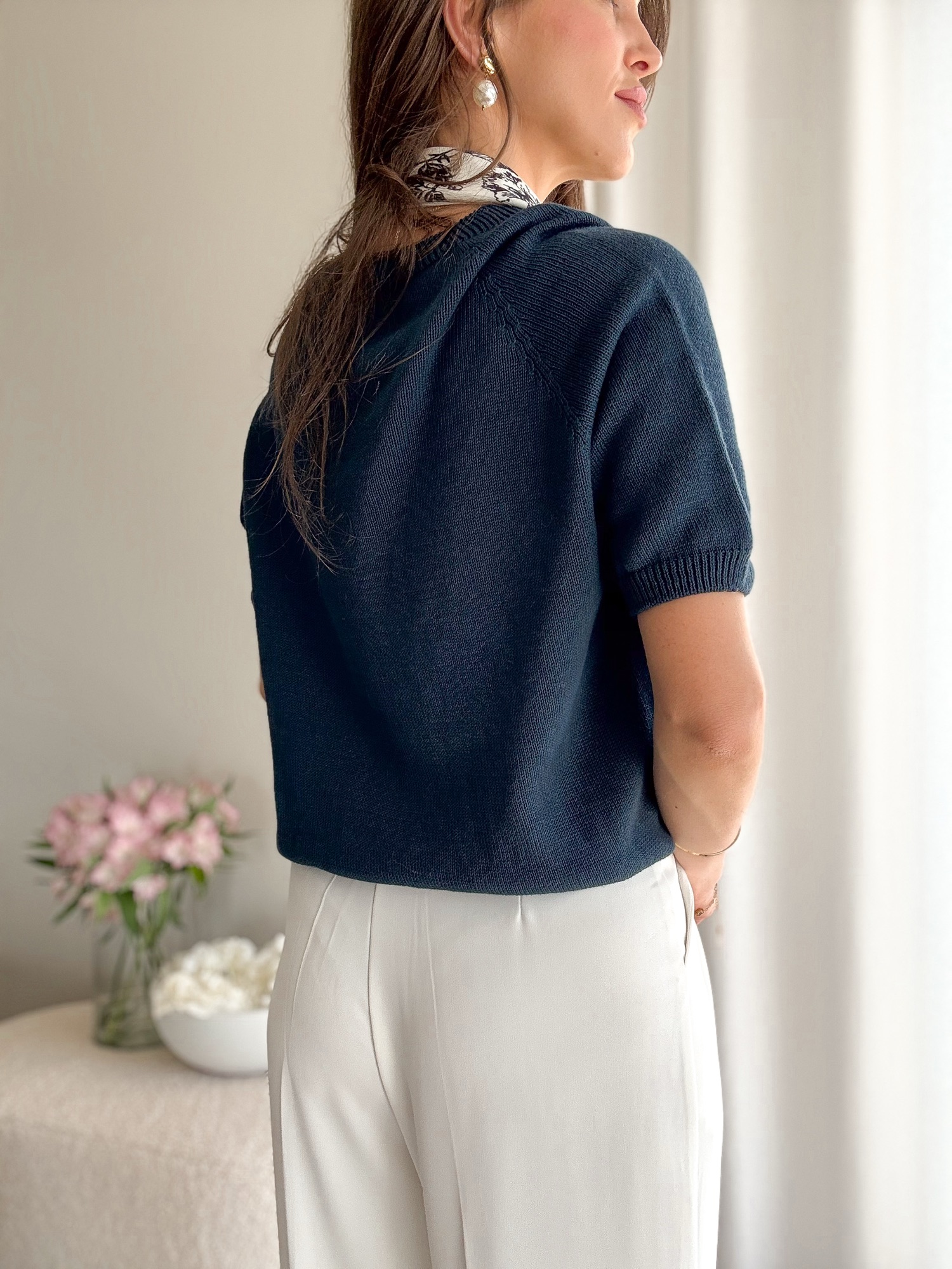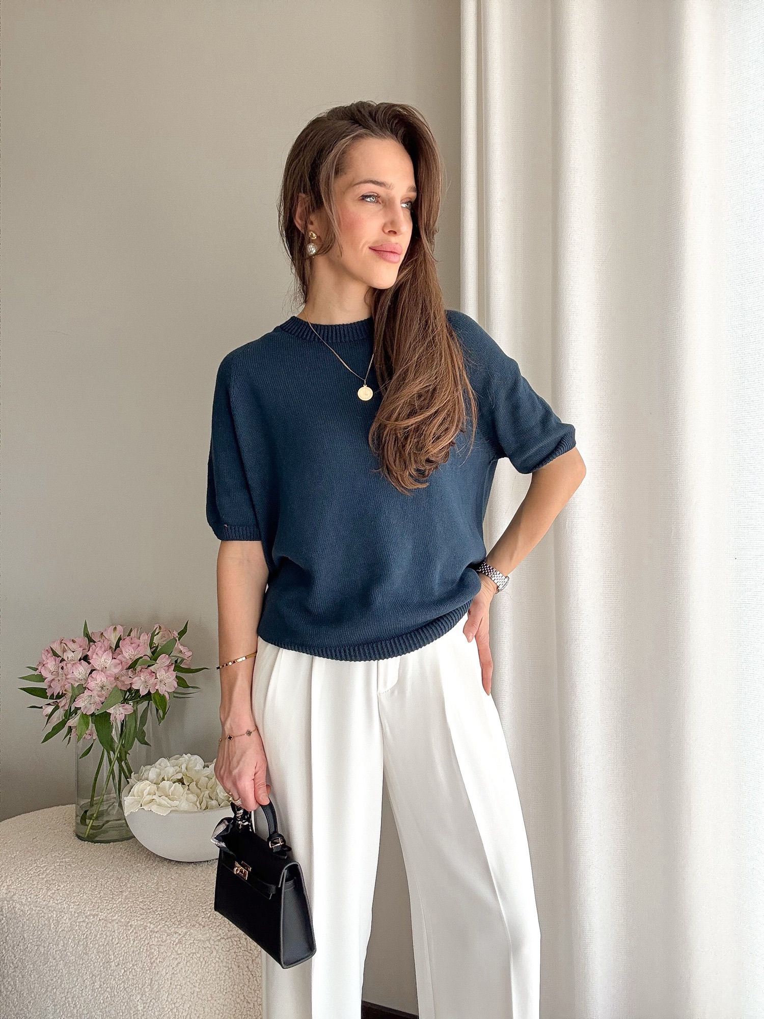 Basicowy, mięsisty sweter z okrągłym dekoltem i krótkim rękawem.