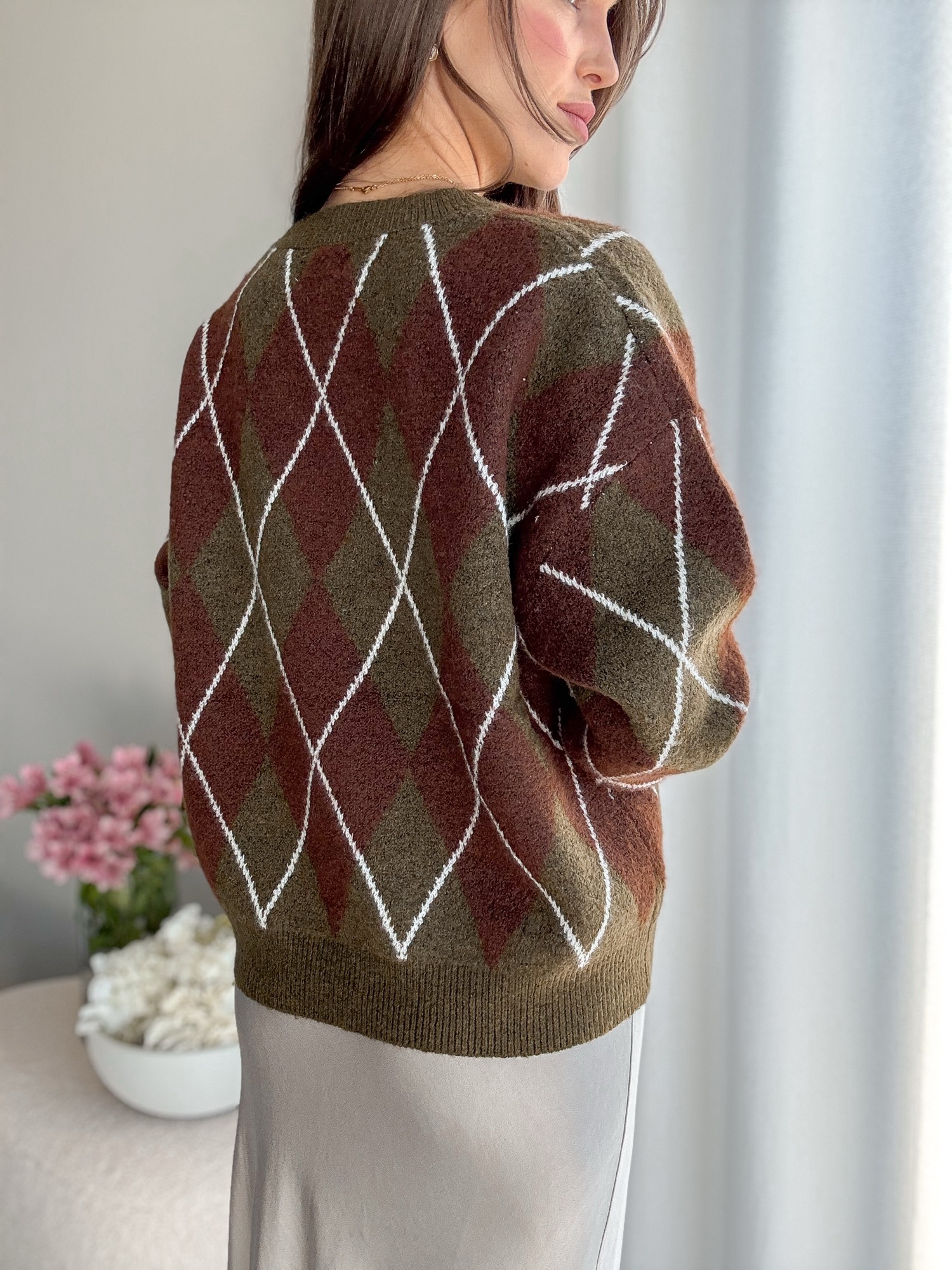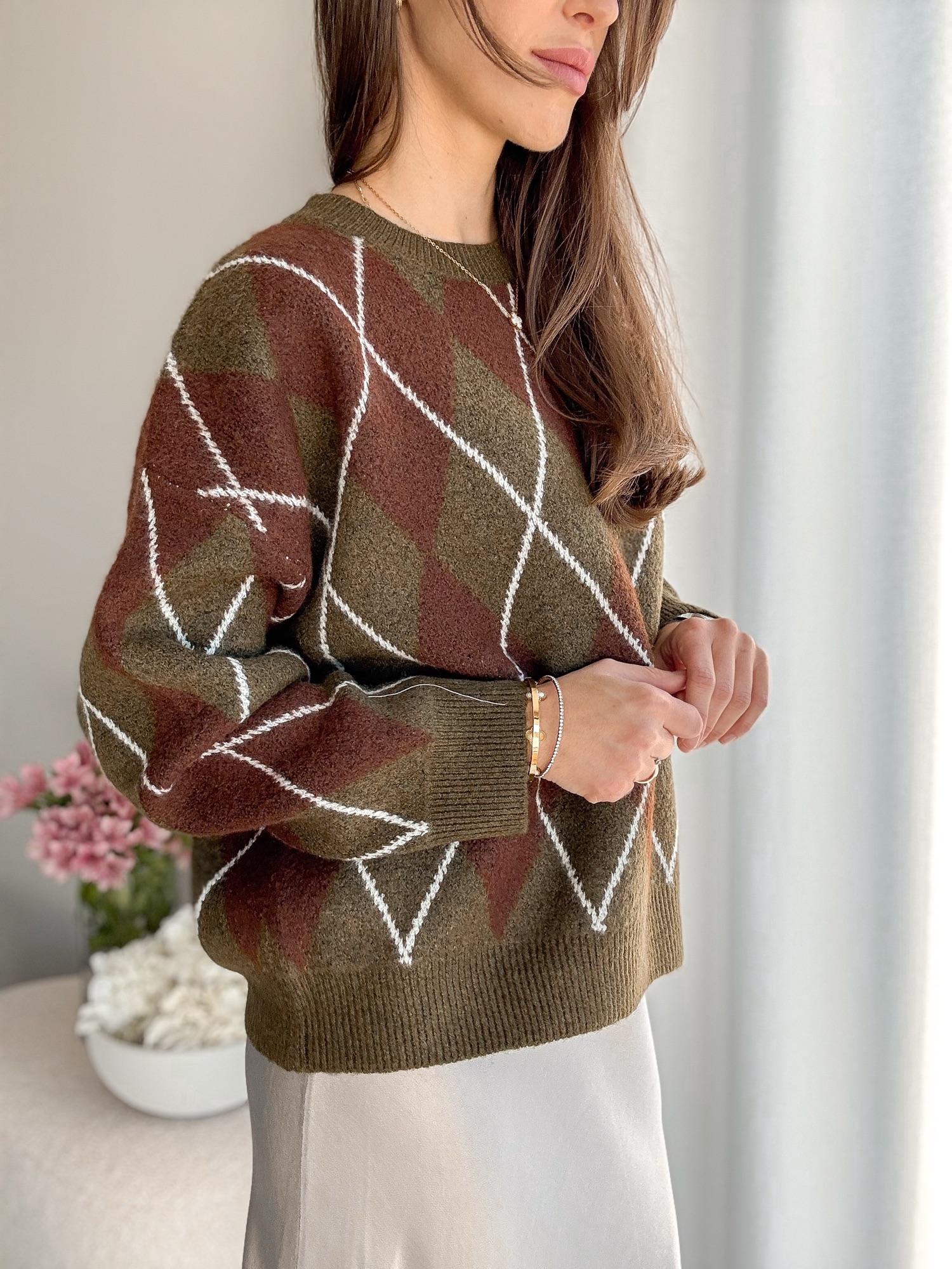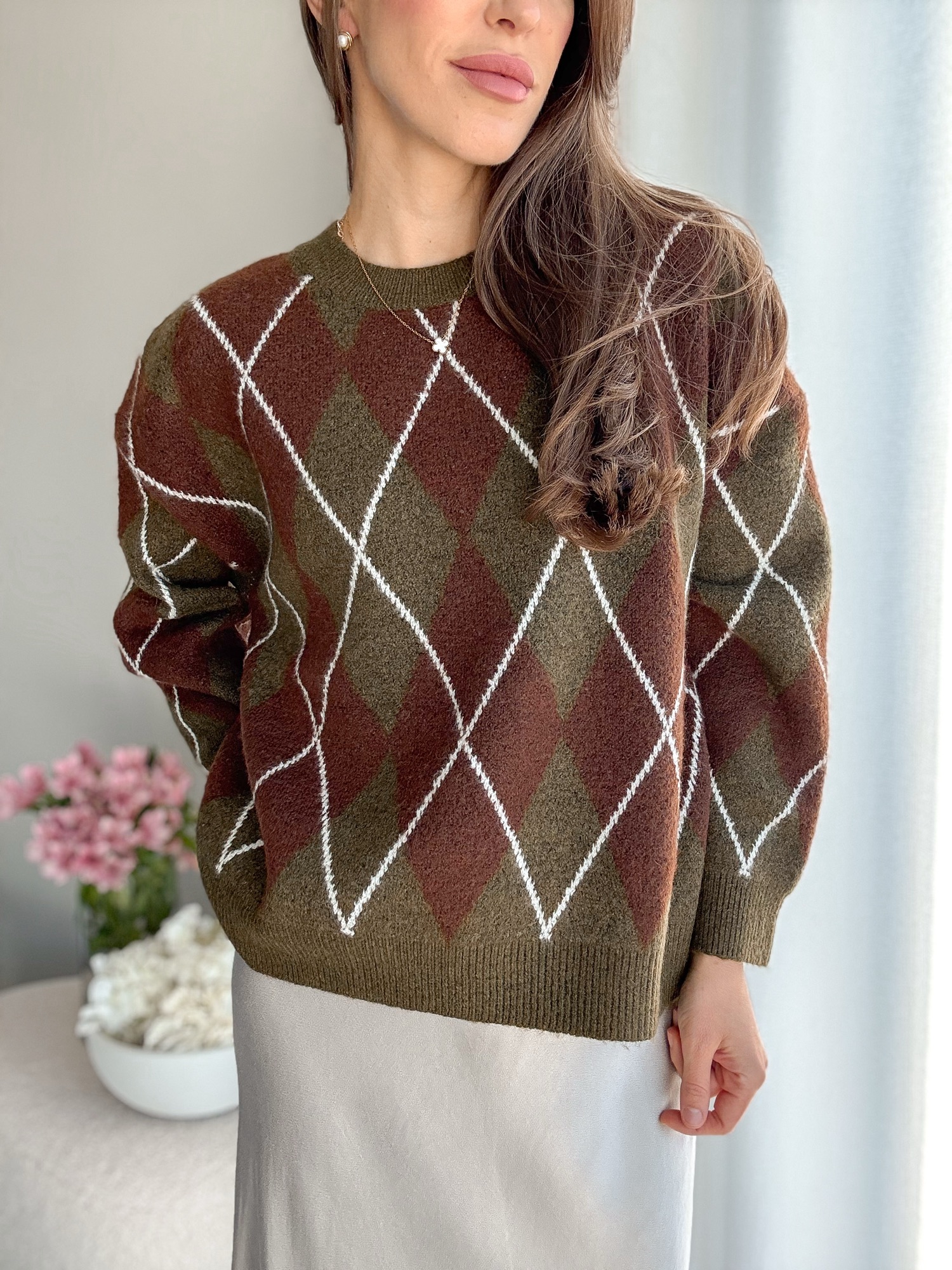 Luźny żakardowy sweter ze wzorem w romby z bardzo miękkiej dzianiny.