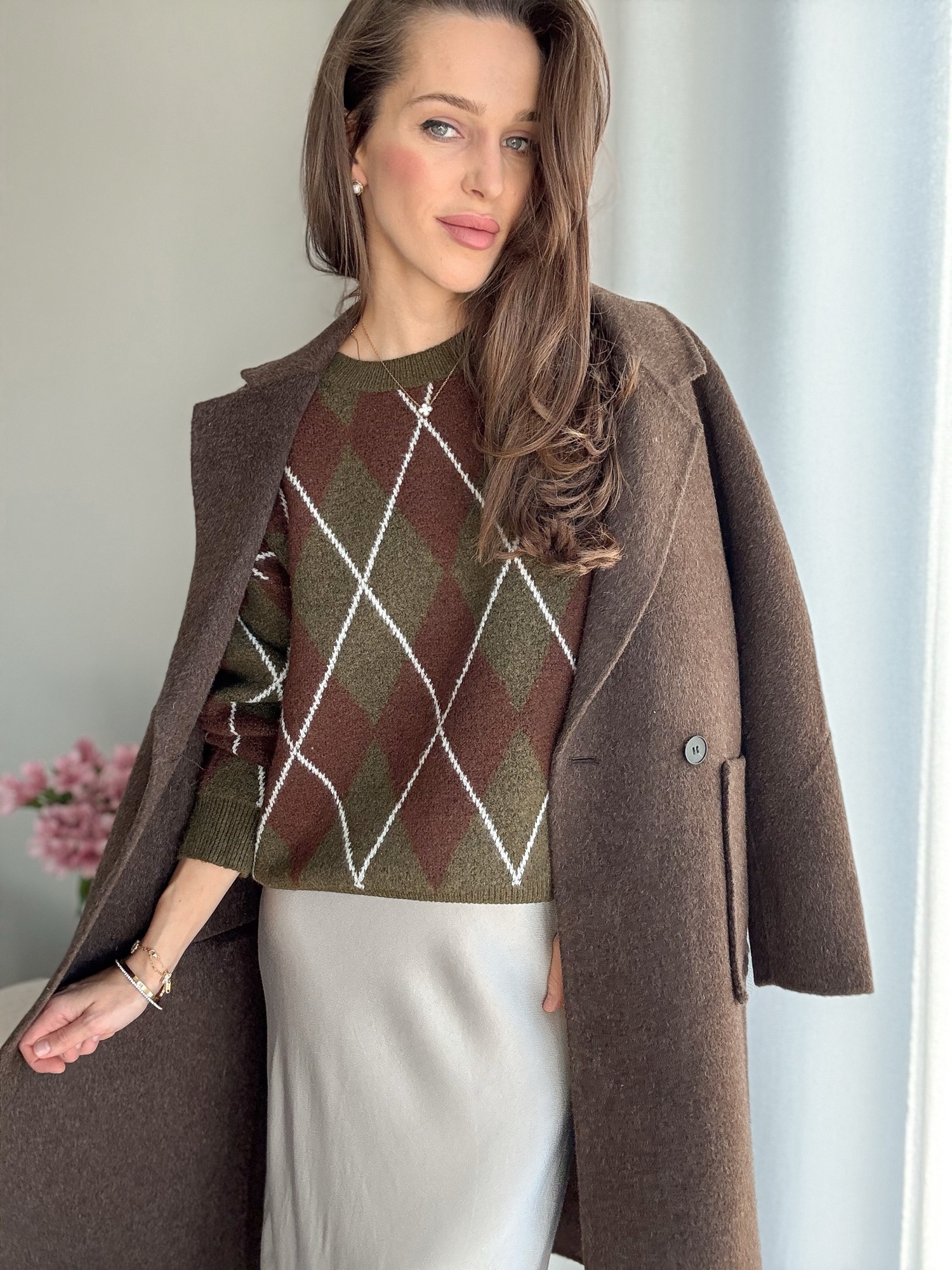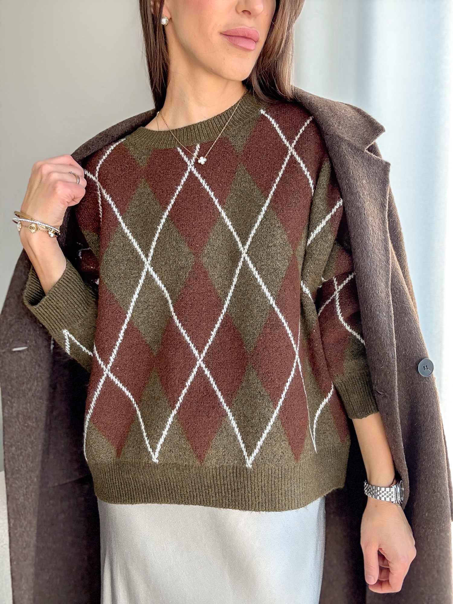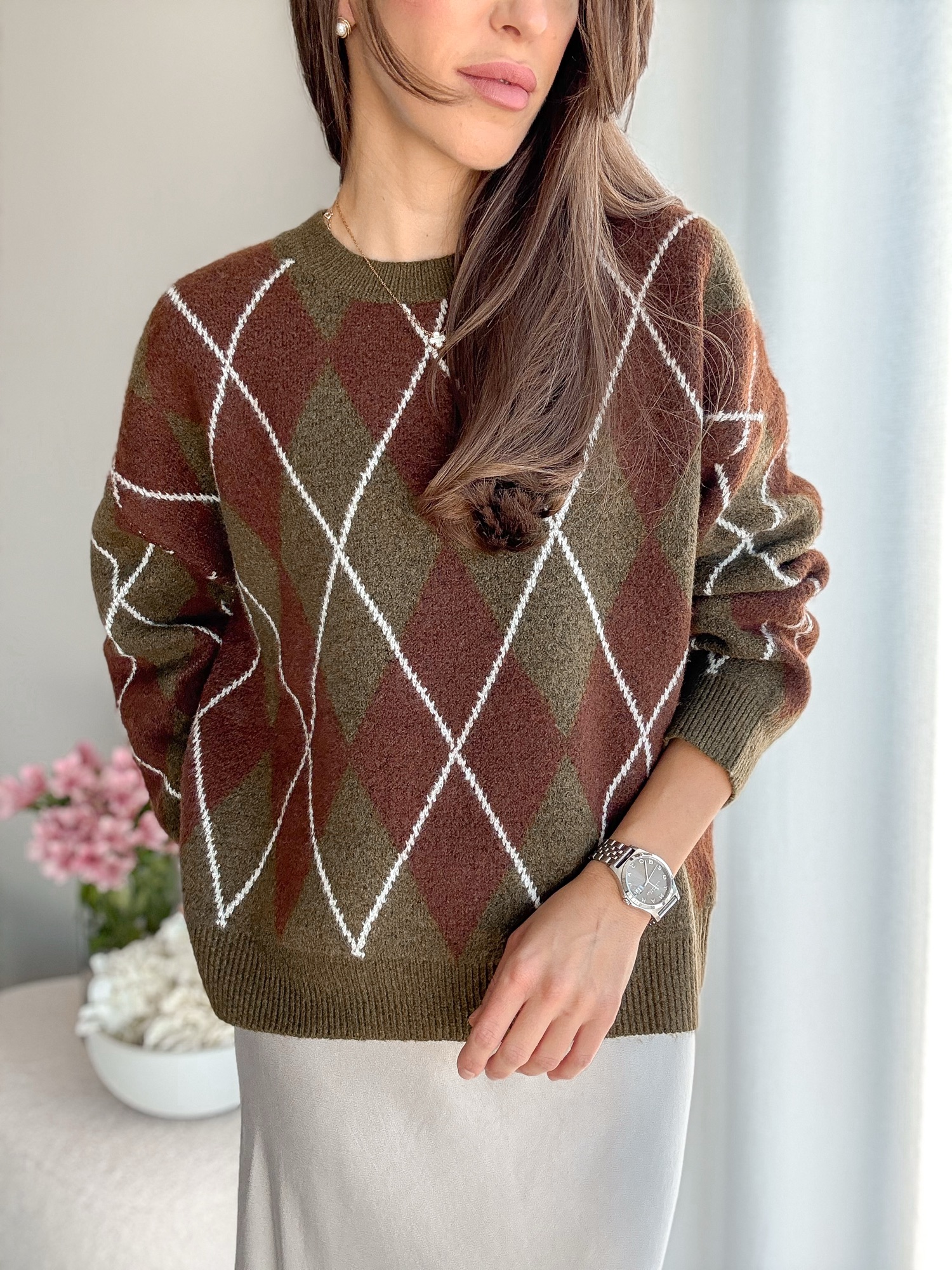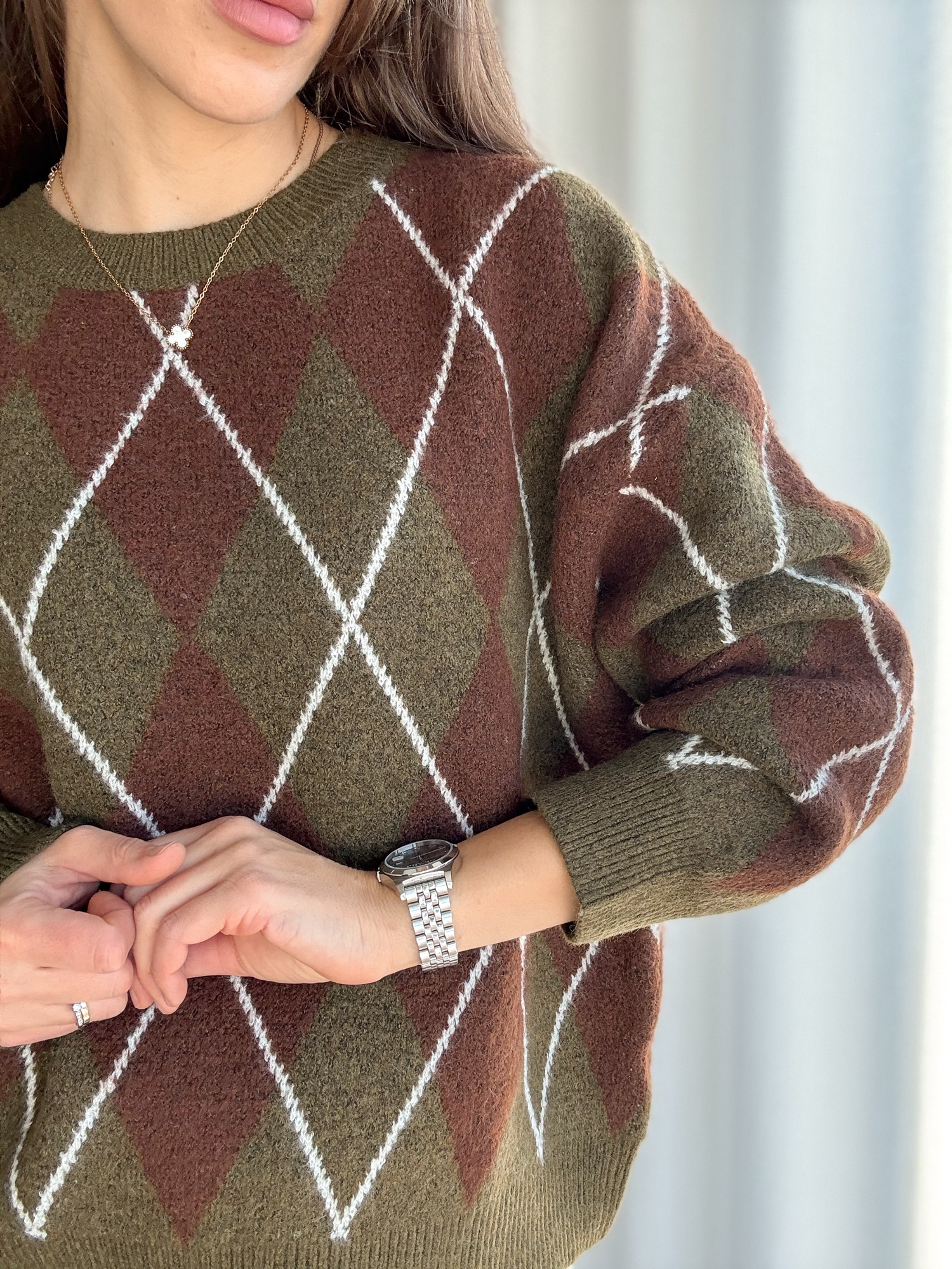 Luźny żakardowy sweter ze wzorem w romby z bardzo miękkiej dzianiny.