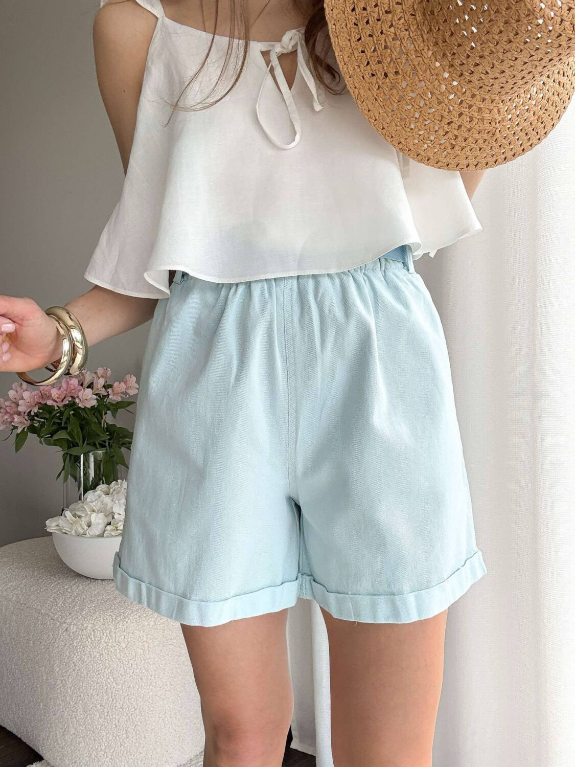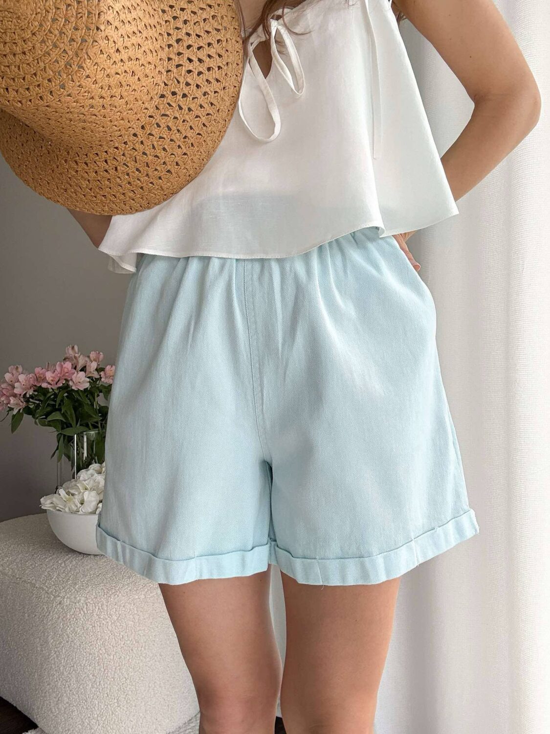 Szorty z szerokimi nogawkami i kieszeniami po bokach.