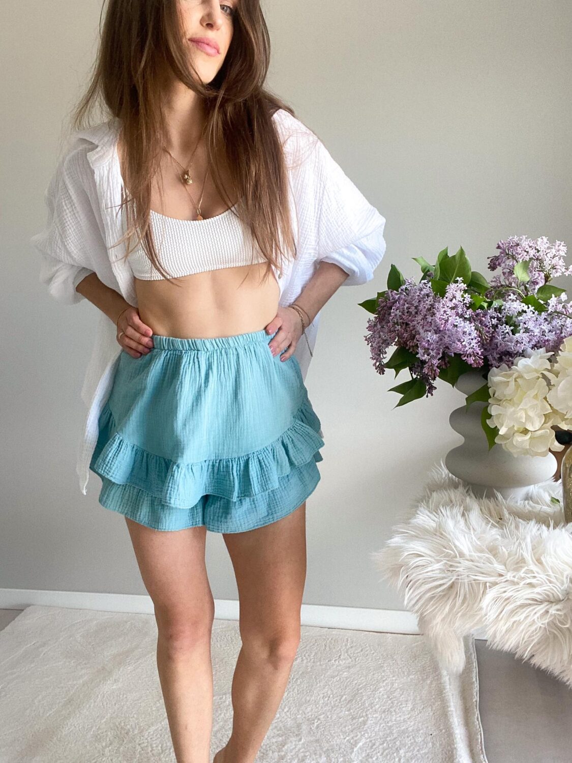 Muślinowe szorty Sicily zakończone falbanką. Dodatkowa wierzchnia falbana daje efekt spódniczki.