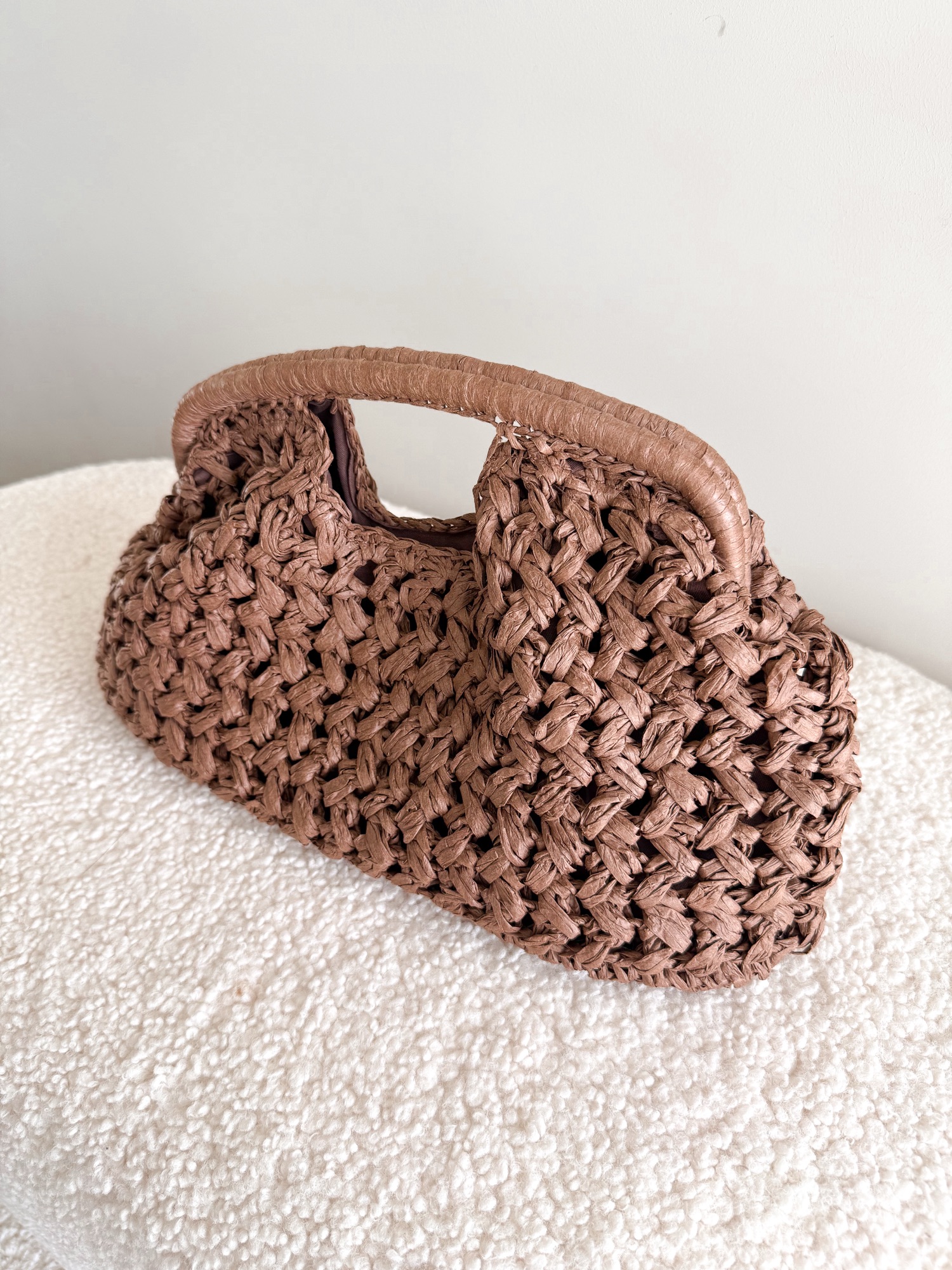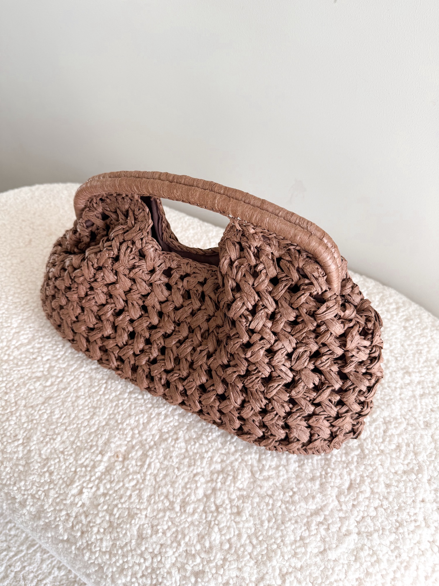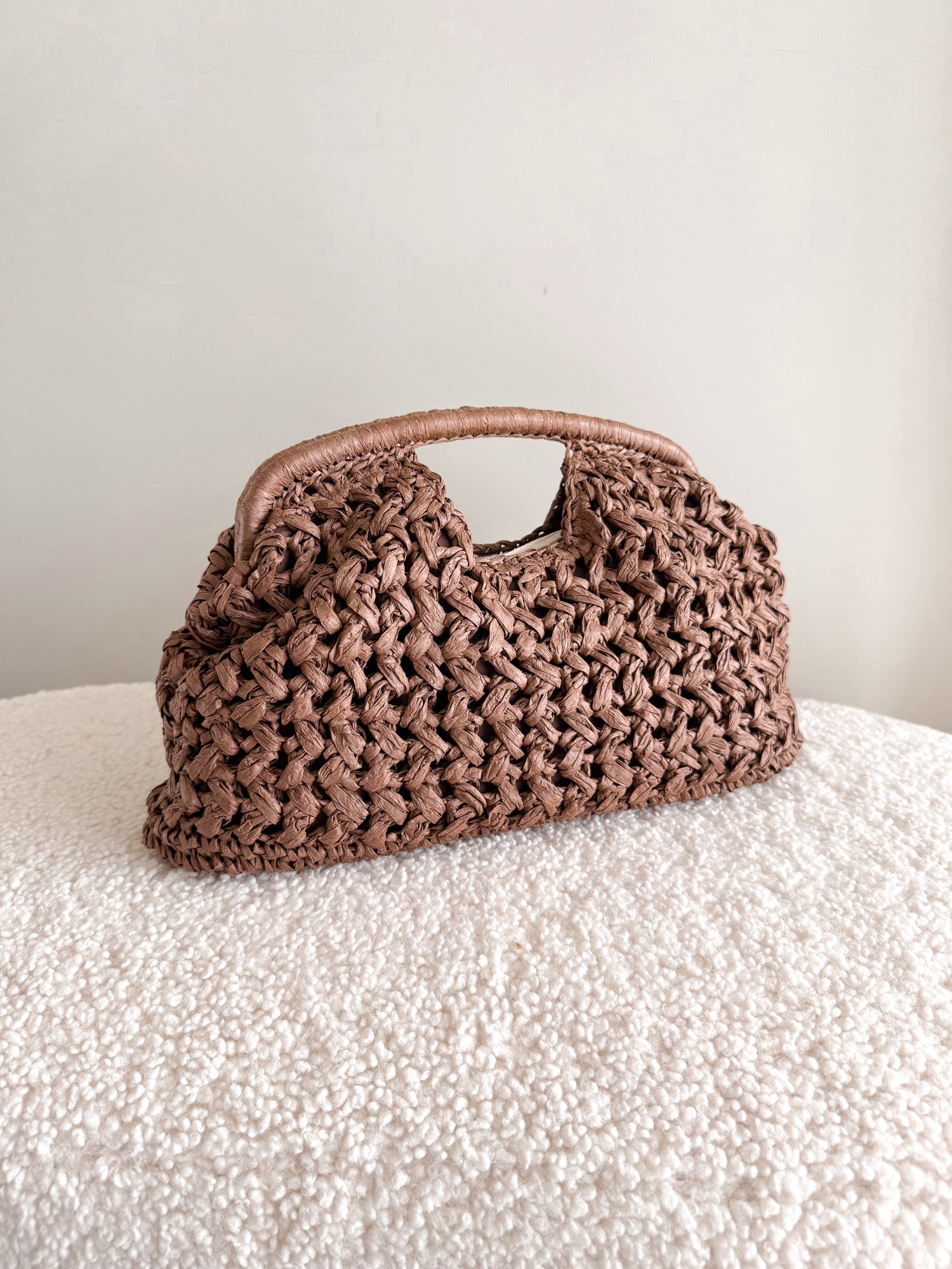 Pleciona torebka ze sztywną rączką zapinana na złoty zatrzask.