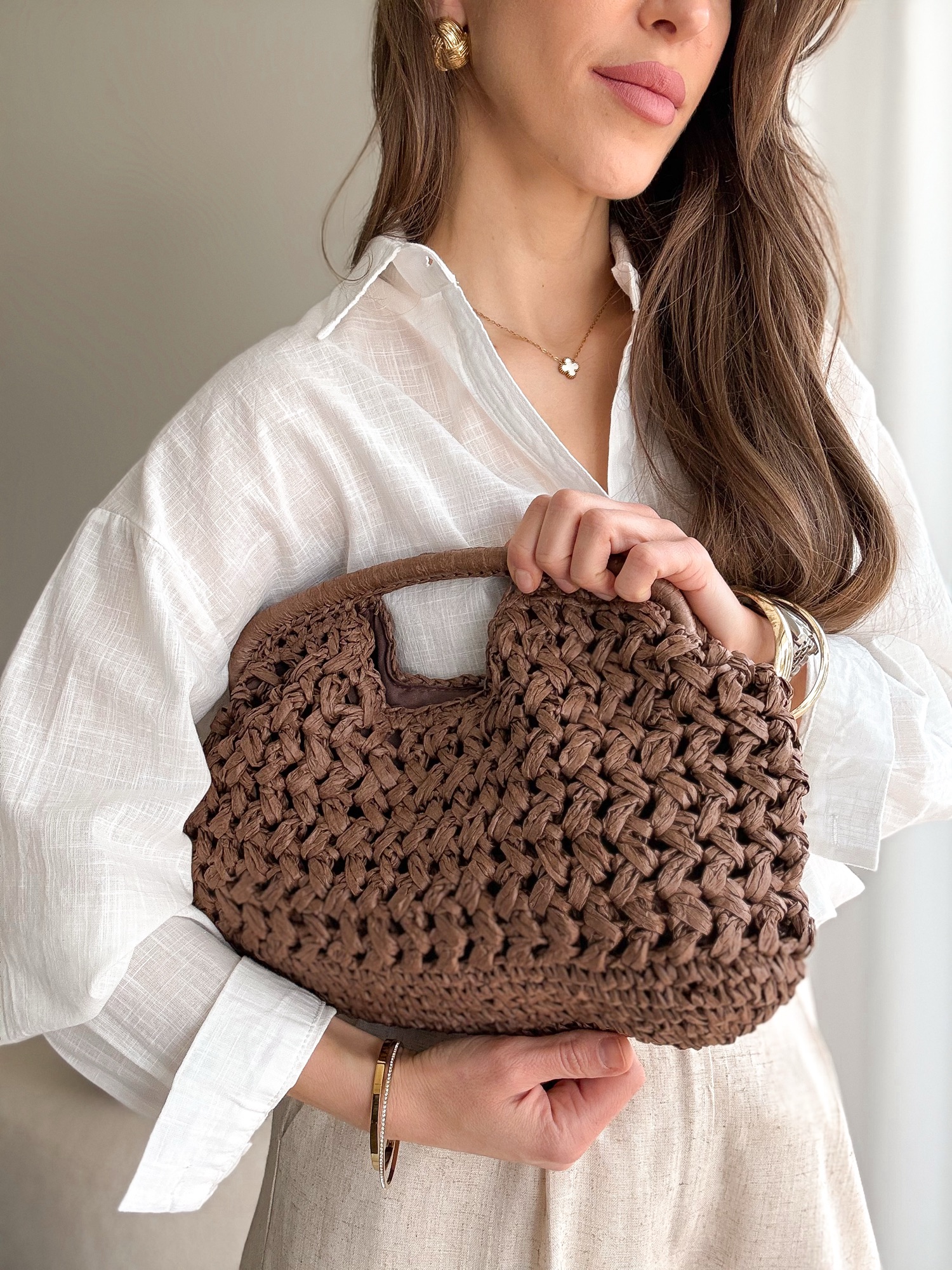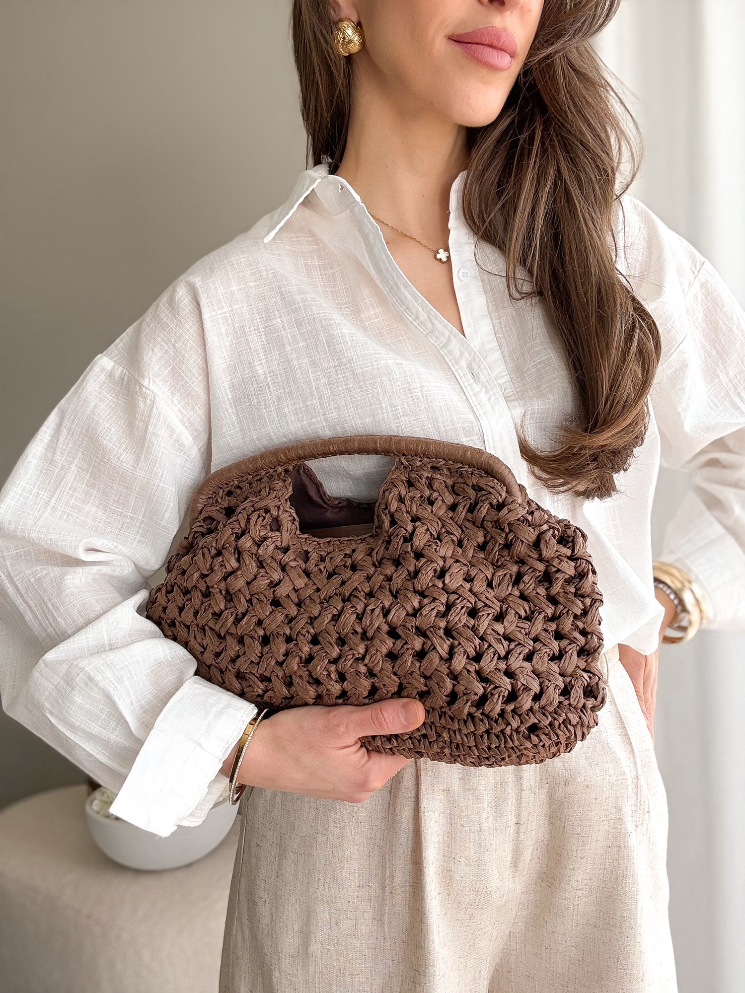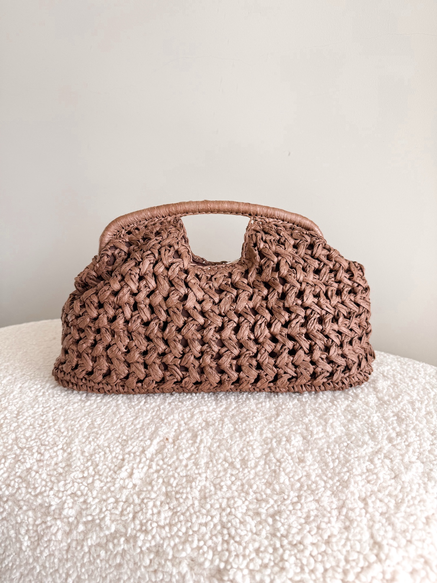 Pleciona torebka ze sztywną rączką zapinana na złoty zatrzask.
